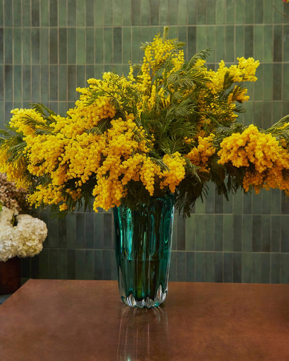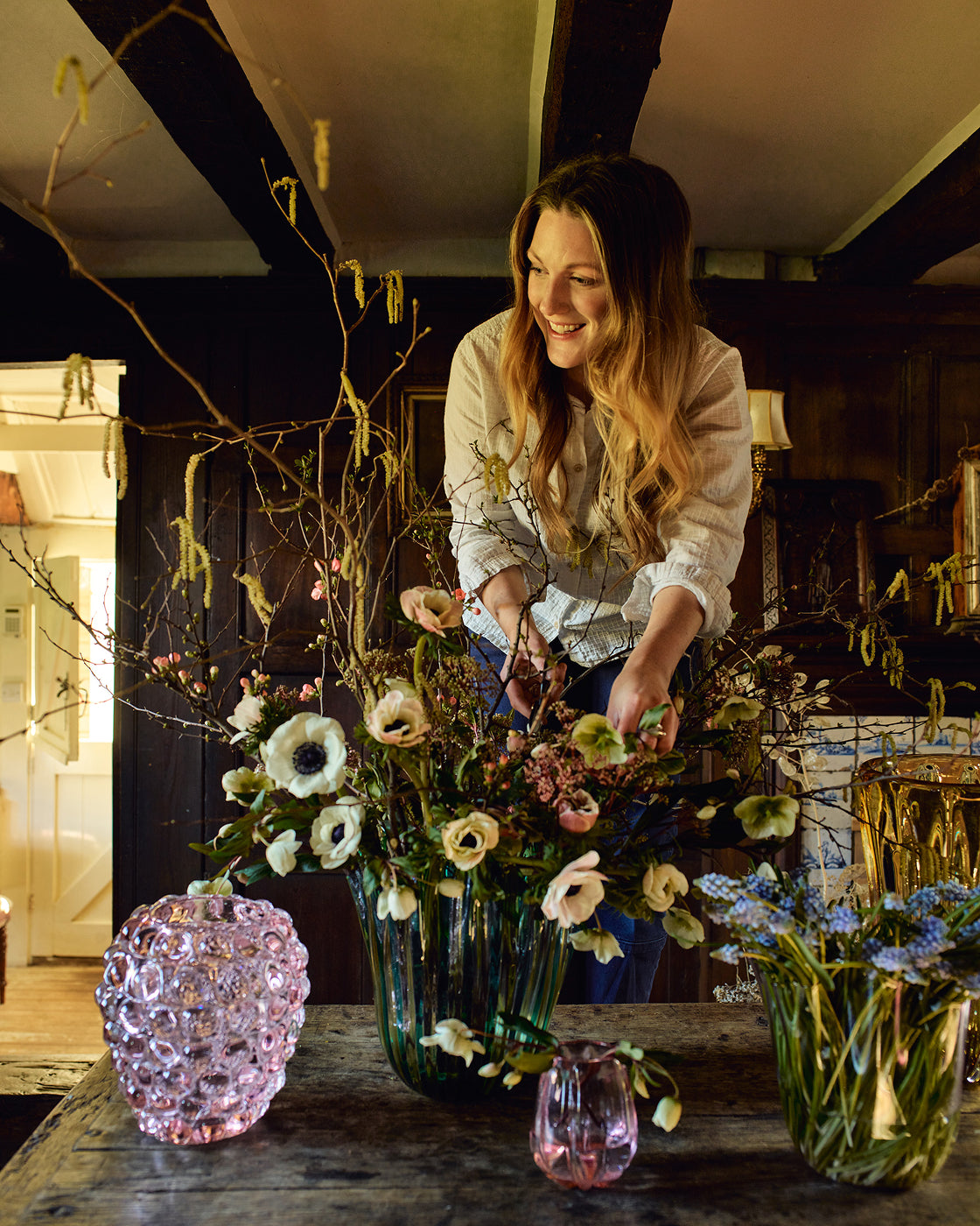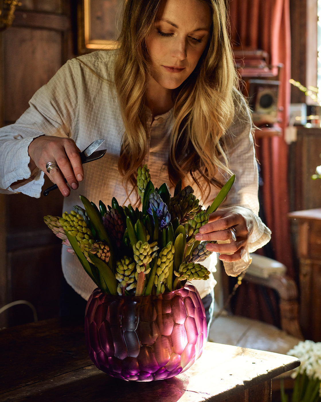 "When it comes to flower arranging, I advise observing how plants look in a garden. When they are cut for commerce, they are all cut to the same height, all uniform looking, which isn’t how they grow in nature. You want to make them look more natural, so start by snipping a few of the stems at different heights. This immediately creates a more natural feel and forces the eye to move up and down through the different heights.”