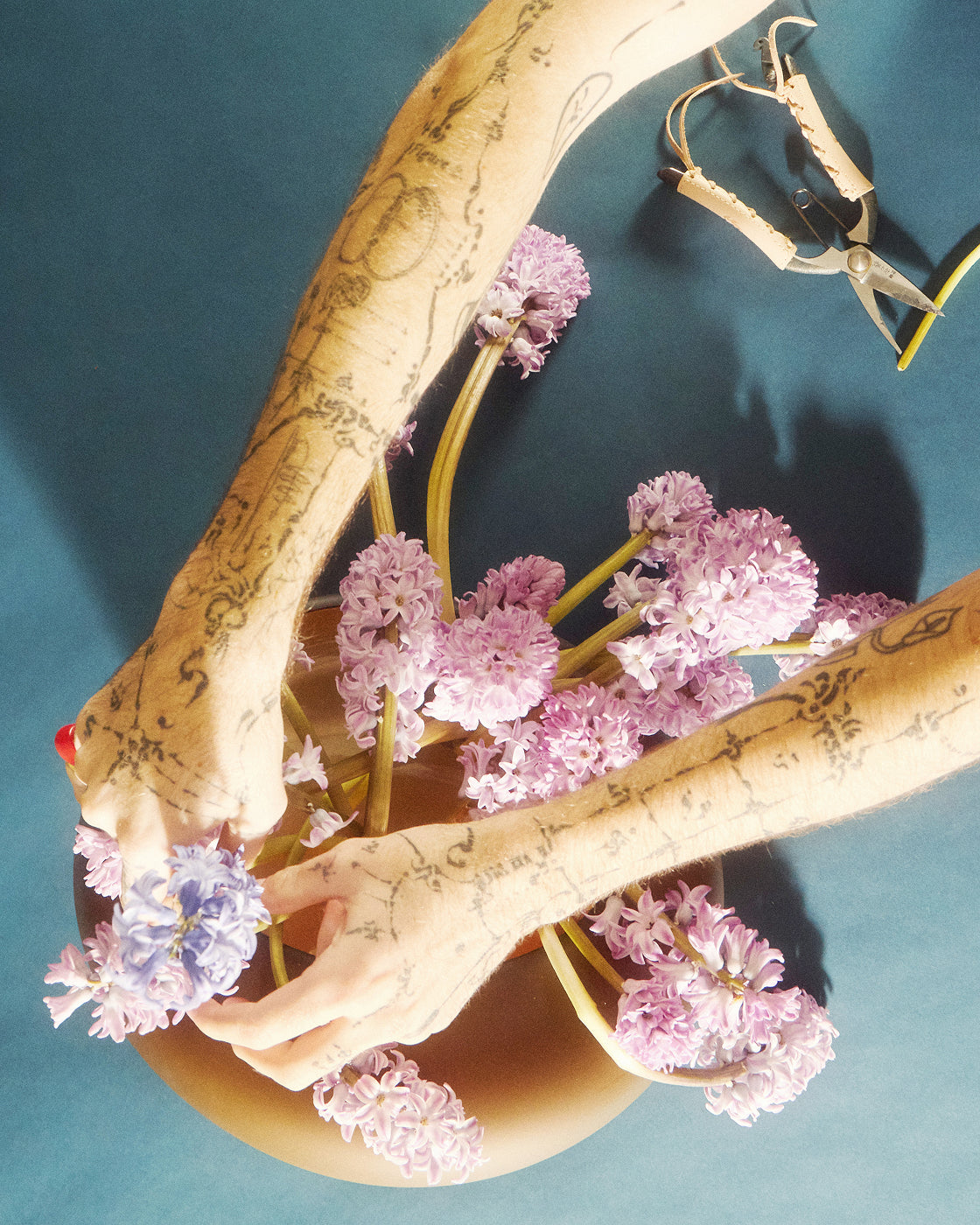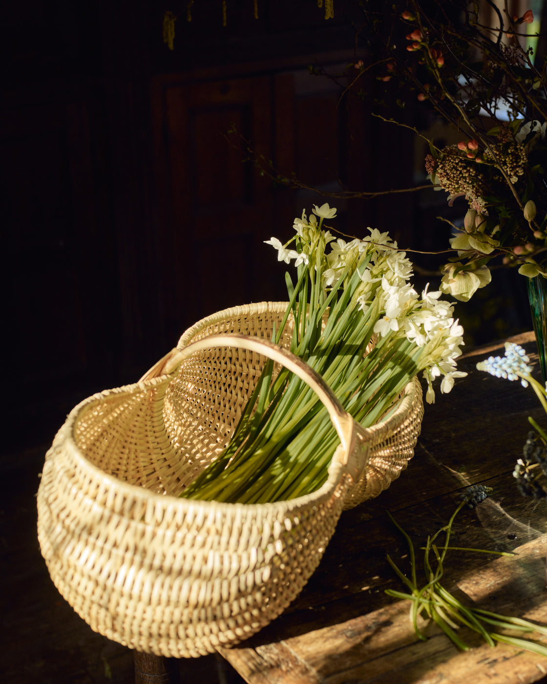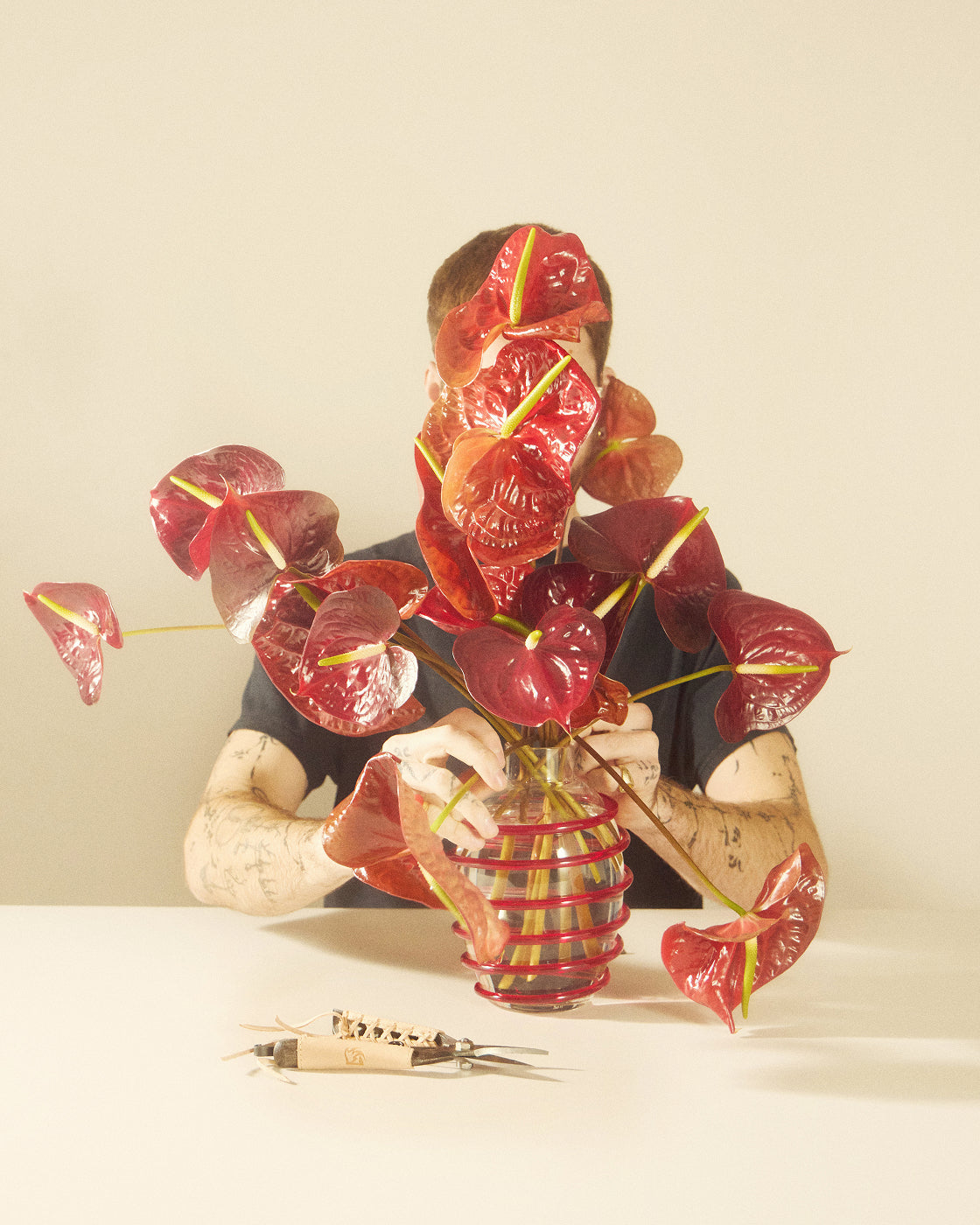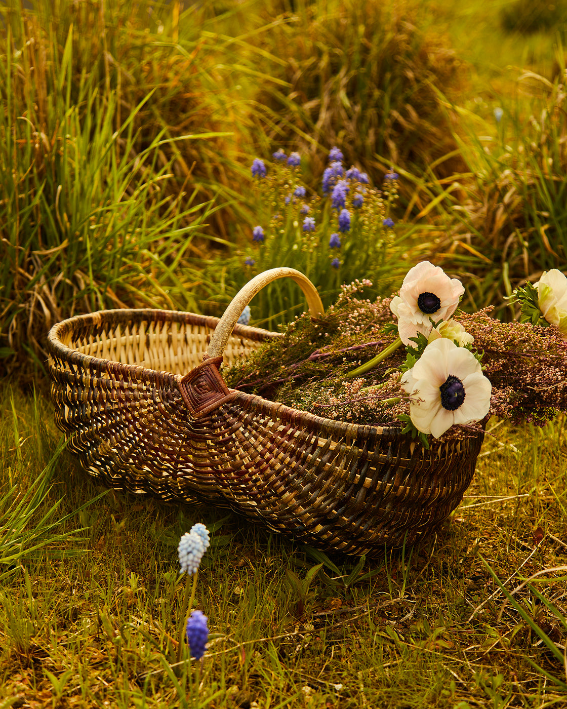 "When it comes to flower arranging, I advise observing how plants look in a garden. When they are cut for commerce, they are all cut to the same height, all uniform looking, which isn’t how they grow in nature. You want to make them look more natural, so start by snipping a few of the stems at different heights. This immediately creates a more natural feel and forces the eye to move up and down through the different heights.”