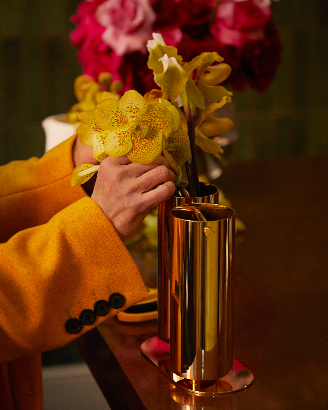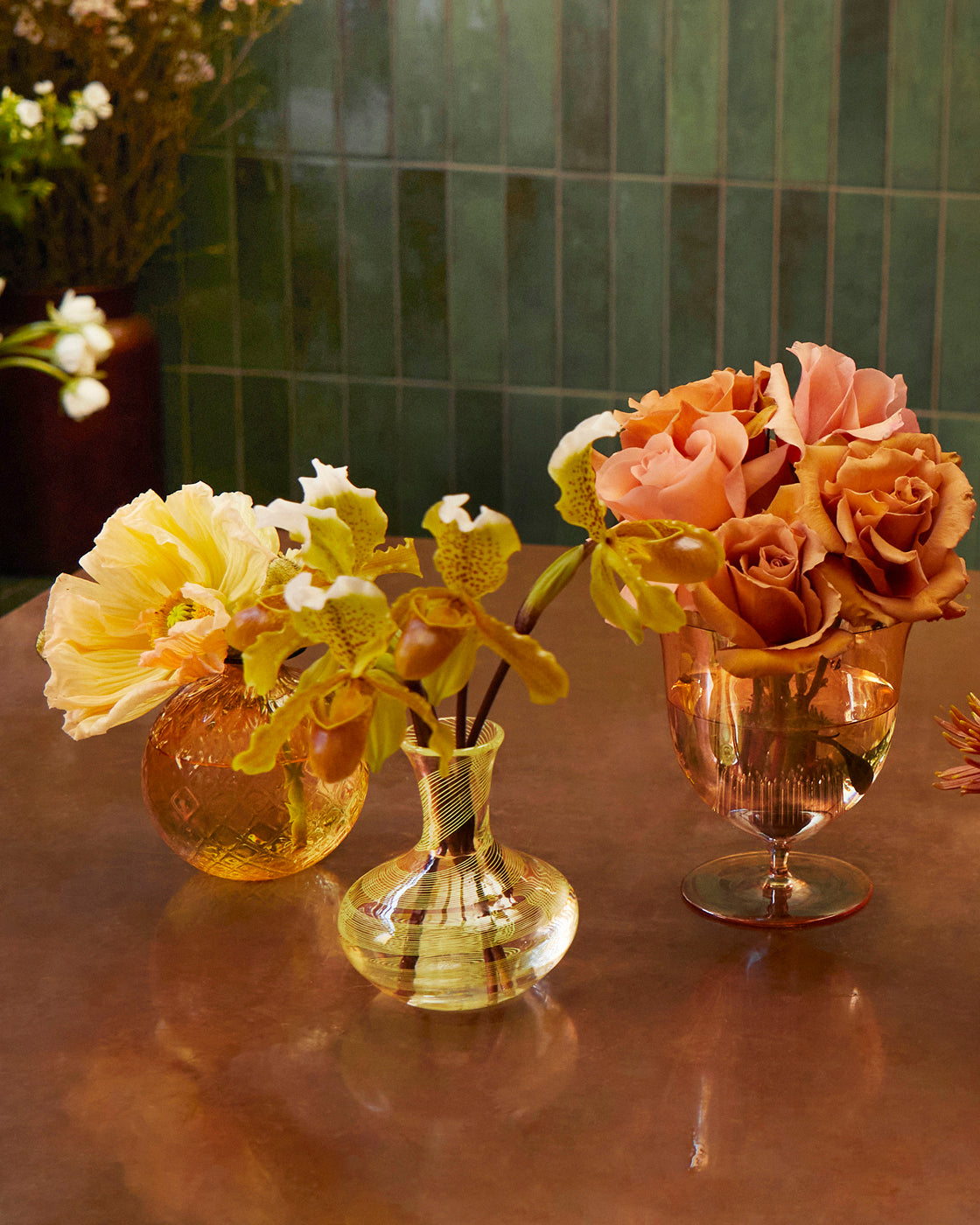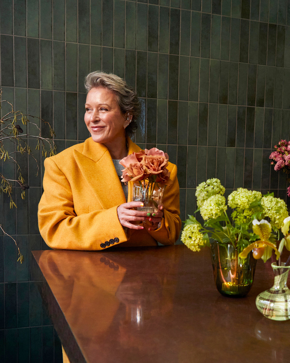 “It’s nice to have a series of different bud vases, with different shapes and styles in the same tone. If you have all the same style of bud vase, you can keep the flowers different, but when the vases are different, keep to one type of flower, otherwise it can start to look messy. The first thing is to think about how they are arranged on the table. If they’re going to be in the center of the table, make sure they’re not too high so you can see the person opposite.”