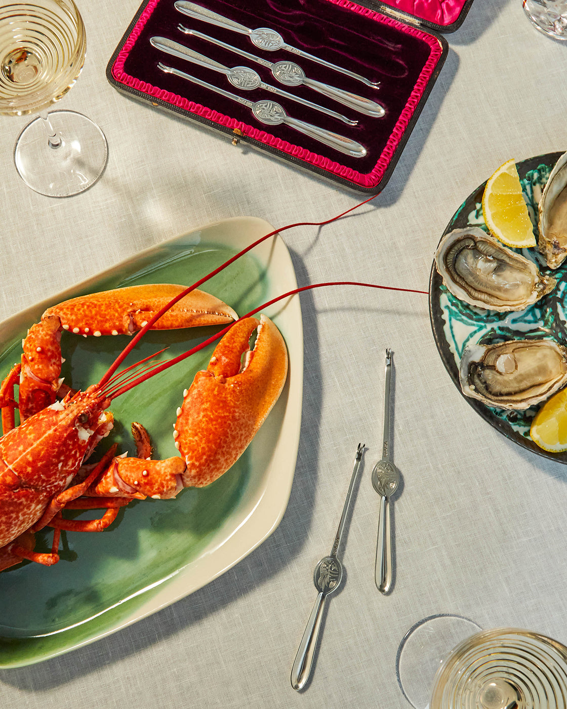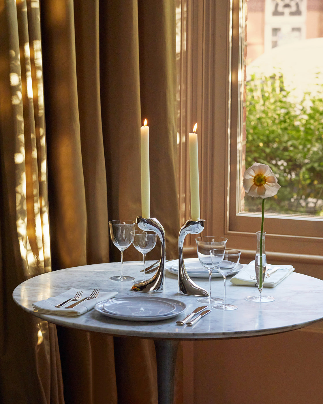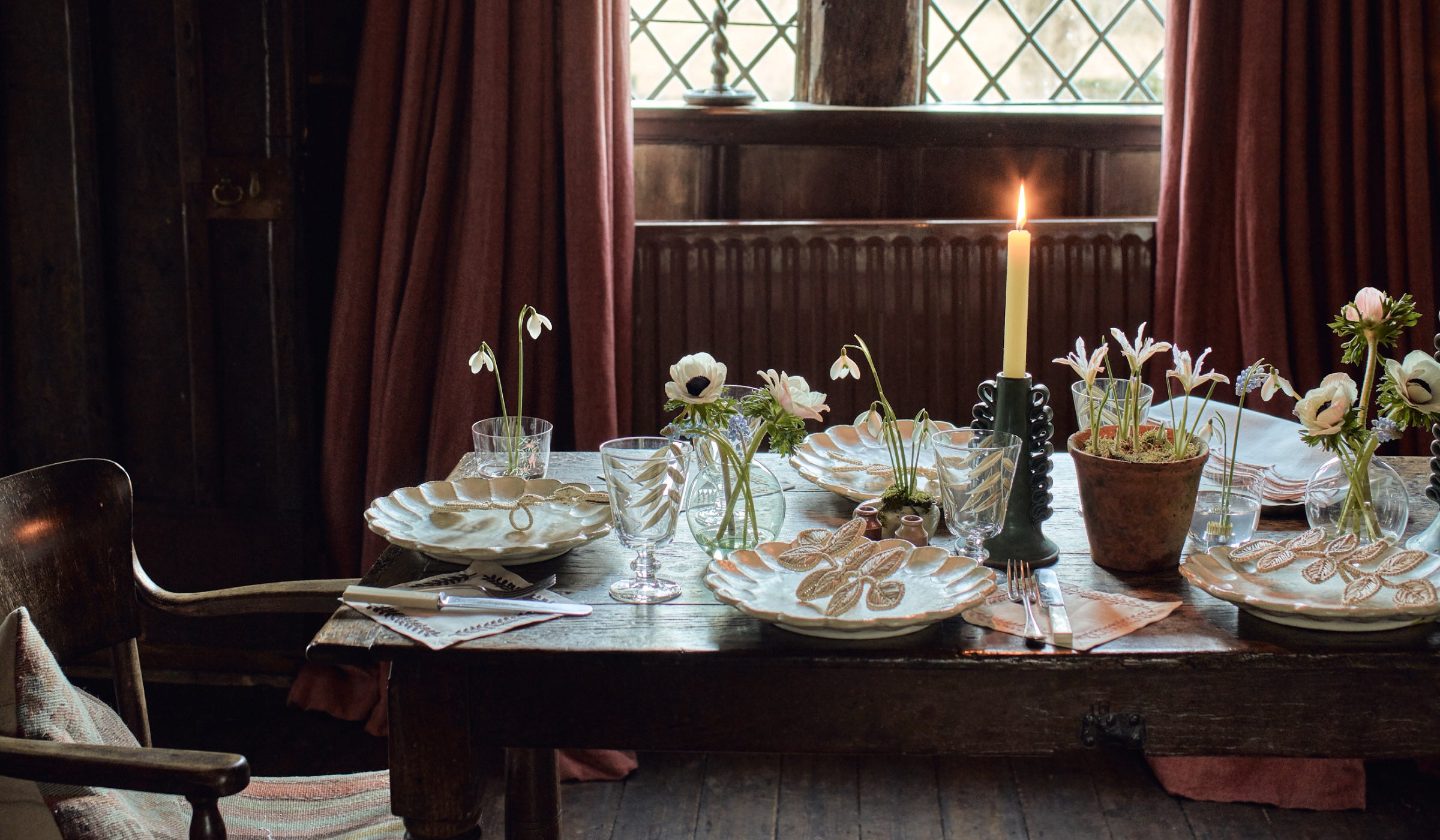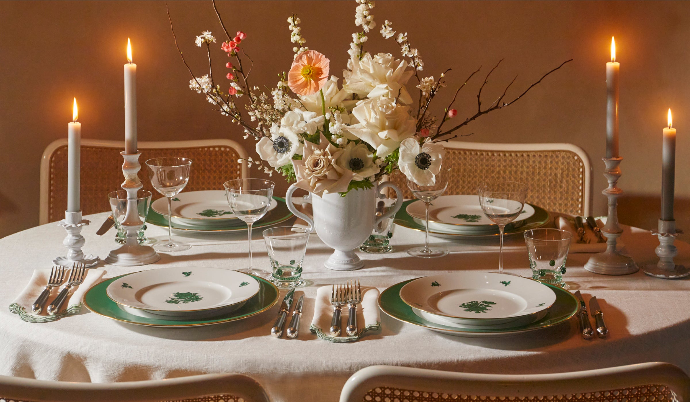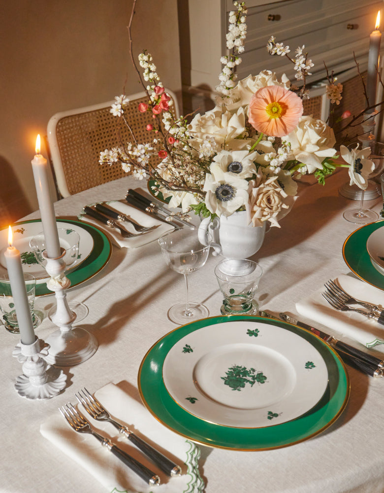 “I think a minimalist tablescape is a breath of fresh air after a long time of people throwing every print, pattern and thing on the table; it’s like a visual rest. I think there is something endlessly refreshing and visually cleansing about green flowers on white china plates: it’s one of my favorite things. Sit them on the perfect white tablecloth with candlesticks and elegant long-stem glassware, then add a centerpiece like an Astier de Villatte vase… which is the sort of item that will become a future heirloom.”