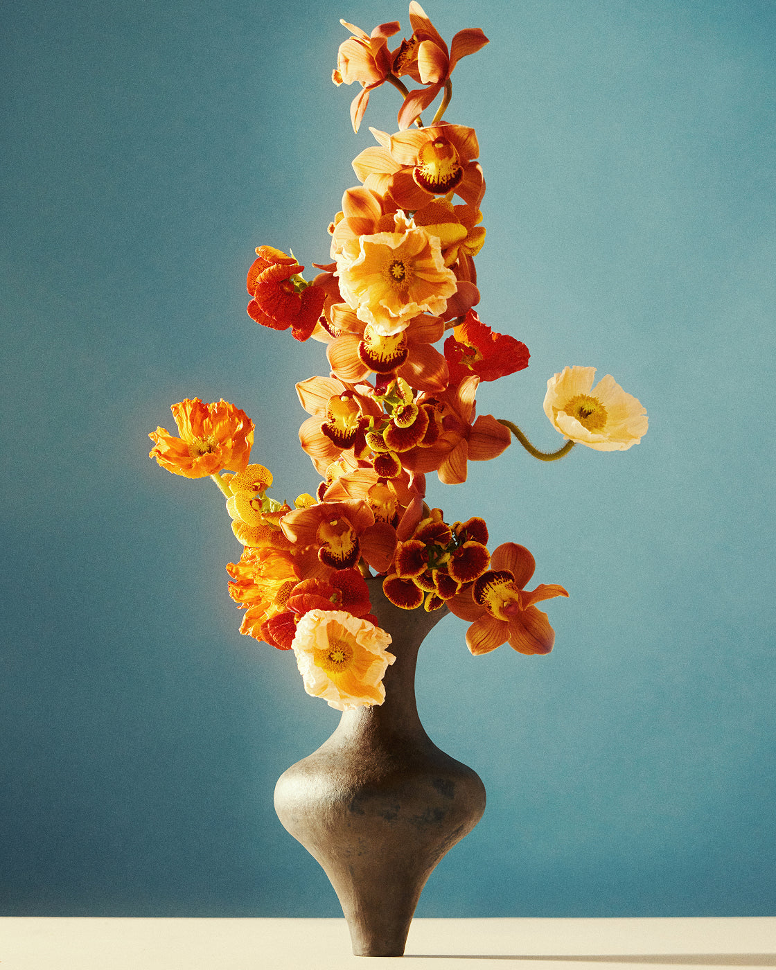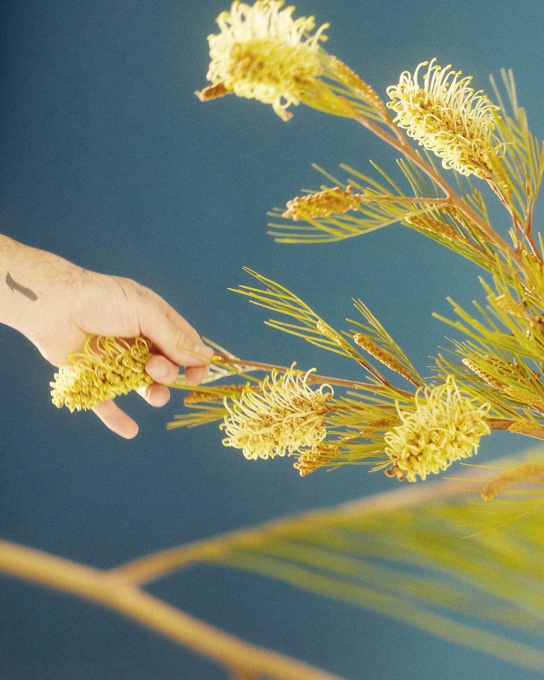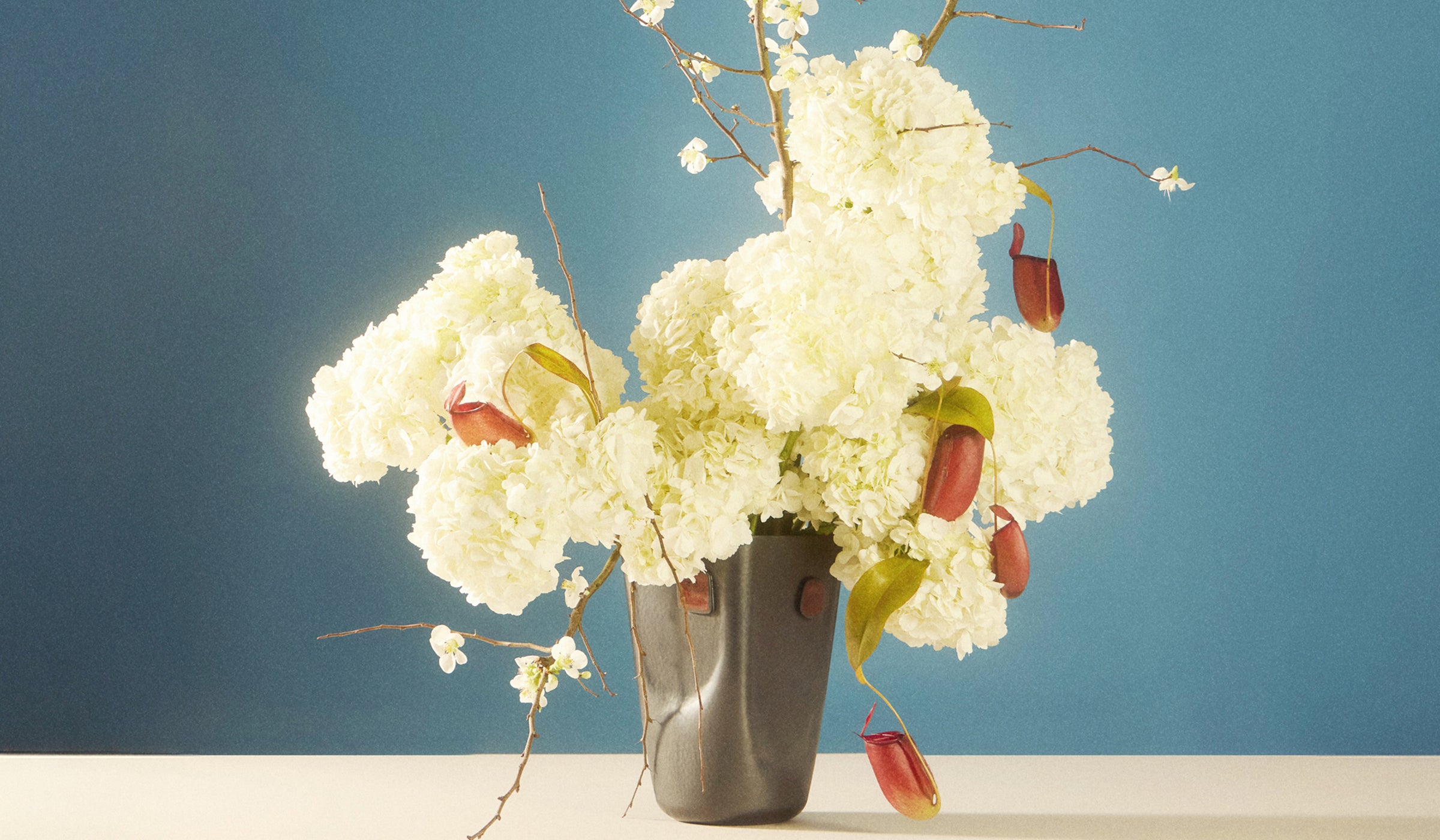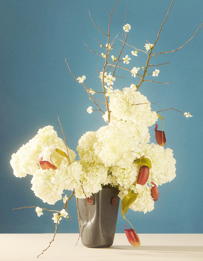 “I love to arrange with non-floral botanicals: fruit, vegetable, roots and branches which add something interesting and unexpected. Beauty is everywhere if you only look for it. As a rule, I follow the idea that the stems should not exceed the width of the narrowest part of the vase, so if you had a bucket vase and it had a narrow base and a wide neck, I would still want the stems to be in line with the narrow base of the vase. When it all spreads out like a fan, I think you lose a design touch. In general, I prioritize texture over color. I think you can have a really discordant color combination but if it’s texturally interesting and has depth, it can work.”