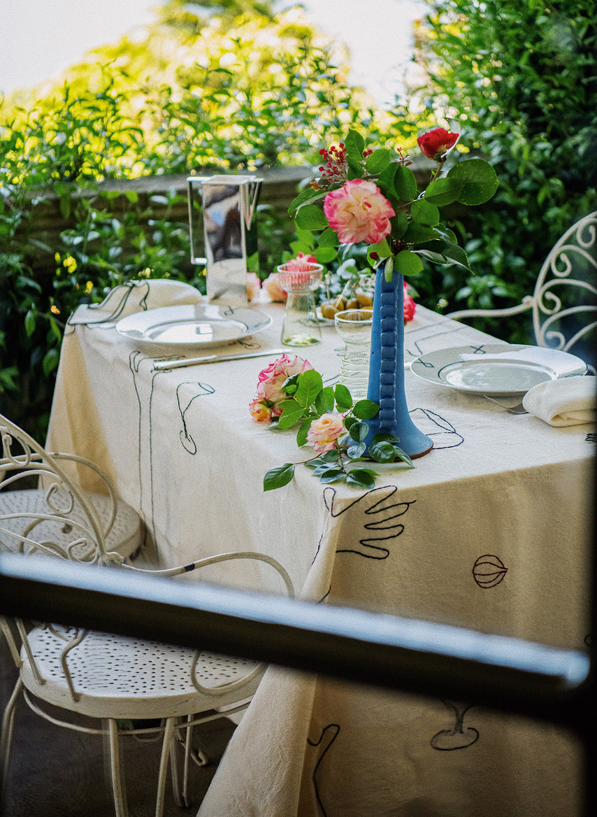 “It’s really important to have a beautiful dining table. We are obsessed with details and so I am really good at preparing the table in the correct way. This was a moment captured when we stopped for lunch and started setting the table when our neighbor, Lella—a very cool woman with a beautiful garden—brought us 20 pink roses from her garden for the table. I loved the combination of the colors with the tablecloth, and this moment perfectly captures the spontaneity of an Italian summer.”