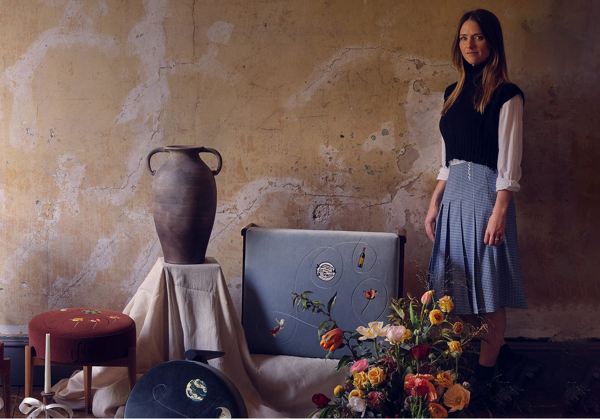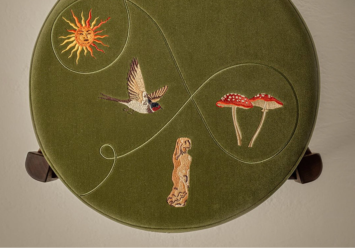 Founded by Kara Douwma, Uncommon Ancestor creates finely crafted footstools with bespoke embroidery. Each design begins with a story and set of hand-drawn motifs; the design is then translated into embroidery by London artisans using a thoughtful combination of stitches and threads on a rich velvet base. The embroidery sits on top of a solid walnut frame that’s handmade in a small workshop in East London. The final piece invites the owner to dive deeper into the meaning behind the embroidered motifs so they become a part of their own story.
