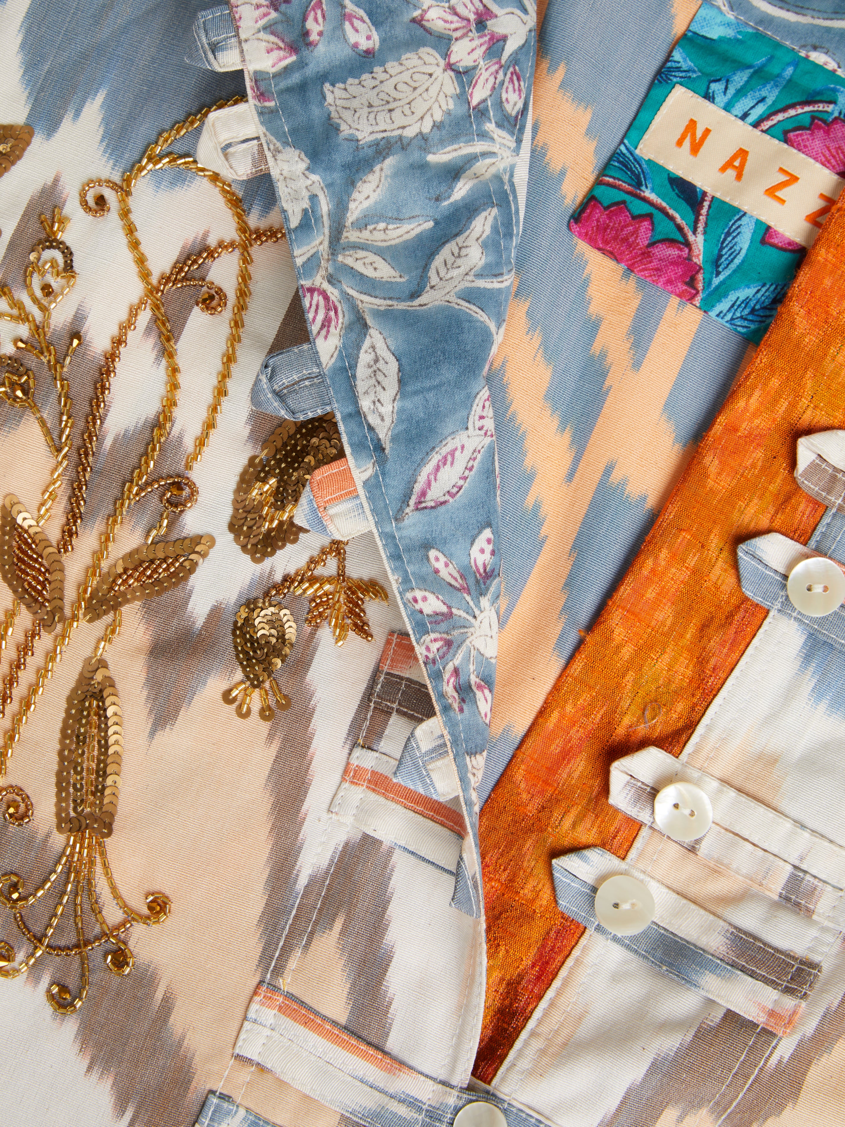 Nazzy Beglari has been enamoured by the ever-evolving art of ikat for as long as she can remember, and she spent years delving into its rich history – a form of investigative work she credits to her journalistic background. While studying double ikat, she learned of the Salvi family in Ahmedabad, India, who have been mastering the technique since the 11th century. To further her understanding, she visited them, and was blown away by their museum, workshop and heritage. This isn’t the only example, as she also works closely with 1853-founded Chikusen in Tokyo, which is widely regarded as one of the finest fabric houses in Japan. Her dedication to the finest make is underpinned by her strict zero-waste philosophy, as all cut-offs are used on collars, cuffs or to make lavender-scented pouches that she tucks away inside her reusable cotton packaging.