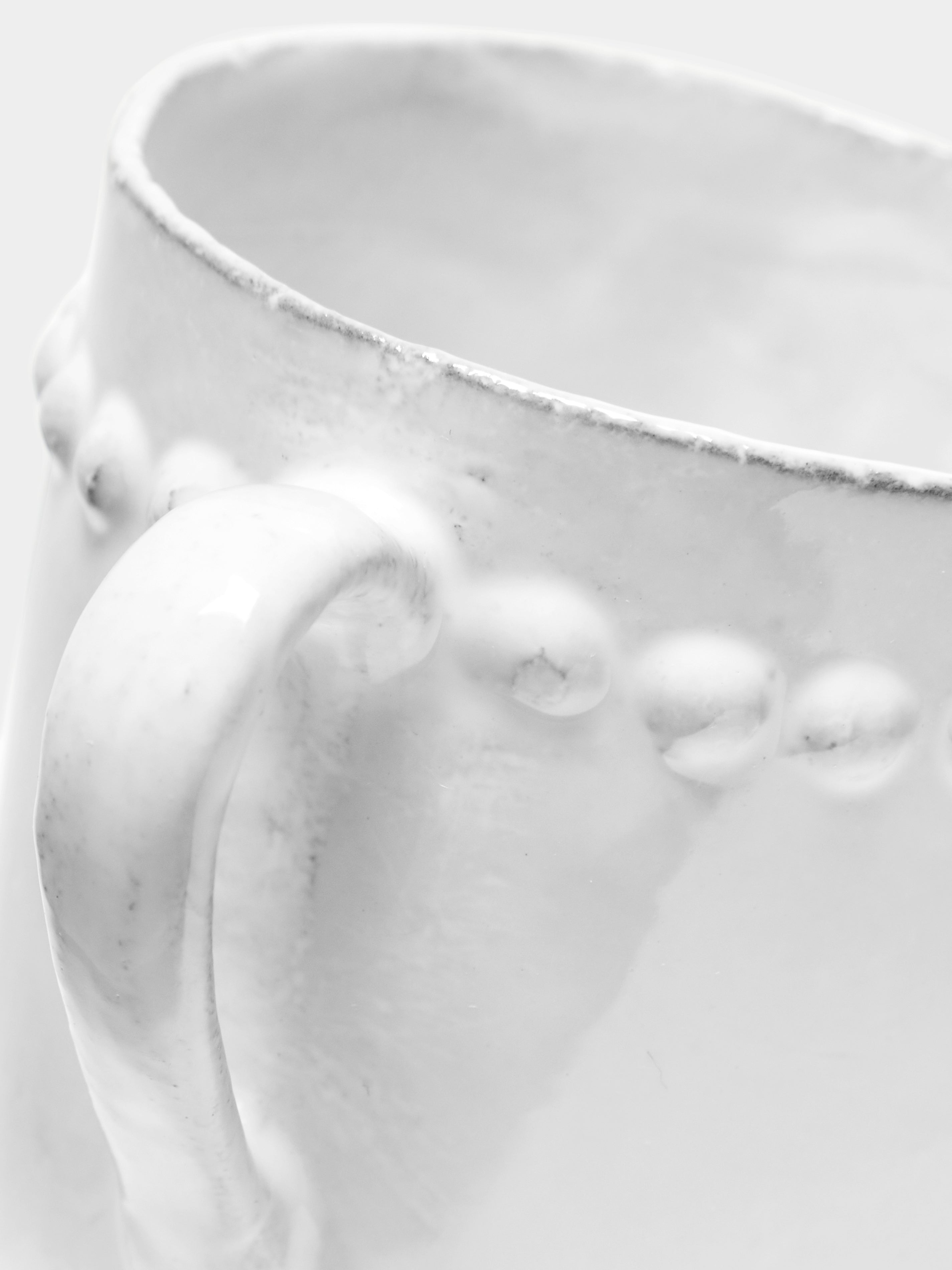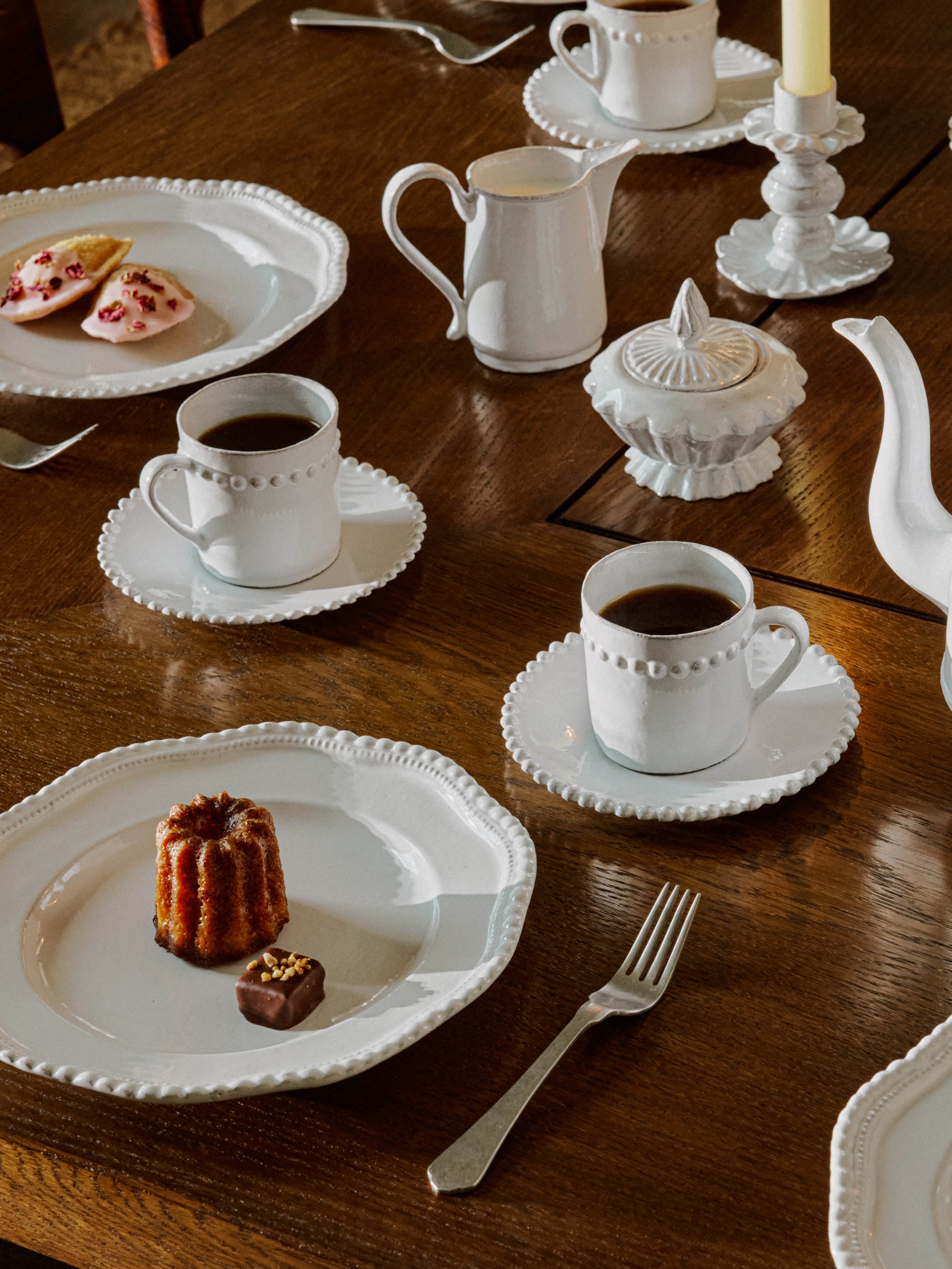 Old friends Ivan Pericoli and Benoît Astier de Villatte met at the prestigious École des Beaux-Arts in Paris, leading to the launch of Astier de Villatte in 1996. Since the beginning, they’ve been charmed with ideas of the imperfect, finding beauty in uneven glazes, dark pockmarks, and subtle ripples. But these details only emphasize the craft tale behind each piece—stories that start with a single sheet of black terracotta clay extracted from Parisian quarries. They follow traditional Roman methods to bring each "dream object" to life, shaping and inscribing each one with the potter’s initials and finishing with a high-shine white porcelain glaze.