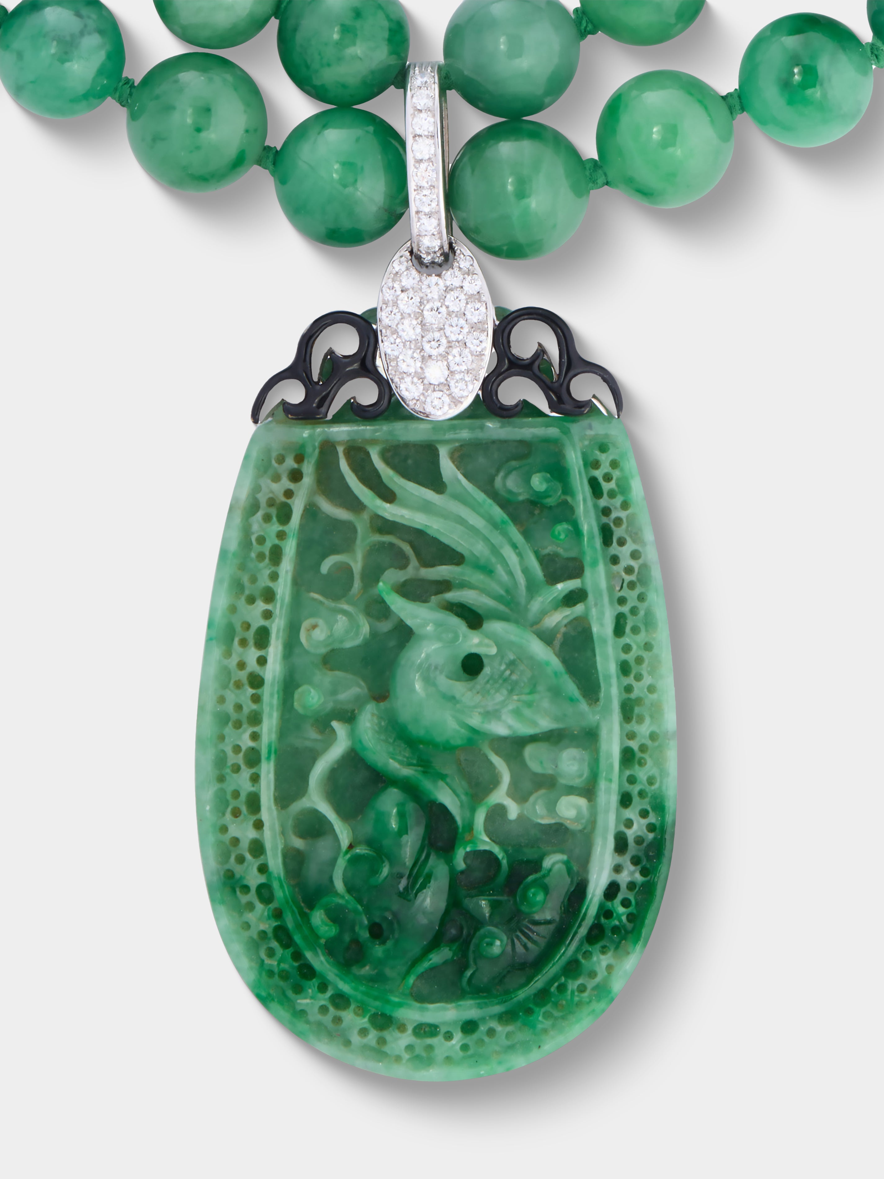 - 18-karat white gold (Italian mark), black round diamonds (total weight: 1-25-1.50ct approx.), jade; Italy; 1960s-1980s; Minor enamel loss consistent with age and use