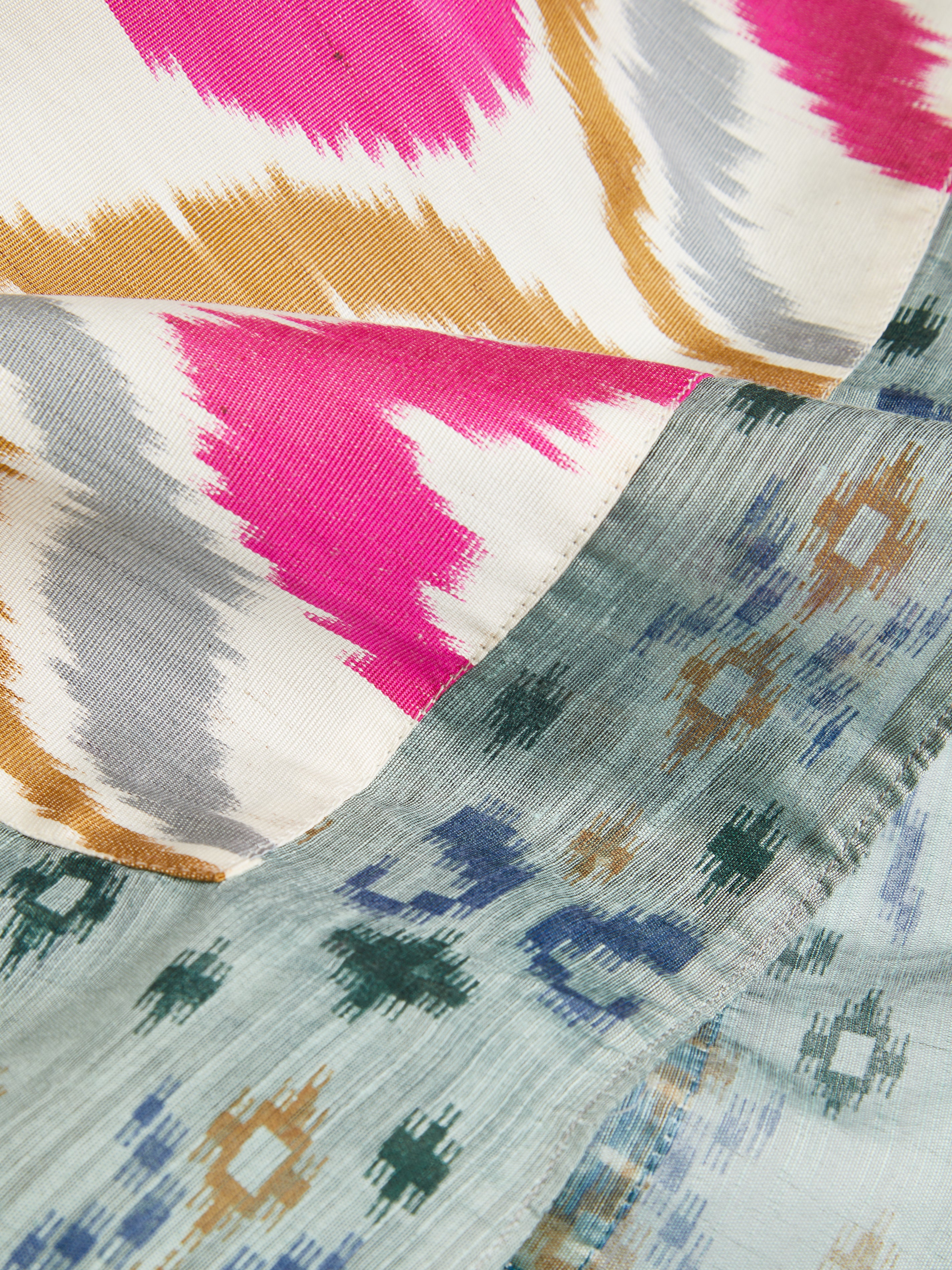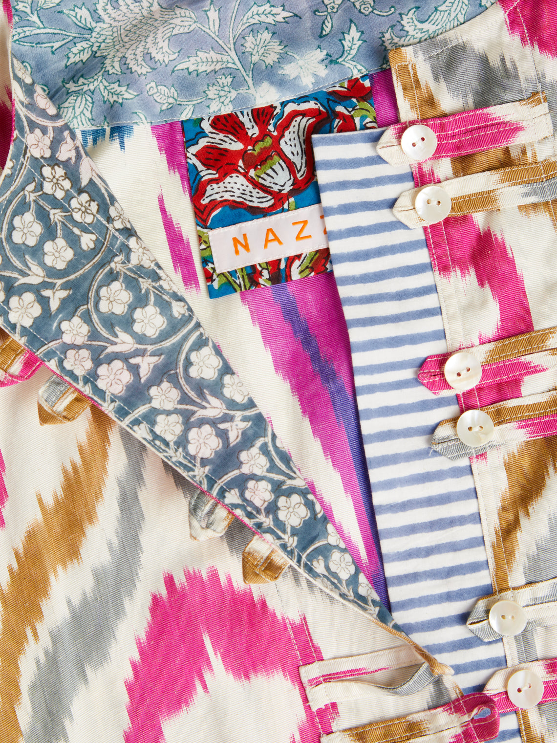 Nazzy Beglari has been enamoured by the ever-evolving art of ikat for as long as she can remember, and she spent years delving into its rich history – a form of investigative work she credits to her journalistic background. While studying double ikat, she learned of the Salvi family in Ahmedabad, India, who have been mastering the technique since the 11th century. To further her understanding, she visited them, and was blown away by their museum, workshop and heritage. This isn’t the only example, as she also works closely with 1853-founded Chikusen in Tokyo, which is widely regarded as one of the finest fabric houses in Japan. Her dedication to the finest make is underpinned by her strict zero-waste philosophy, as all cut-offs are used on collars, cuffs or to make lavender-scented pouches that she tucks away inside her reusable cotton packaging.
