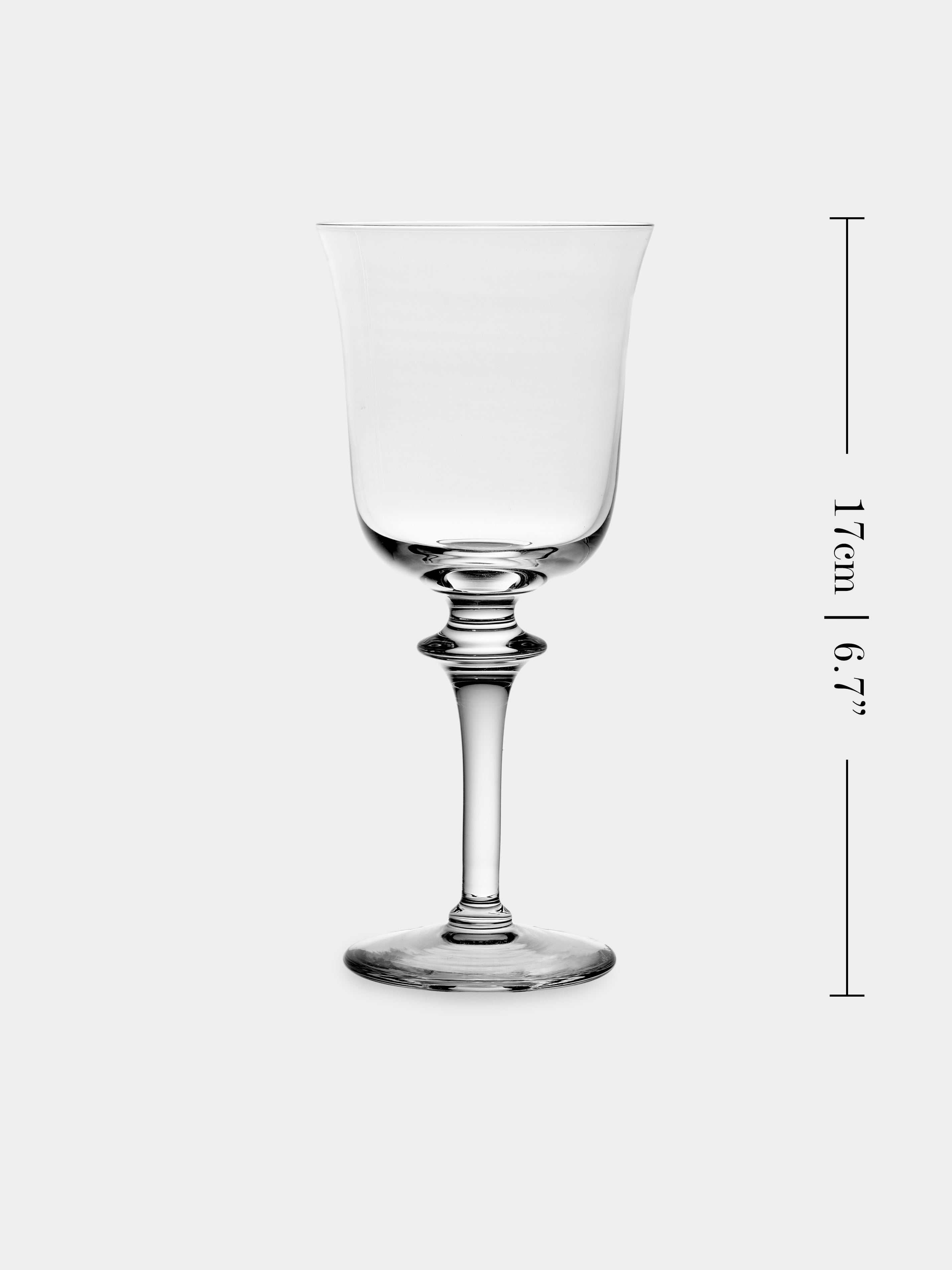 - Set includes: Champagne Glasses 21.2cm (h) x 5.8cm (d); Water Glasses 18cm (h) x 8.3cm (d); Wine Glasses 17cm (h) x 7cm (d)