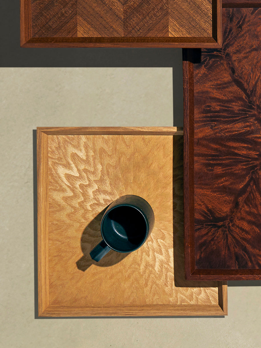 Since 1953, Tokushima-based Mori Kougei has been specialising in tsuki-ita, a highly complex technique in which paper-thin sheets of wood are sliced with sharp blades before being bonded together to form intricate surface patterns. This meticulous process has been refined and passed through the generations for more than 70 years. The result is a selection of functional trays highlighting the grain, colour and character of different wood species. Expect meticulously indigo-dyed pieces – a treasured Tokushima art – and subtle, contemporary scenes inspired by art, geometry and nature.