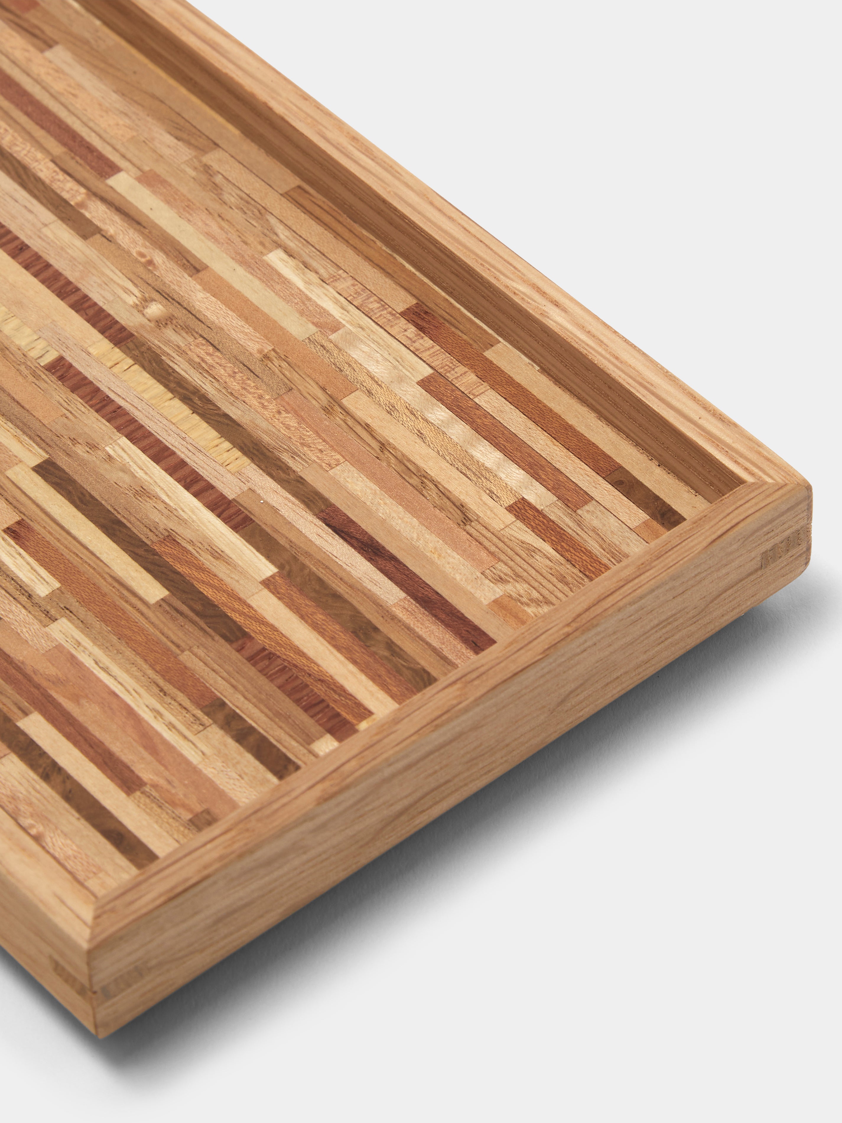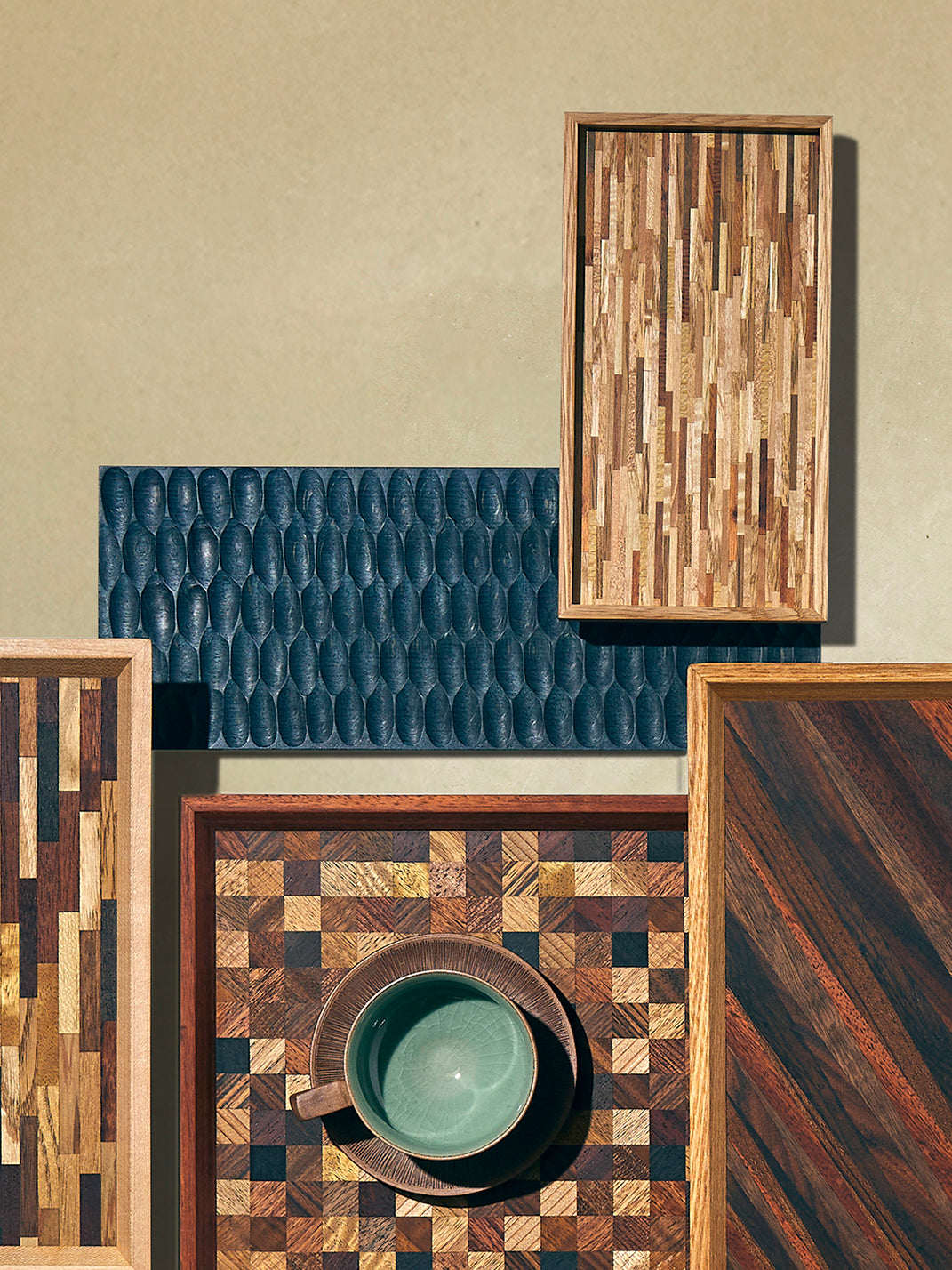 Since 1953, Tokushima-based Mori Kougei has been specialising in tsuki-ita, a highly complex technique in which paper-thin sheets of wood are sliced with sharp blades before being bonded together to form intricate surface patterns. This meticulous process has been refined and passed through the generations for more than 70 years. The result is a selection of functional trays highlighting the grain, colour and character of different wood species. Expect meticulously indigo-dyed pieces – a treasured Tokushima art – and subtle, contemporary scenes inspired by art, geometry and nature.
