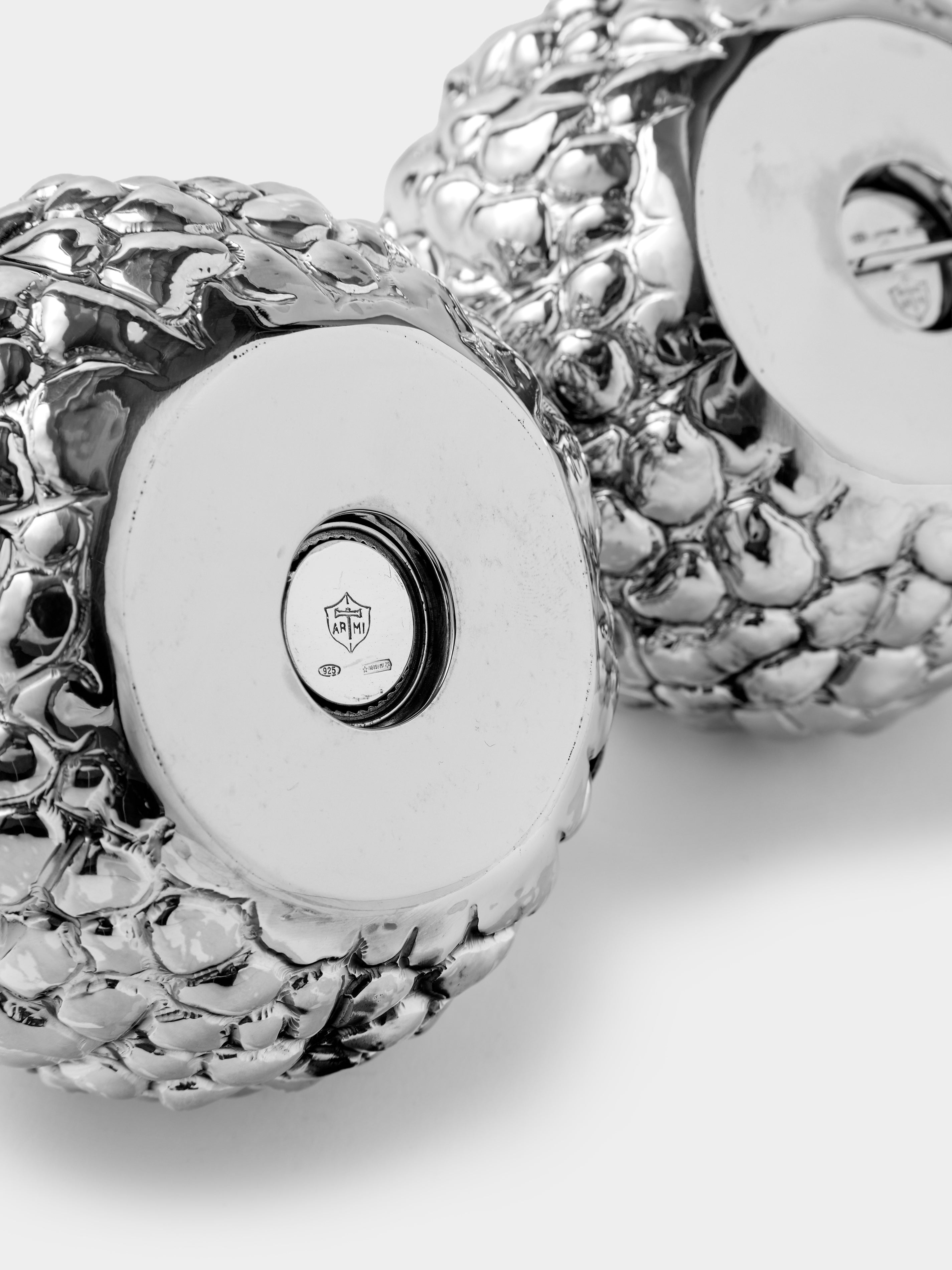 Since 1950, a small workshop in Milan, Orto Argenteo, has passed its silversmithing skills from one generation to the next, keeping alive the slow, careful rhythm of hand-worked sterling silver. Decades of collaborating with luxury houses inform thetextures and finishes, but the spirit here is delightfully light-hearted. Fruits and vegetables—from pomegranates to mushrooms, pumpkins totomatoes—are sculpted into silver salt and pepper shakers and grinders, turning the table into a place for craftsmanship (and a little mischief).