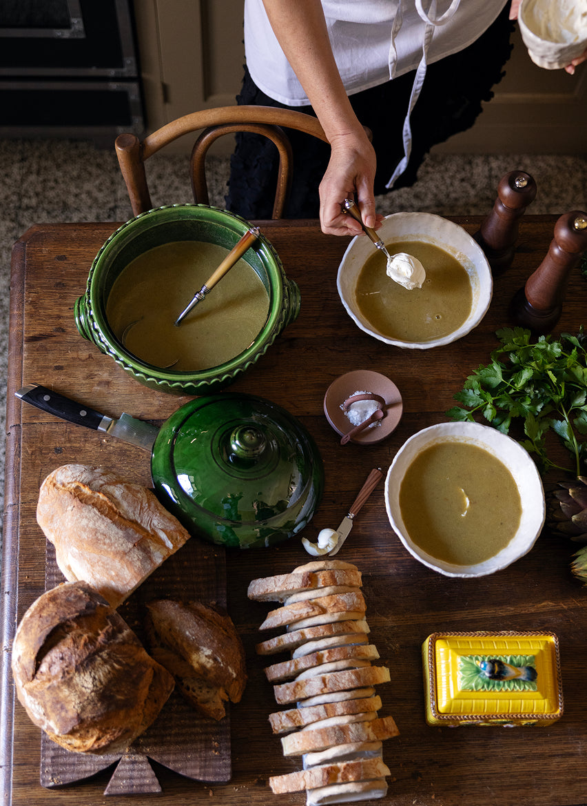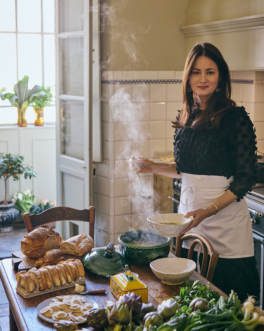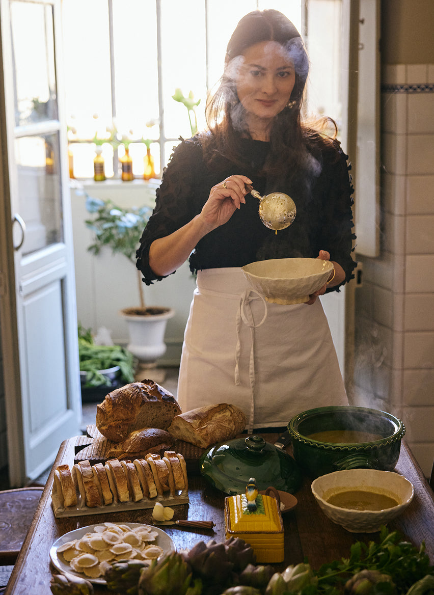 “Candles that set the mood, and beautiful accessories like salt and pepper mills. I love a good butter dish. I have two in my fridge, and I have this little dome with a pear on it for maybe a condiment or something. I like these little curiosities that you can find, including beautiful glasses—and lots of them. Napkins are a must and are the sign of a good table. I’ve always been fascinated by the big centerpiece, too. In the olden days, there used to be a sculptural centerpiece in the middle to represent the season. I like using beautiful tureens to be the star of the show and put something seasonal inside, like fruit or soups. After that, it’s really all about the quality and seasonality of the ingredients.”
