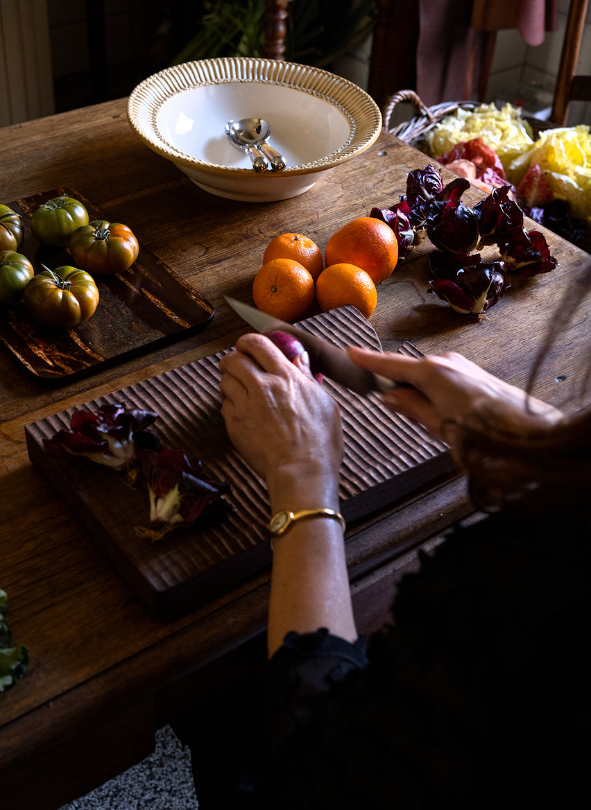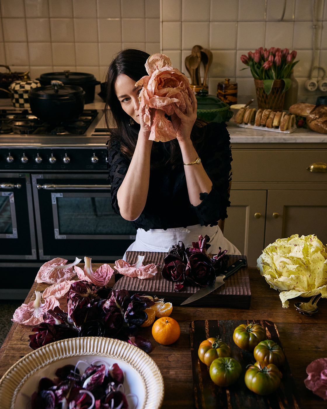 “My guests will always help me cook. I always have a stack of eight white aprons ready in the kitchen and they enjoy it, actually. It's fun and all part of the entertainment—I host lots of workshops so I'm good at managing people indirectly like this. I’ll do something once and then they'll repeat it. And maybe someone will be slicing, someone will be assembling the hors d'oeuvres, and someone will be making a dressing. It's really nice. We've always done that, and I think that's why a lot of people say our dinner parties are so unforgettable, because they're so fun.”