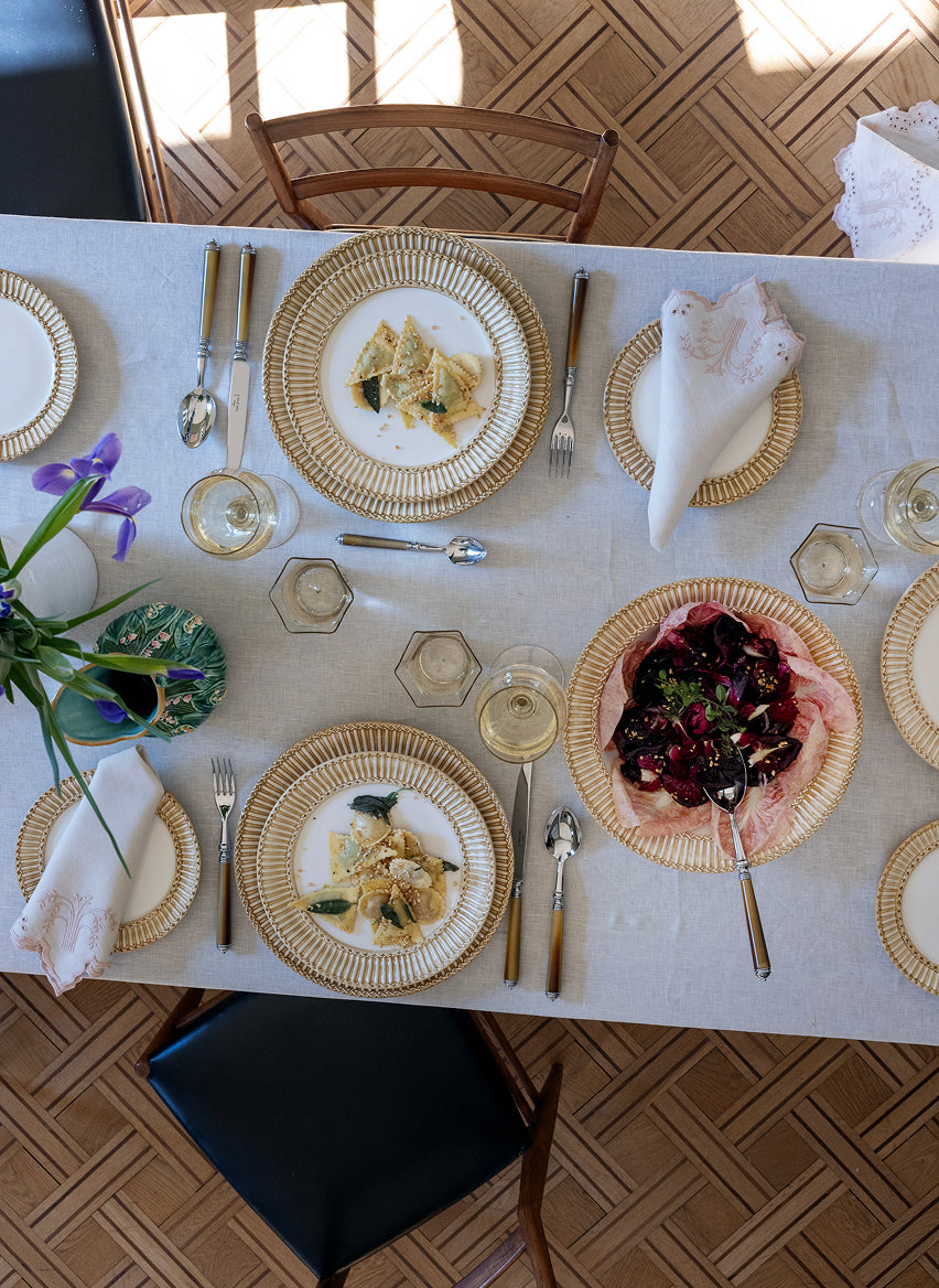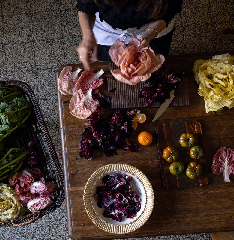 “The menu is always seasonal. At the moment, it’s a lot of spring salads in hues of red and pink, fresh ricotta and spinach paste, and vegetable soups—all with a freshness that feels light but also gourmand. Any time of year, I love to give the wow factor when entertaining. I love the first moment when we see something. The quality, of course, has to be delicious, but it's so important to me that people are wowed and excited when they see something. That's why I think shaped in a dome or with height is always good for a surprise. Something like a Timballo—which is like an upside-down cake made from angel hair pasta—or a Nuvola—which is a Pandoro cake covered with vanilla cream and icing sugar—are perfect for this.”