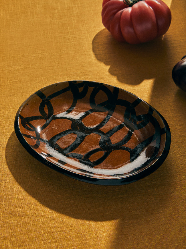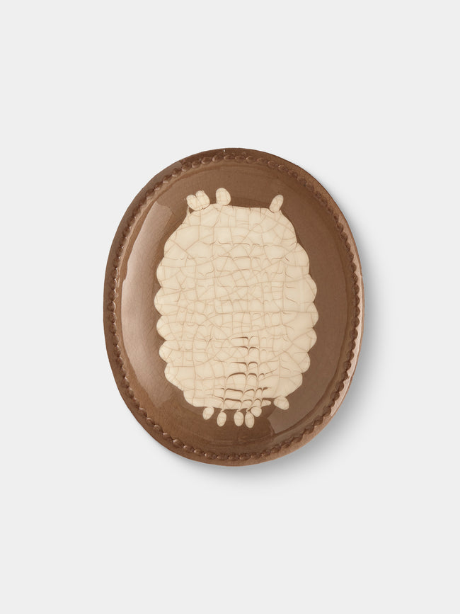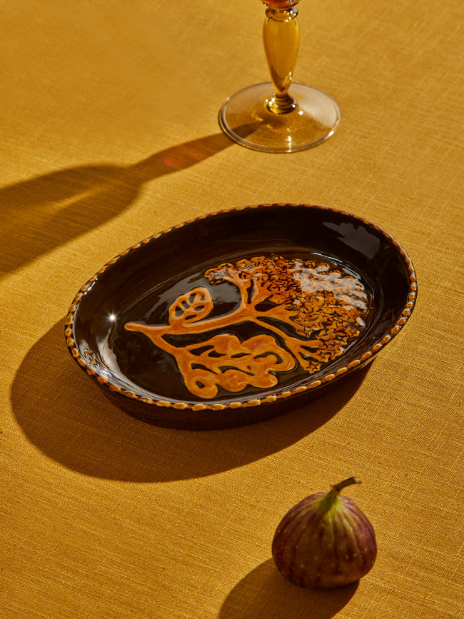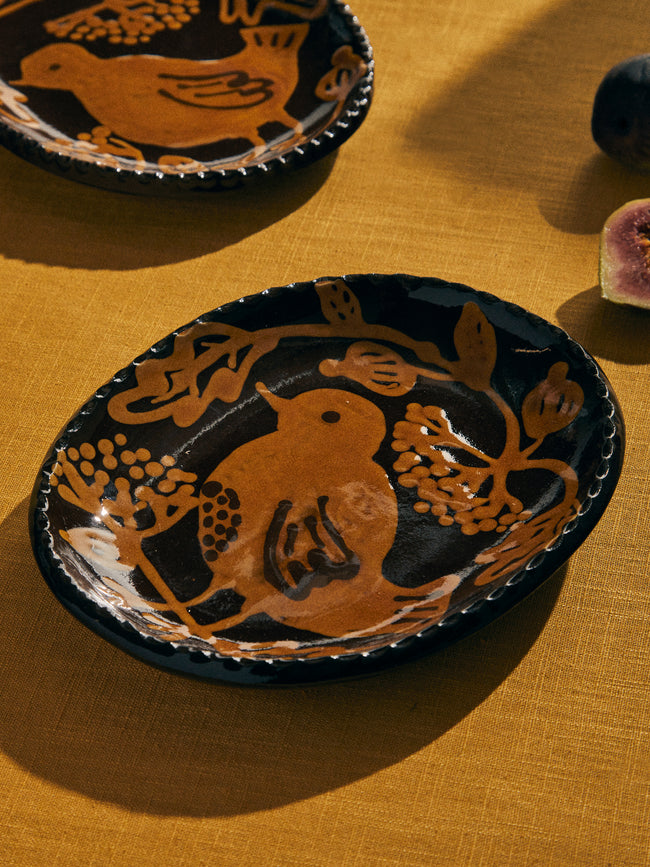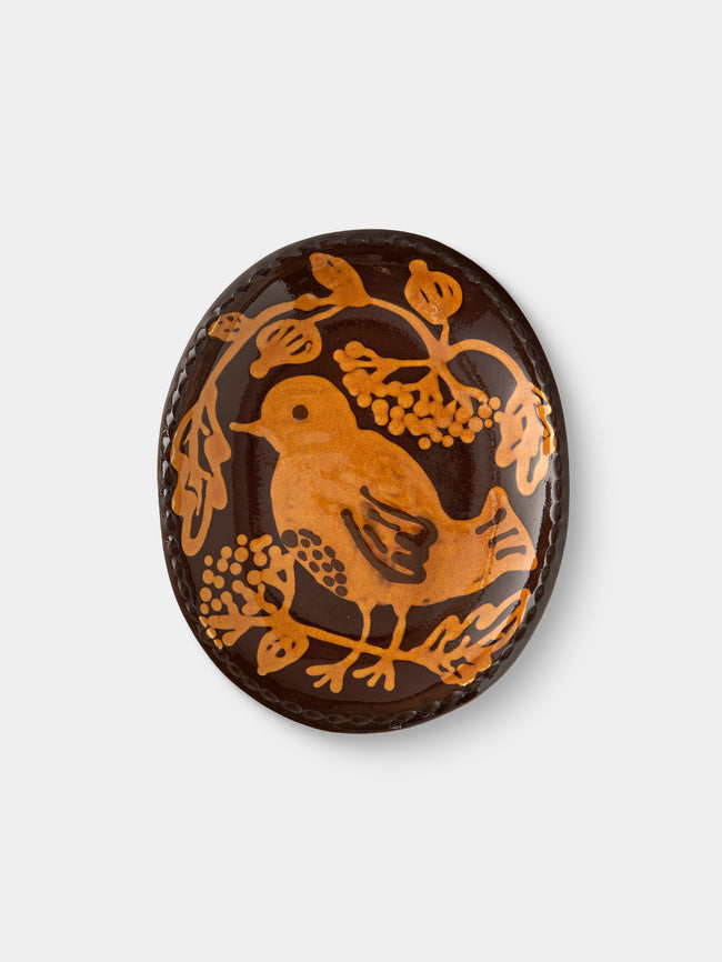Originally from the Japanese island of Shikoku, Brighton-based ceramicist Hiroko Aono-Billson began working with clay over 30 years ago while studying at Morley College in London. Influenced by her mother’s collection of Japanese ceramics and the Mingei movement, which translates to ‘folk craft’, her work blends terracotta earthenware with the sgraffito technique, where hand-built forms are finished with decorative slips. Her signature motif, the Harmony Bird, has long woven through her creative life, appearing on everything from her daughter’s T-shirts to embroidered handbags—and now, on her distinctive slipware pottery.