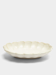 Kaneko Kohyo’s story spans a century (and counting), beginning with its first firings at a mountaintop kiln in Toki, Japan. Three decades ago, the workshop expanded into tableware, developing a recognizable signature: charming scalloped edges and a rustic, natural palette of off-white, black and blue. From sake cups to dinner plates, every piece is shaped by hand for an organic warmth and quiet individuality—qualities no machine can truly replicate.