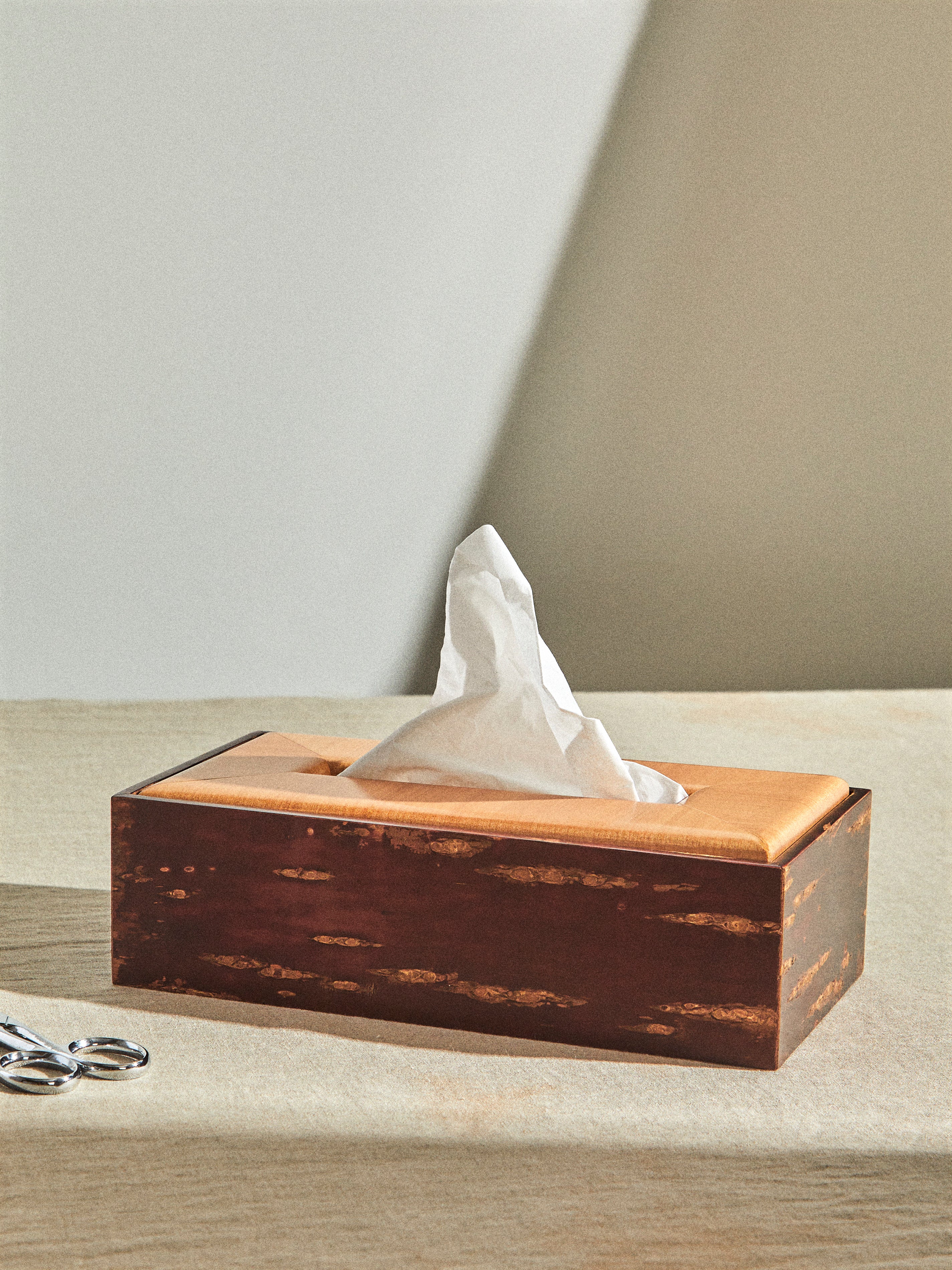 Once a secondary pursuit for samurai, kabazaiku—the art of cherry bark crafting—has shaped Denshiro’s collections for over 200 years. Based in Kakunodate, a Japanese town famed for its cherry trees, the brand continues to honor this legacy through objects made for daily use. Part of the Subako series and designed by Kaichiro Yamada, this tissue box is crafted using the kijimono technique, in which heated tools are pressed over layers of veneer and cherry bark to form its distinctive shape.