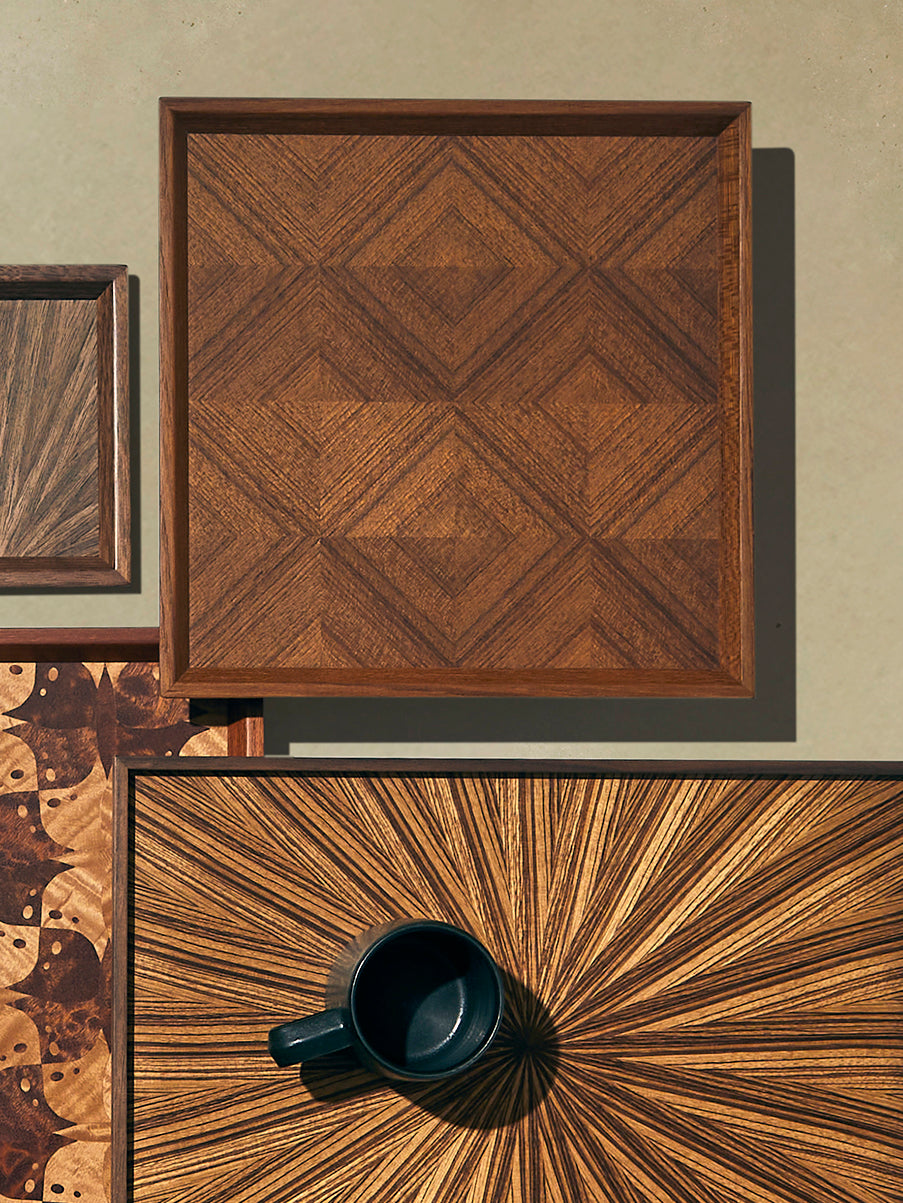 Since 1953, Tokushima-based Mori Kougei has been specialising in tsuki-ita, a highly complex technique in which paper-thin sheets of wood are sliced with sharp blades before being bonded together to form intricate surface patterns. This meticulous process has been refined and passed through the generations for more than 70 years. The result is a selection of functional trays highlighting the grain, colour and character of different wood species. Expect meticulously indigo-dyed pieces – a treasured Tokushima art – and subtle, contemporary scenes inspired by art, geometry and nature.