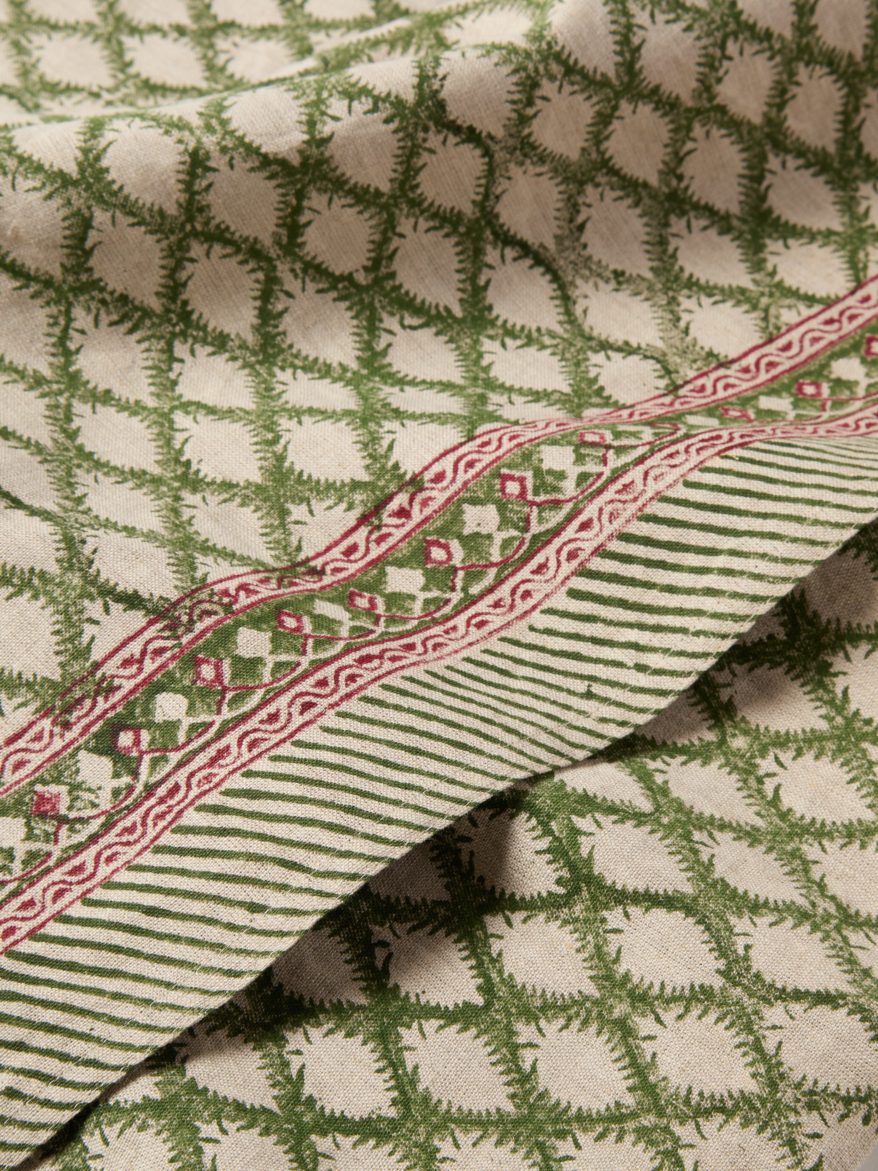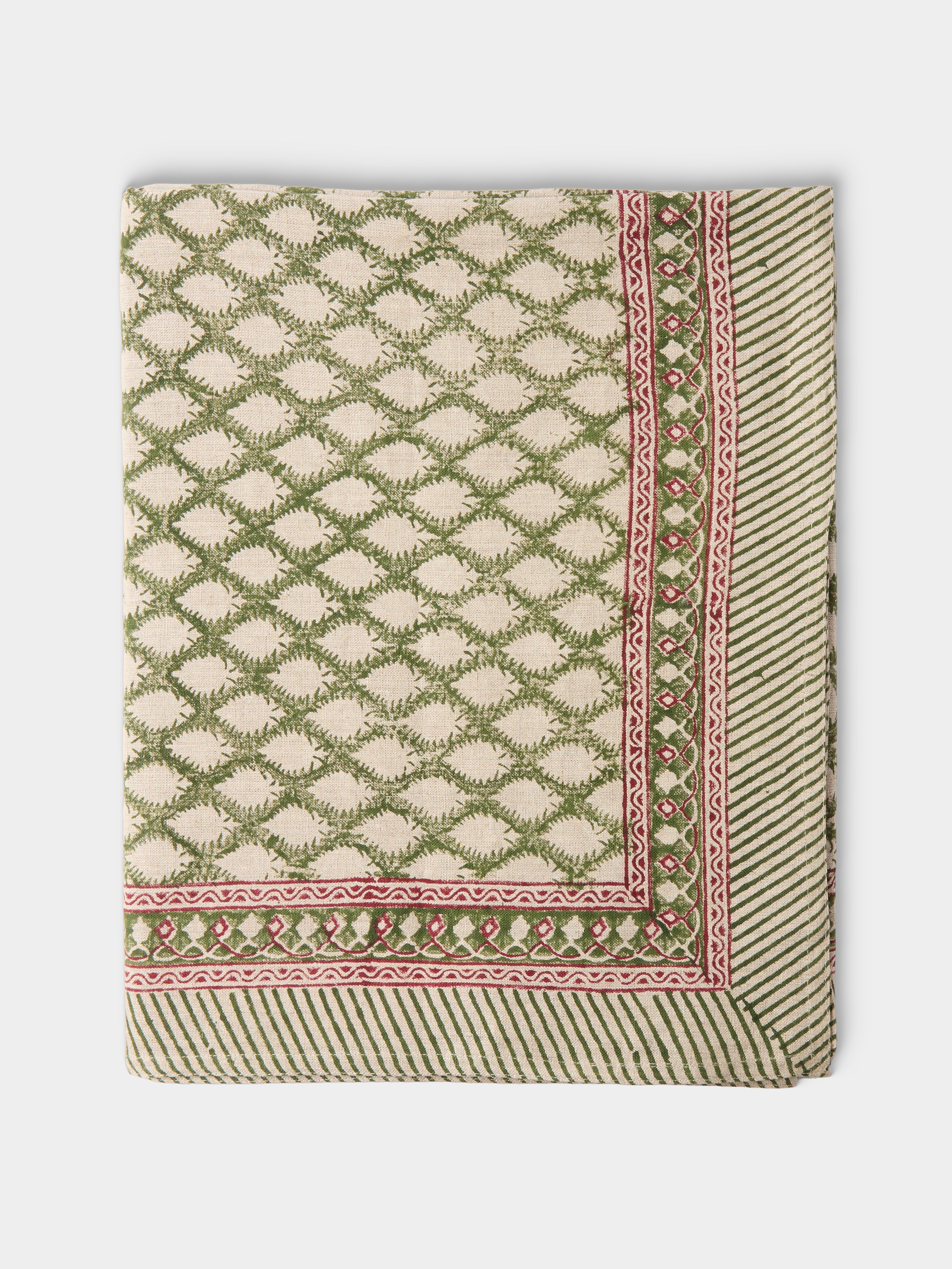 Chamois Cypress Block-Printed Linen Rectangular Tablecloth (138in/3.5m)