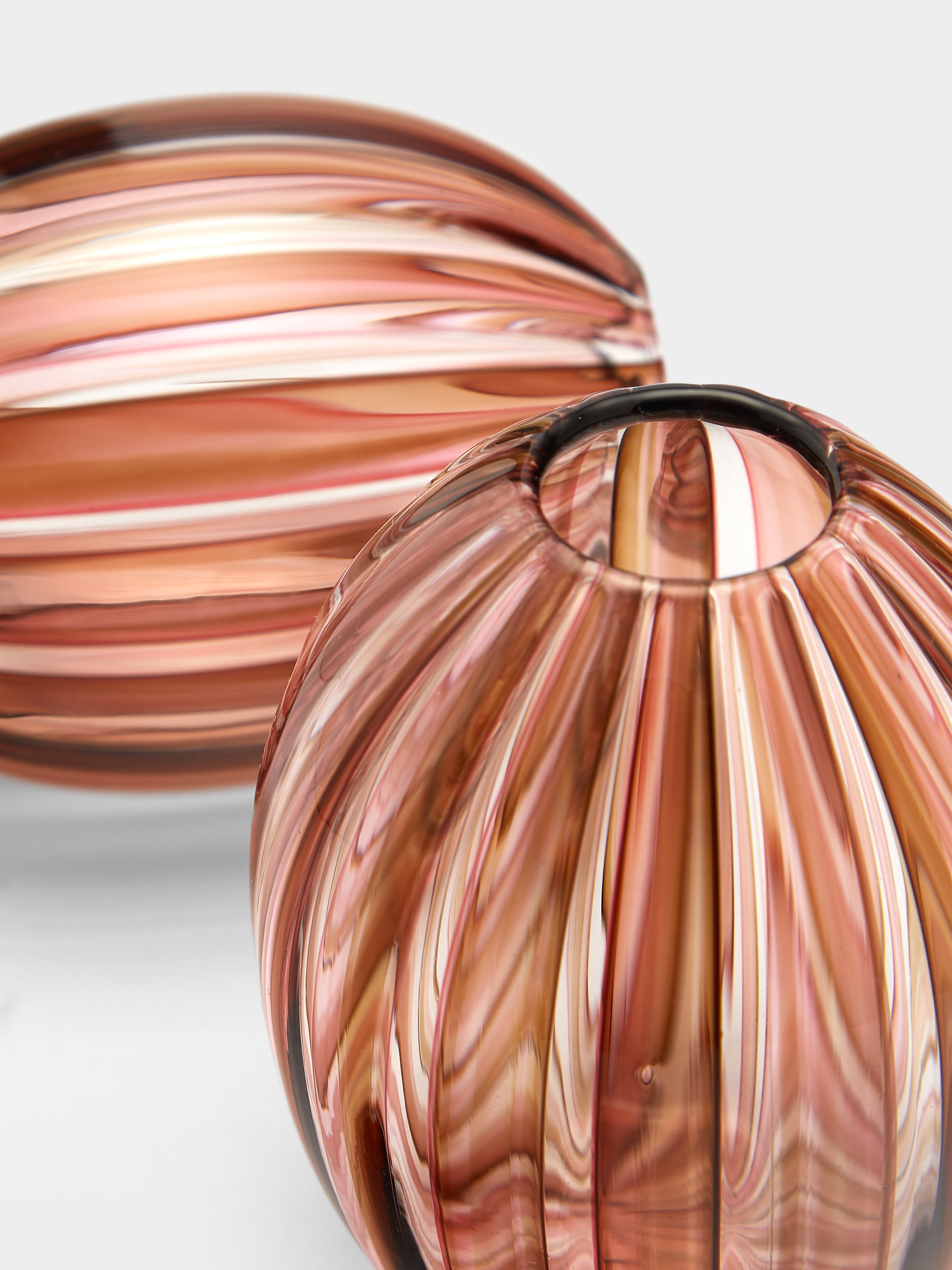 Mori Glass founders Koichiro and Chieko Mori established a glass studio in the Kagawa Prefecture in 2018 and have been delighting collectors with their distinctive designs ever since. To produce a piece of glassware, artisans in the workshop mix two colours into molten glass to create vibrant rods, which are then arranged vertically next to one another and re-melted. This results in a vertical stripe pattern with gradient hues – an instantly recognisable contemporary feature that has come to represent an authentic Mori Glass piece.