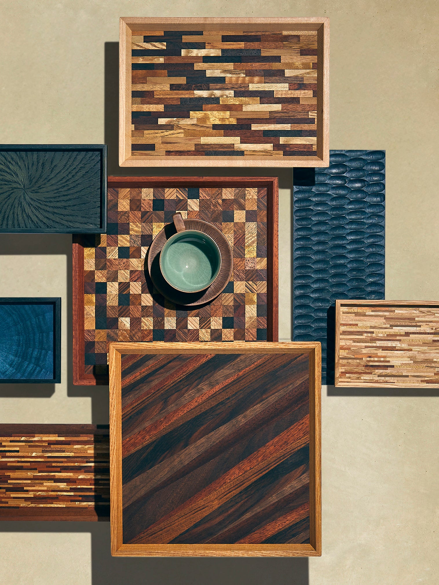 Since 1953, Tokushima-based Mori Kougei has been specialising in tsuki-ita, a highly complex technique in which paper-thin sheets of wood are sliced with sharp blades before being bonded together to form intricate surface patterns. This meticulous process has been refined and passed through the generations for more than 70 years. The result is a selection of functional trays highlighting the grain, colour and character of different wood species. Expect meticulously indigo-dyed pieces – a treasured Tokushima art – and subtle, contemporary scenes inspired by art, geometry and nature.