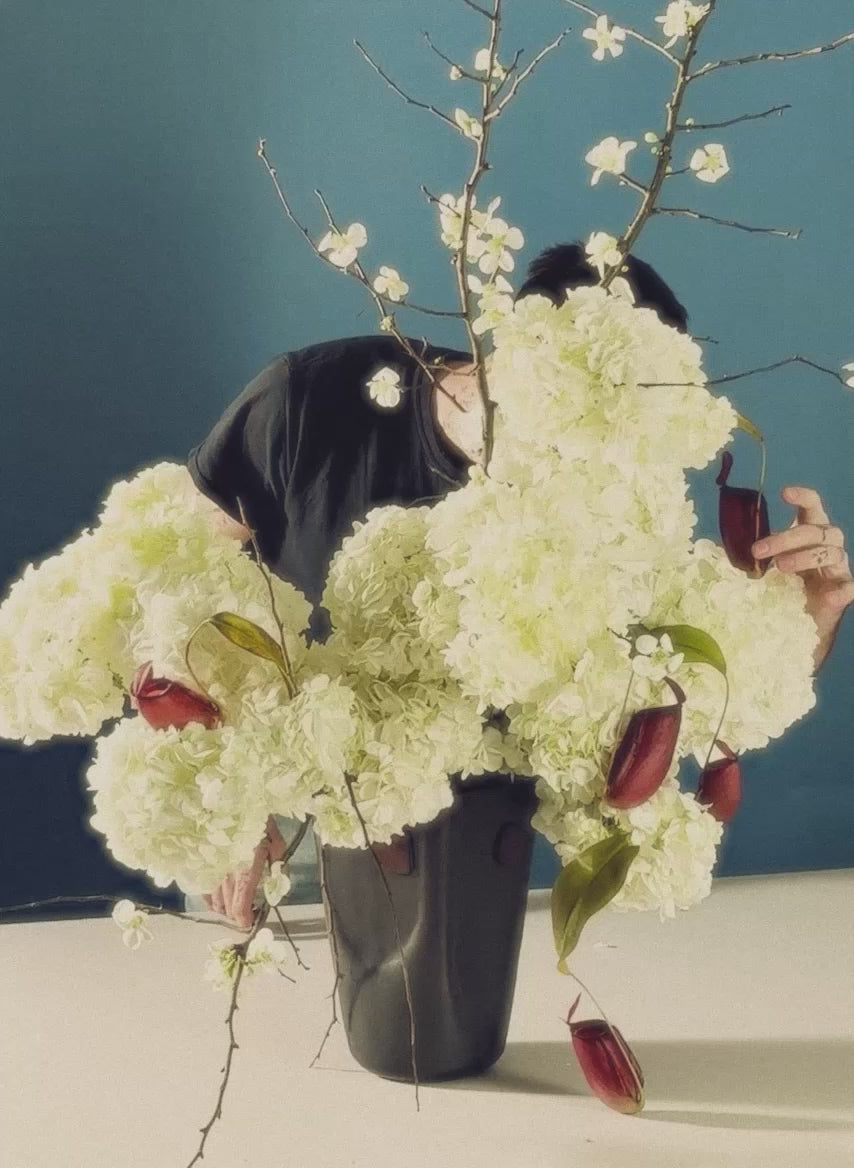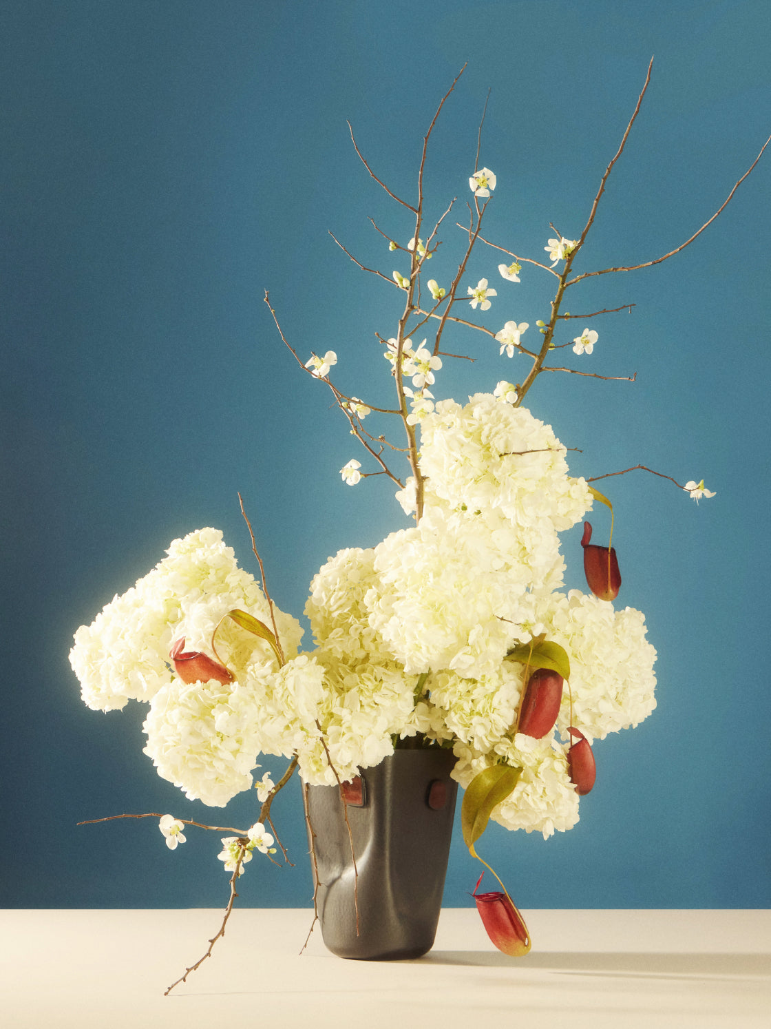 I then looked at it and felt it lacked a certain strangeness—I love to have that slightly weird ingredient that draws focus!—so I added these pitcher plants. Hydrangeas are quite an ordinary flower and my mission in life is to proselytize an engagement with nature. So, when someone doesn’t recognize something, that makes them curious to find out more.”