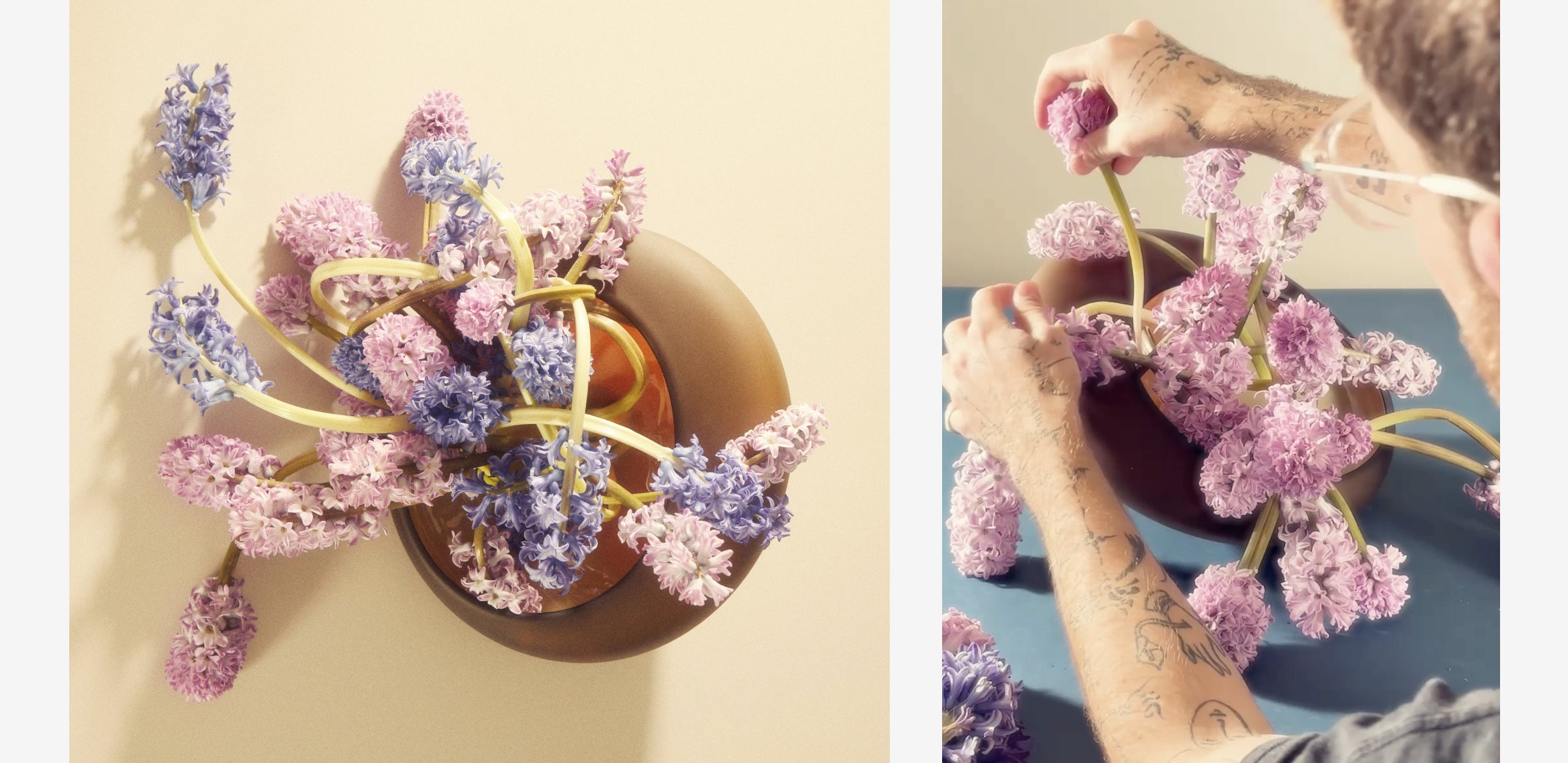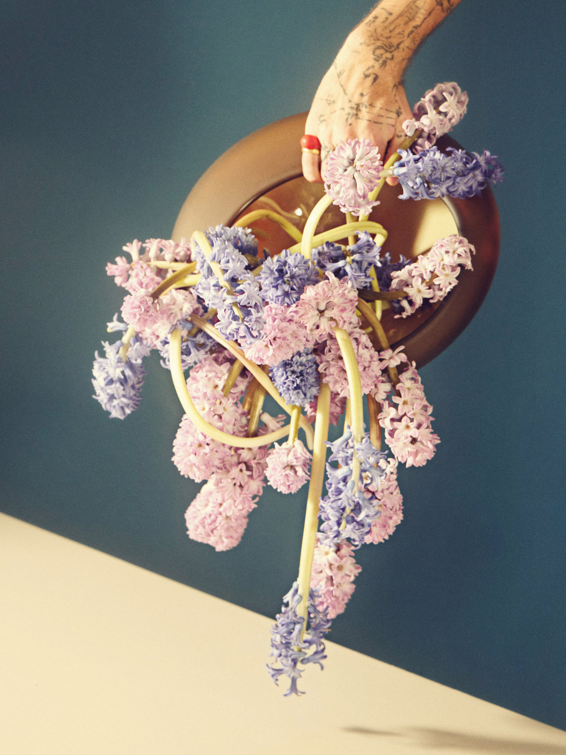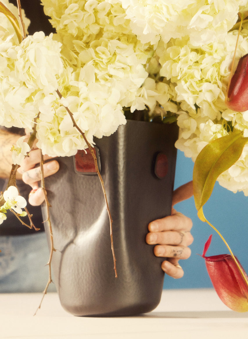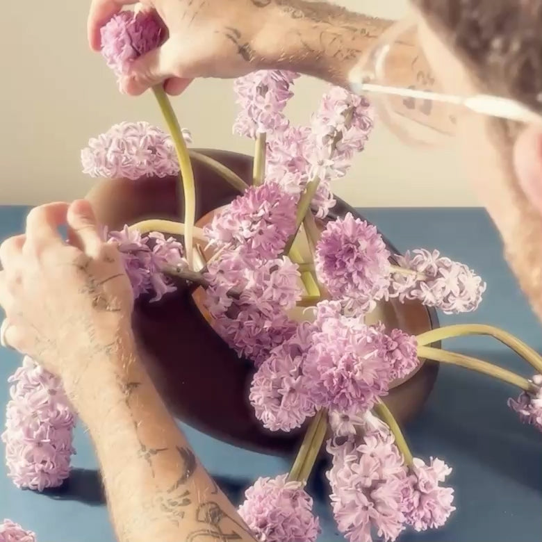 Hamish Powell’s predilection for the abstract and delighting in the unexpected makes him the perfect choice for sharing thoughts on how to arrange for ABASK’s sculptural vase curation.“Cornuco-paic, or is the word cornucopian?" laughs Hamish Powell as he describes the David Valner vessel—part strange cave form, part fruit bowl—in which he is about to orchestrate an abundance of hyacinths issuing forth. It is little wonder that Powell opted for the challenge of ABASK’s most conceptual vase shapes given his love of the weird and wonderful. He thinks his left brain/right brain approach owes something to a degree in Micro Plant Biology (where he received a first class honors), a stint at florist McQueens in London, and his career today as an artist and founder of his eponymous flower studio which collaborates regularly with Loewe, Azzedine Alaïa and New Bond Street’s fashion behemoths.