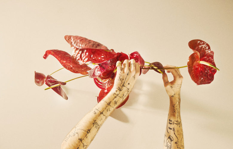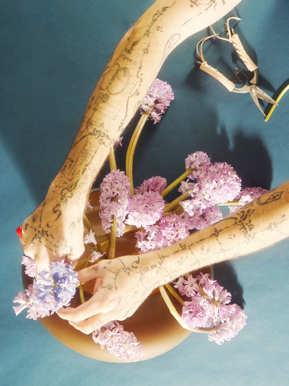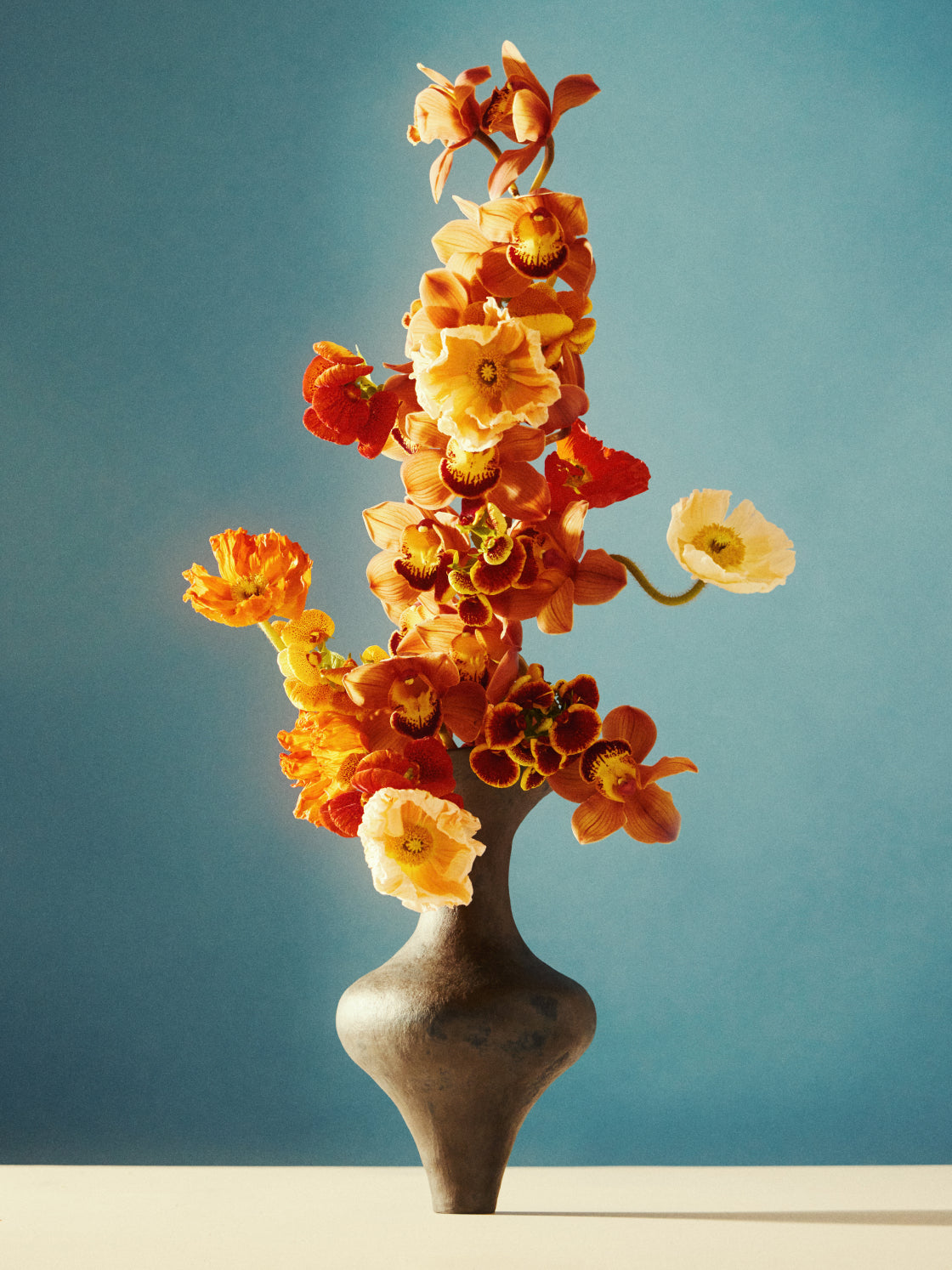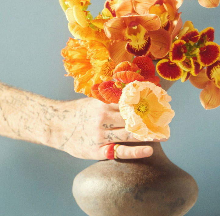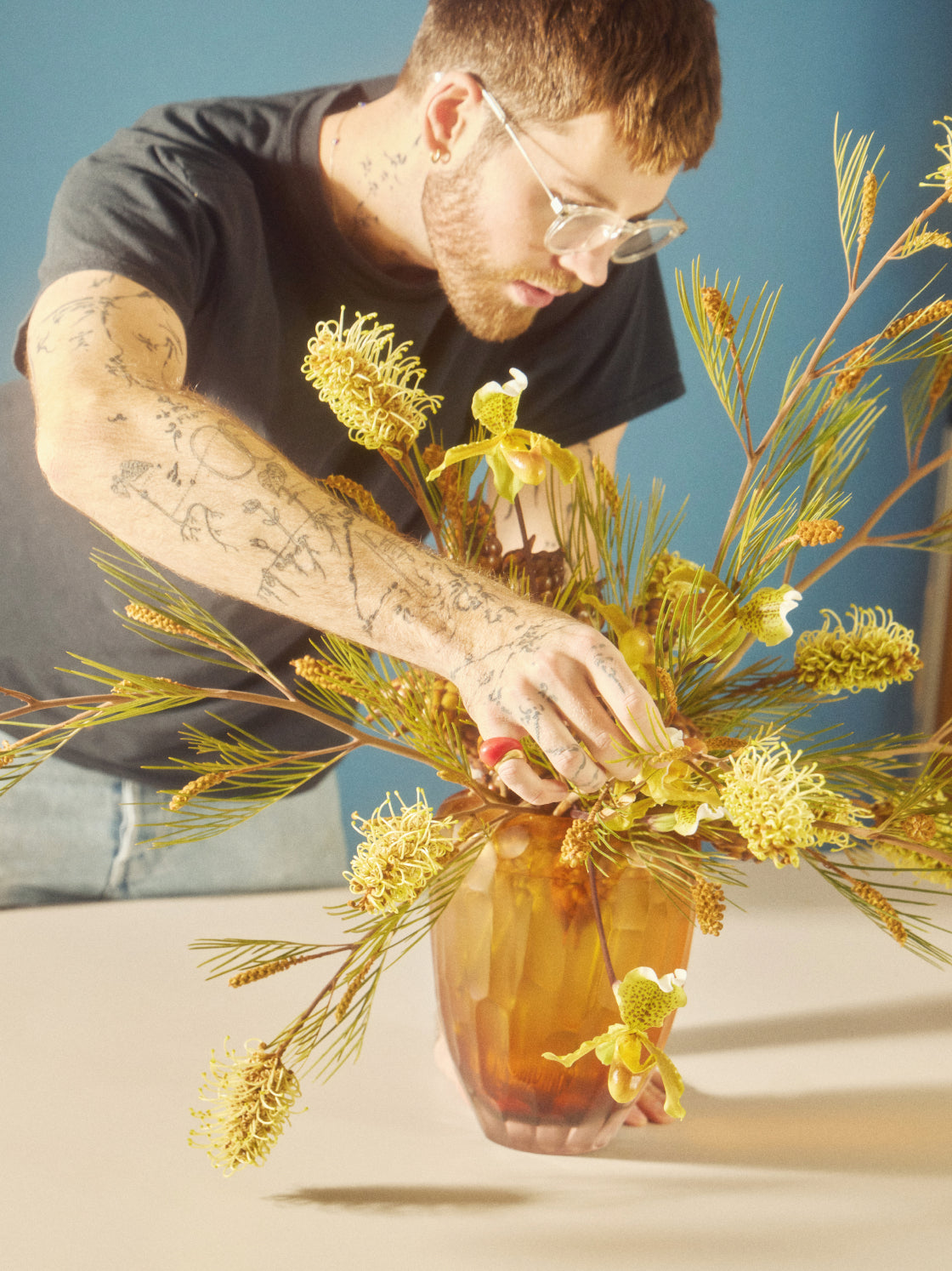 Hamish Powell’s predilection for the abstract and delighting in the unexpected makes him the perfect choice for sharing thoughts on how to arrange for ABASK’s sculptural vase curation.“Cornuco-paic, or is the word cornucopian?" laughs Hamish Powell as he describes the David Valner vessel—part strange cave form, part fruit bowl—in which he is about to orchestrate an abundance of hyacinths issuing forth. It is little wonder that Powell opted for the challenge of ABASK’s most conceptual vase shapes given his love of the weird and wonderful. He thinks his left brain/right brain approach owes something to a degree in Micro Plant Biology (where he received a first class honors), a stint at florist McQueens in London, and his career today as an artist and founder of his eponymous flower studio which collaborates regularly with Loewe, Azzedine Alaïa and New Bond Street’s fashion behemoths.