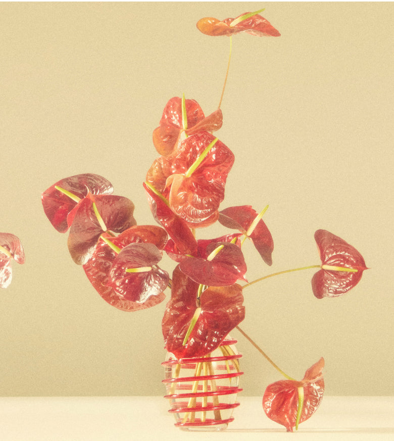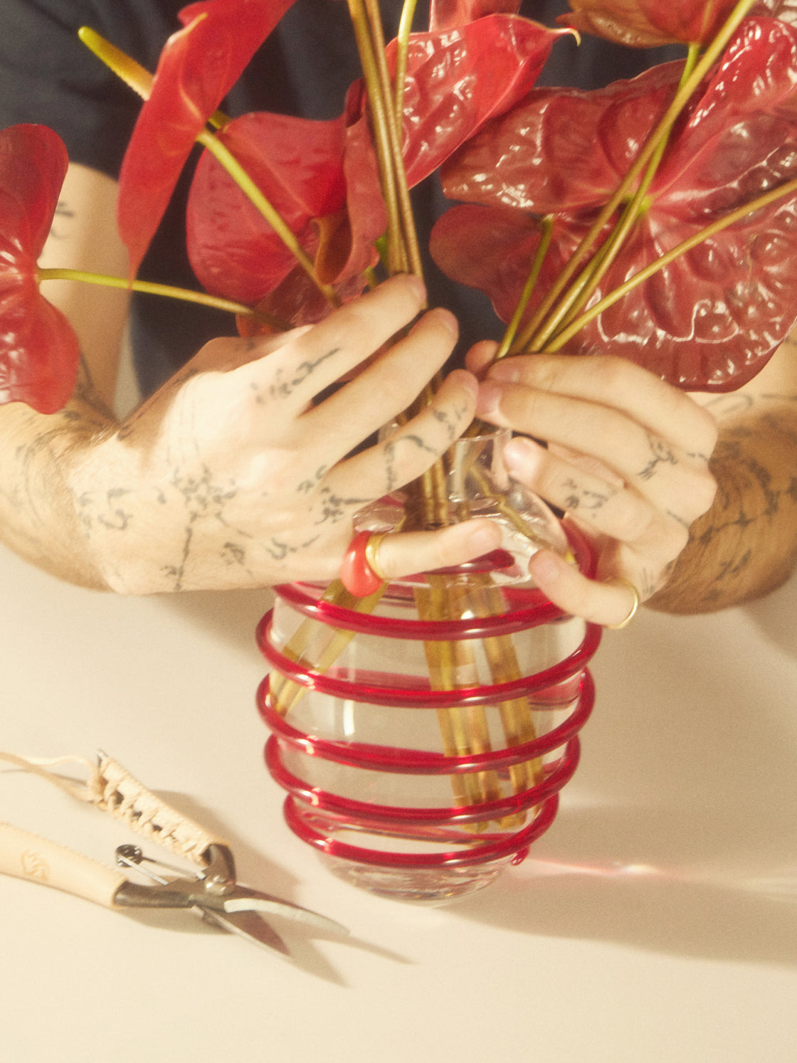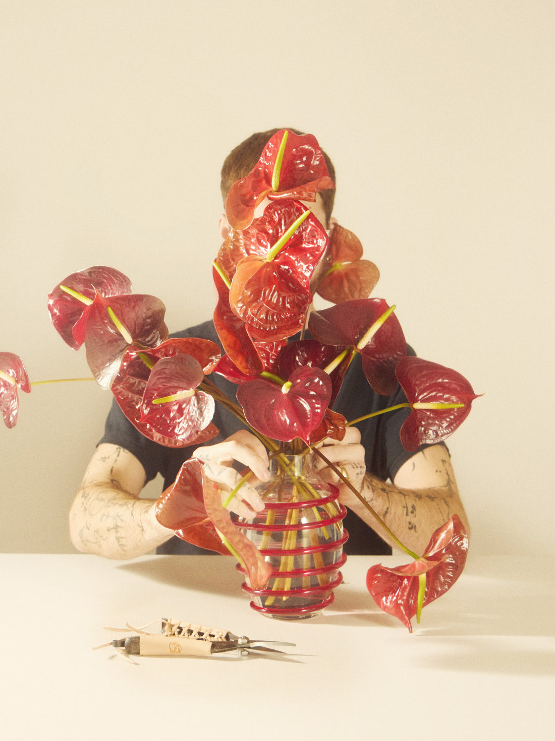 I chose these red anthuriums which are enjoying a renaissance as they’re glossy, sexy, a bit weird and long-lasting. Typically viewed as a tacky flower, they were a 1960s staple frequenting hotel lobbies. But in this new wave of floristry, a lot of designers haven’t lived through that so there’s no societal bias. And the red swirl of the Carlo Moretti vase definitely had a Sixties feel to it.