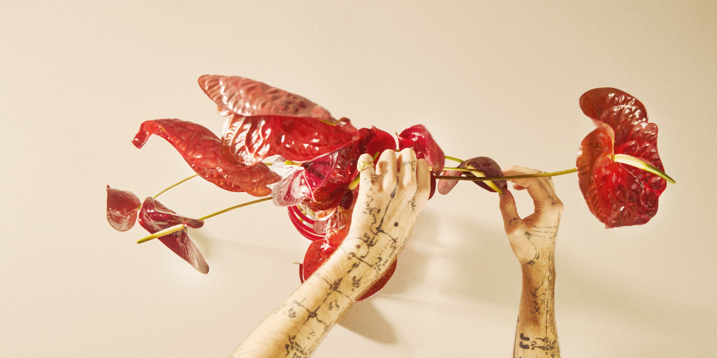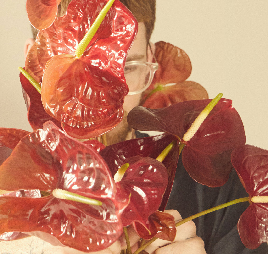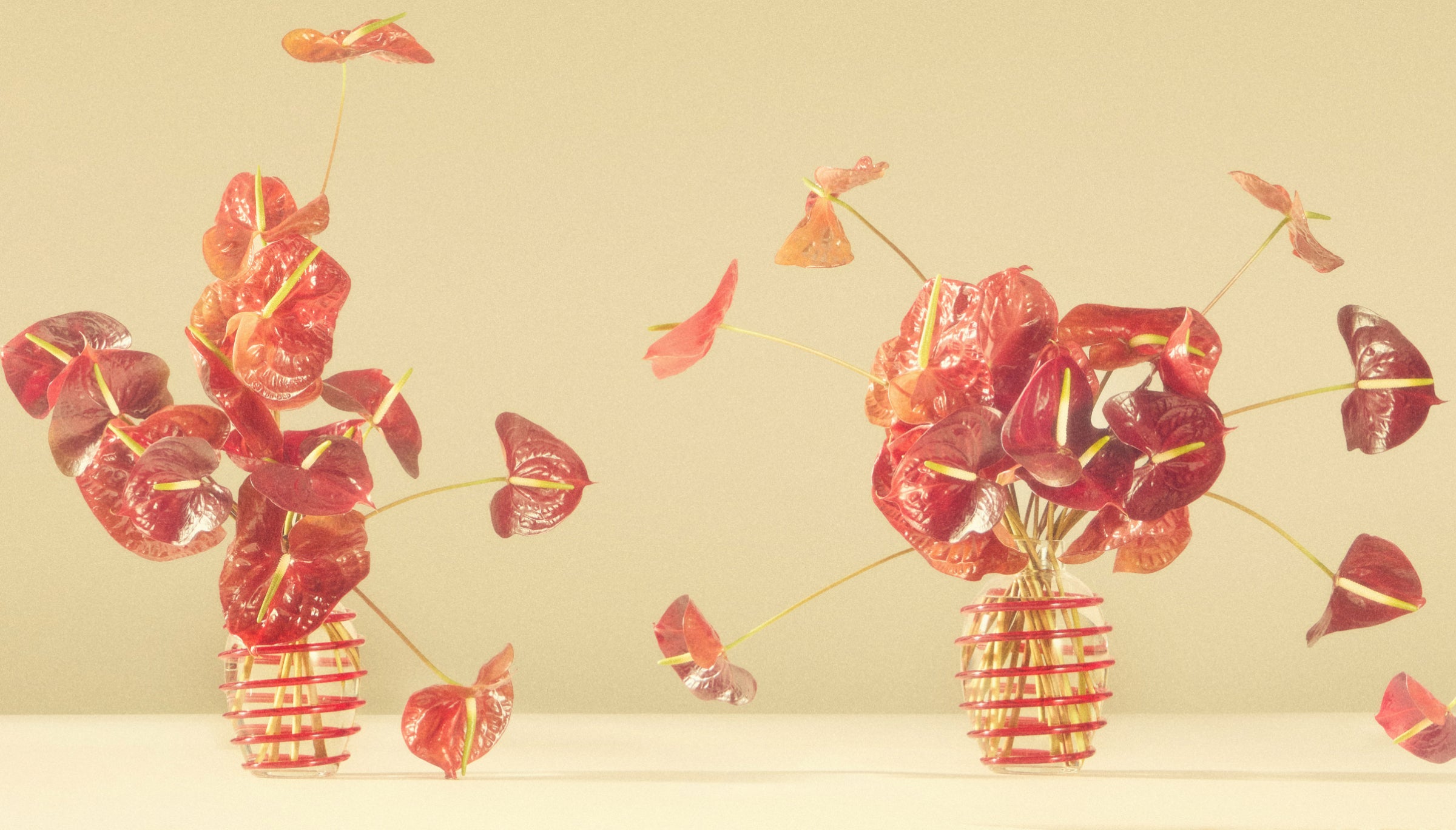 I chose these red anthuriums which are enjoying a renaissance as they’re glossy, sexy, a bit weird and long-lasting. Typically viewed as a tacky flower, they were a 1960s staple frequenting hotel lobbies. But in this new wave of floristry, a lot of designers haven’t lived through that so there’s no societal bias. And the red swirl of the Carlo Moretti vase definitely had a Sixties feel to it.