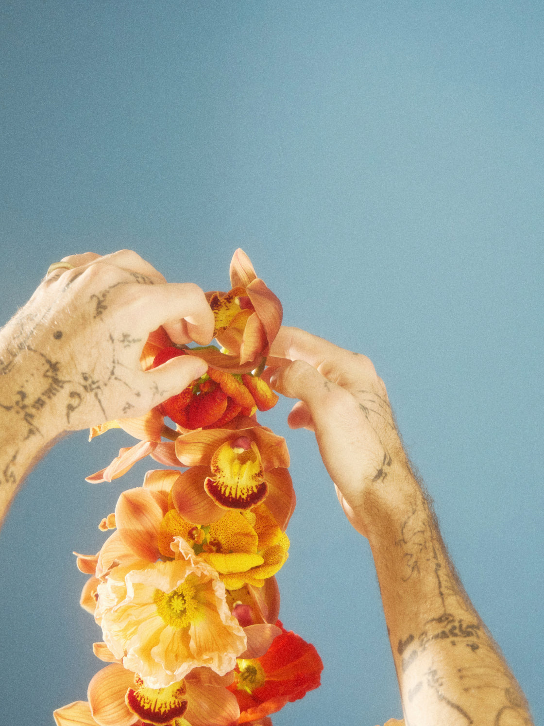 Powell is as interested in working with nature’s finest which includes fruit and vegetables—the influence perhaps of a peripatetic childhood on a farm in Tanzania, and between England and the South of France, his earliest memory is the air thick with the scent of mimosa—as he is embracing materials for their own inspiration. “I’m very intuitive in my work, I don’t often have a plan. The stem I place inspires the place of the next stem and it creates itself.” A huge inspiration is Wagner Kreusch, a former tutor and also co-founder of the London Flower School: “He’s an absolute expert in the choreography of botanicals, he knows how to make them dance. Everything he touches is perfection even if it’s a small, crumpled leaf on the pavement, he could make it sing”. Expressive, curious and with the lightest hand on the tiller, expect a voyage of discovery along with the unexpected in Powell’s creations.