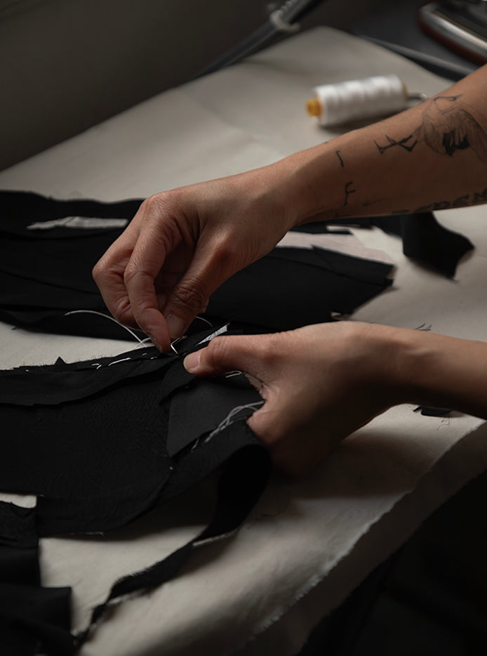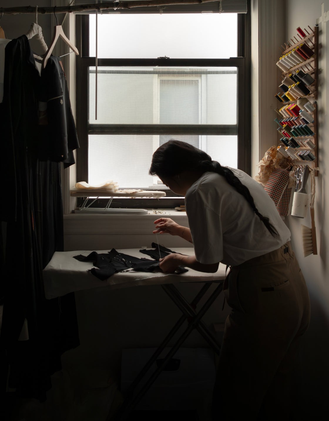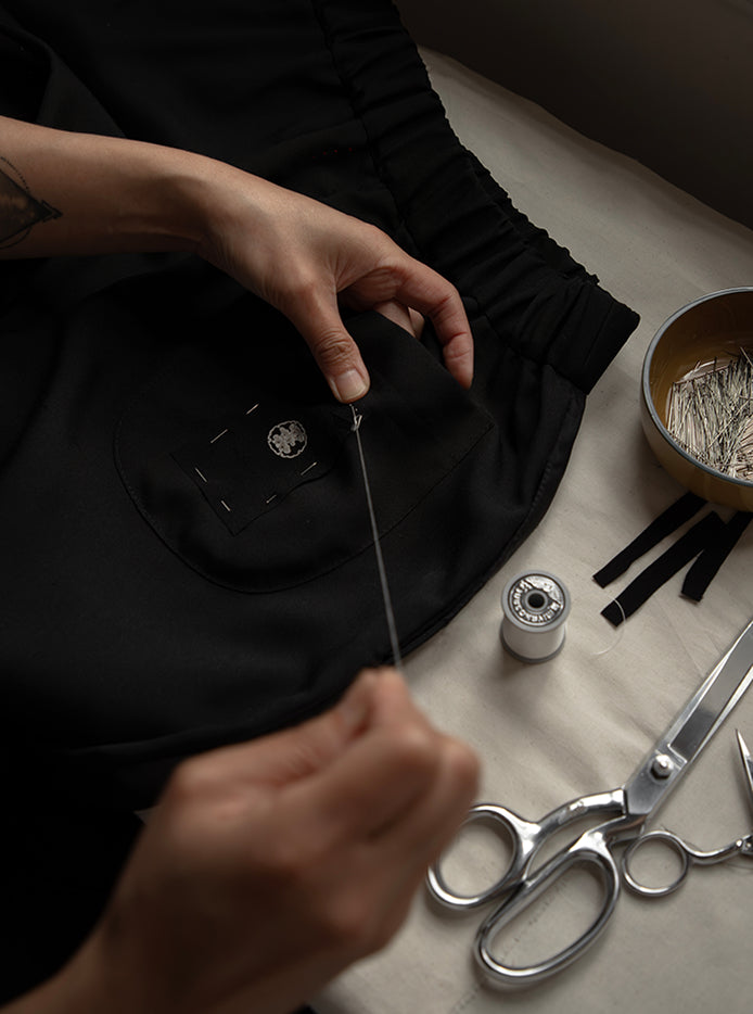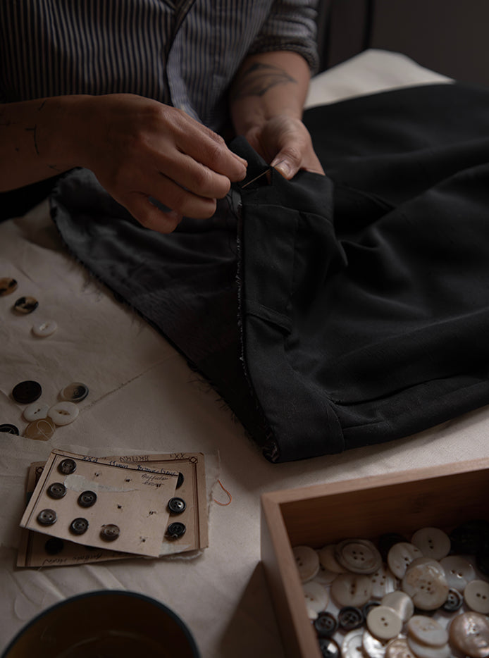 There’s also an intuitive focus on the details—the texture of the fabric, the alignment of a stitch, and the subtle meaning woven into each piece. Japanese culture values careful, hands-on craftsmanship, and as a woman, I feel naturally connected to the attention to detail, texture, and meaning in the creative process. This attention to nuance and intention allows me to create work that carries meaning and tradition forward.”