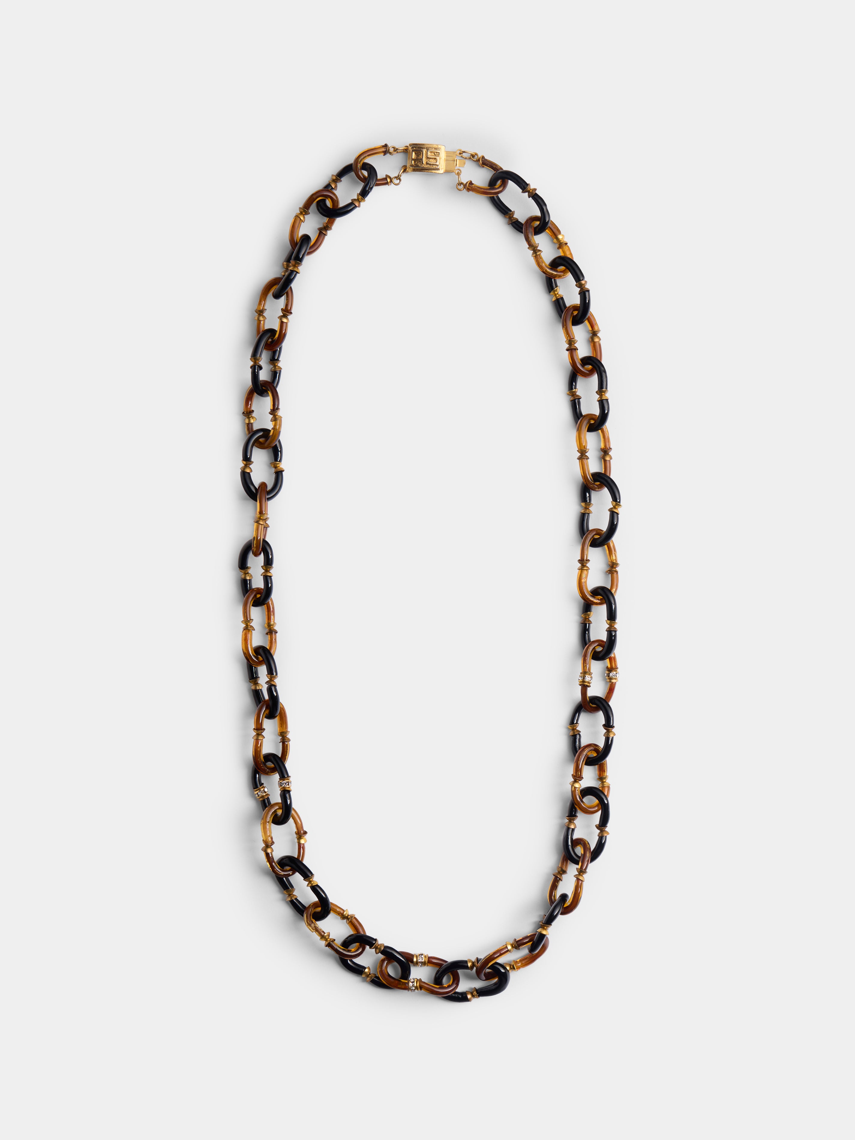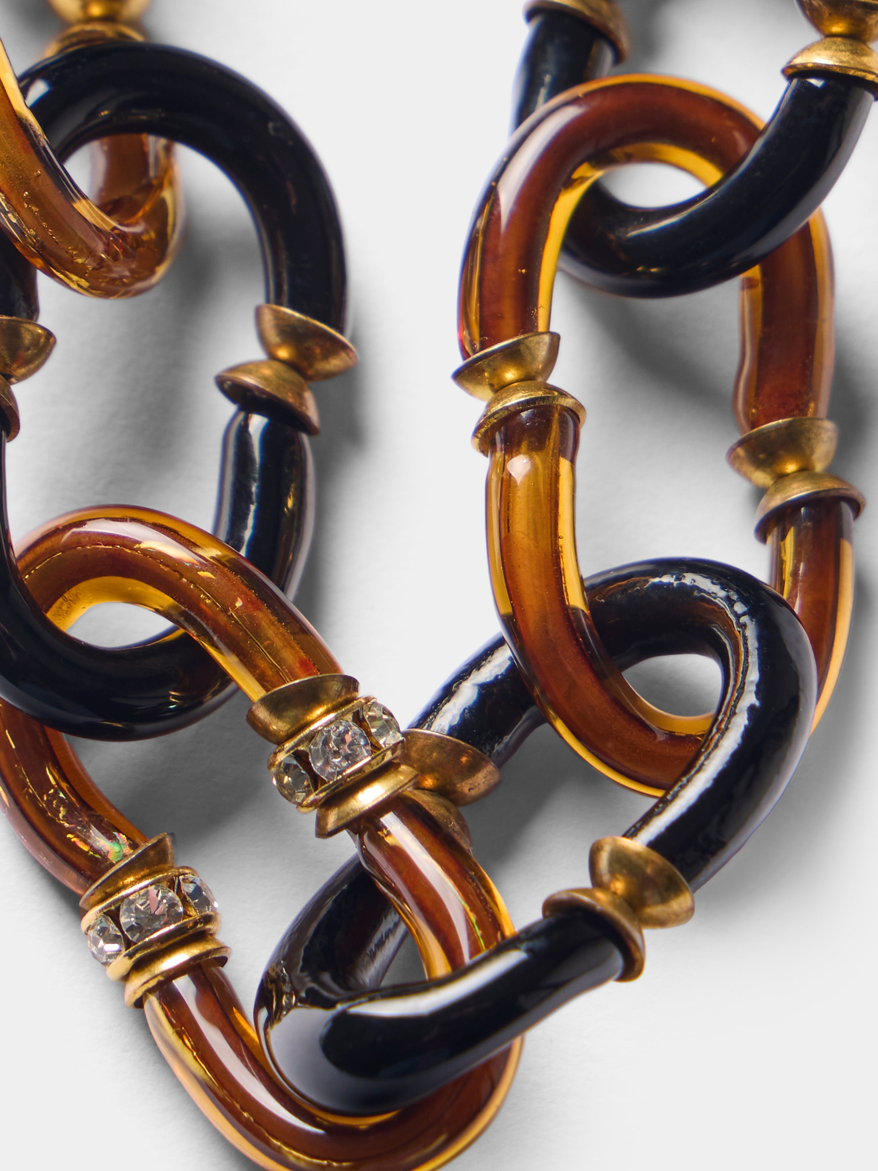 Master Venetian glassmaker Archimede Seguso was perhaps best known for his vases, sculptures and decorative objects, however his expert hand also extended to jewelry. Using lampworking and furnace techniques, he created earrings, necklaces and brooches that came to be prized by collectors everywhere—with some styles earning themselves a spot in major museum collections. This necklace from the 1960s is illustrative of his experimental eye, each Murano glass link amplified by rhinestones and gilt brass.