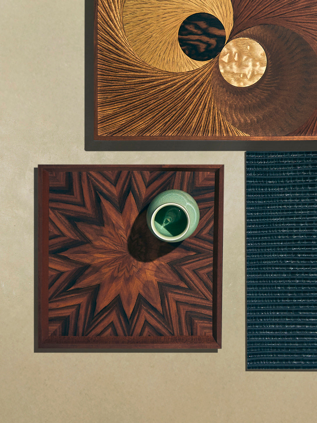 Since 1953, Tokushima-based Mori Kougei has been specialising in tsuki-ita, a highly complex technique in which paper-thin sheets of wood are sliced with sharp blades before being bonded together to form intricate surface patterns. This meticulous process has been refined and passed through the generations for more than 70 years. The result is a selection of functional trays highlighting the grain, colour and character of different wood species. Expect meticulously indigo-dyed pieces – a treasured Tokushima art – and subtle, contemporary scenes inspired by art, geometry and nature.