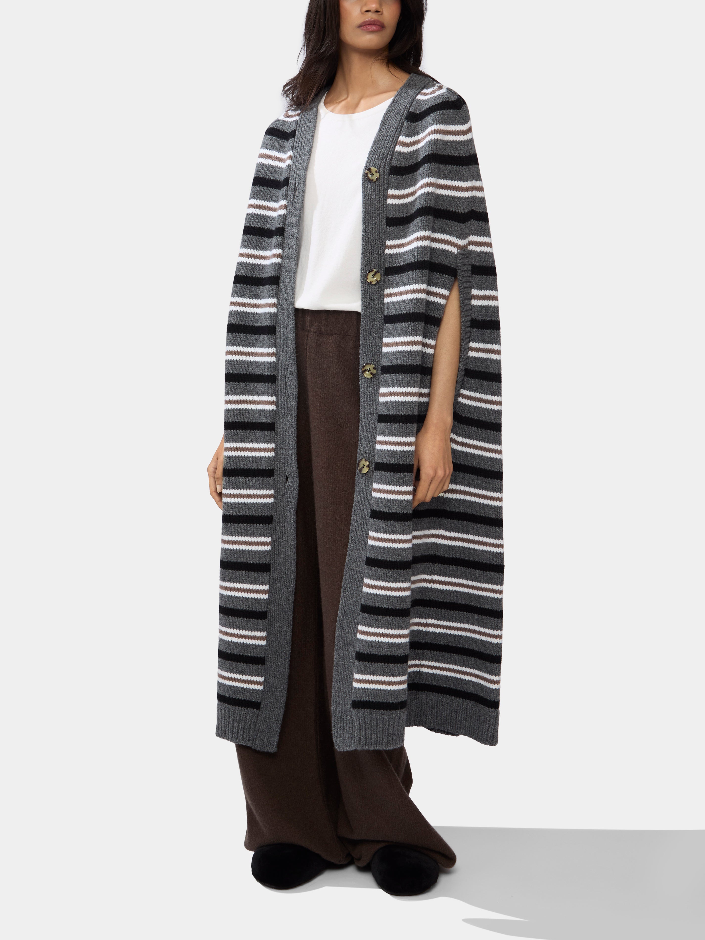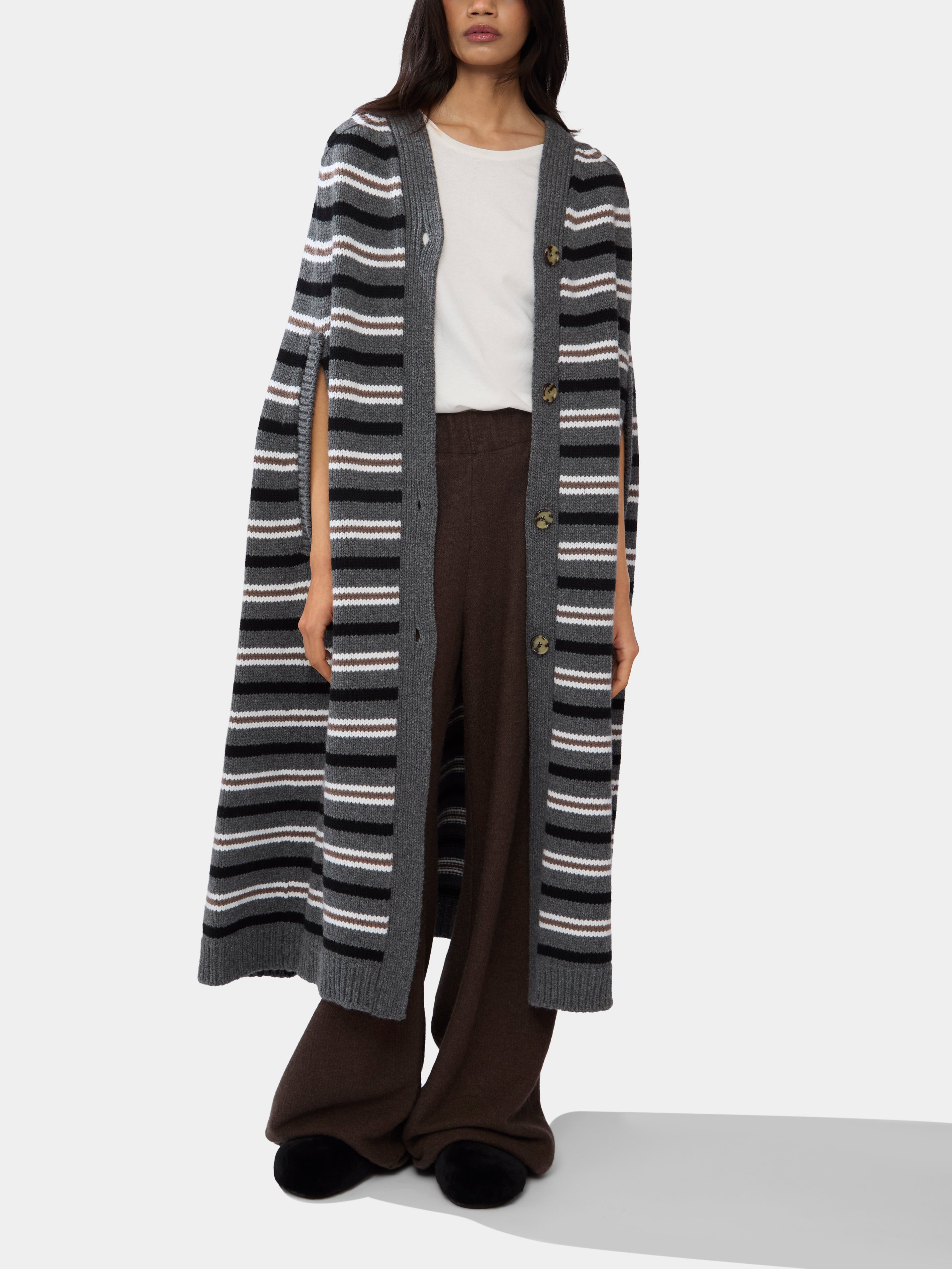 Caped silhouettes have featured in Isa Arfen’s collections long before they became the sole focus, as founder Serafina Sama has always found joy in their comfort and freedom of movement. Today, her wonderfully wearable pieces form the backbone of wardrobes everywhere. This striped cape is handcrafted in pure lambswool – it’s one you may recognize from her inaugural Edition 01.