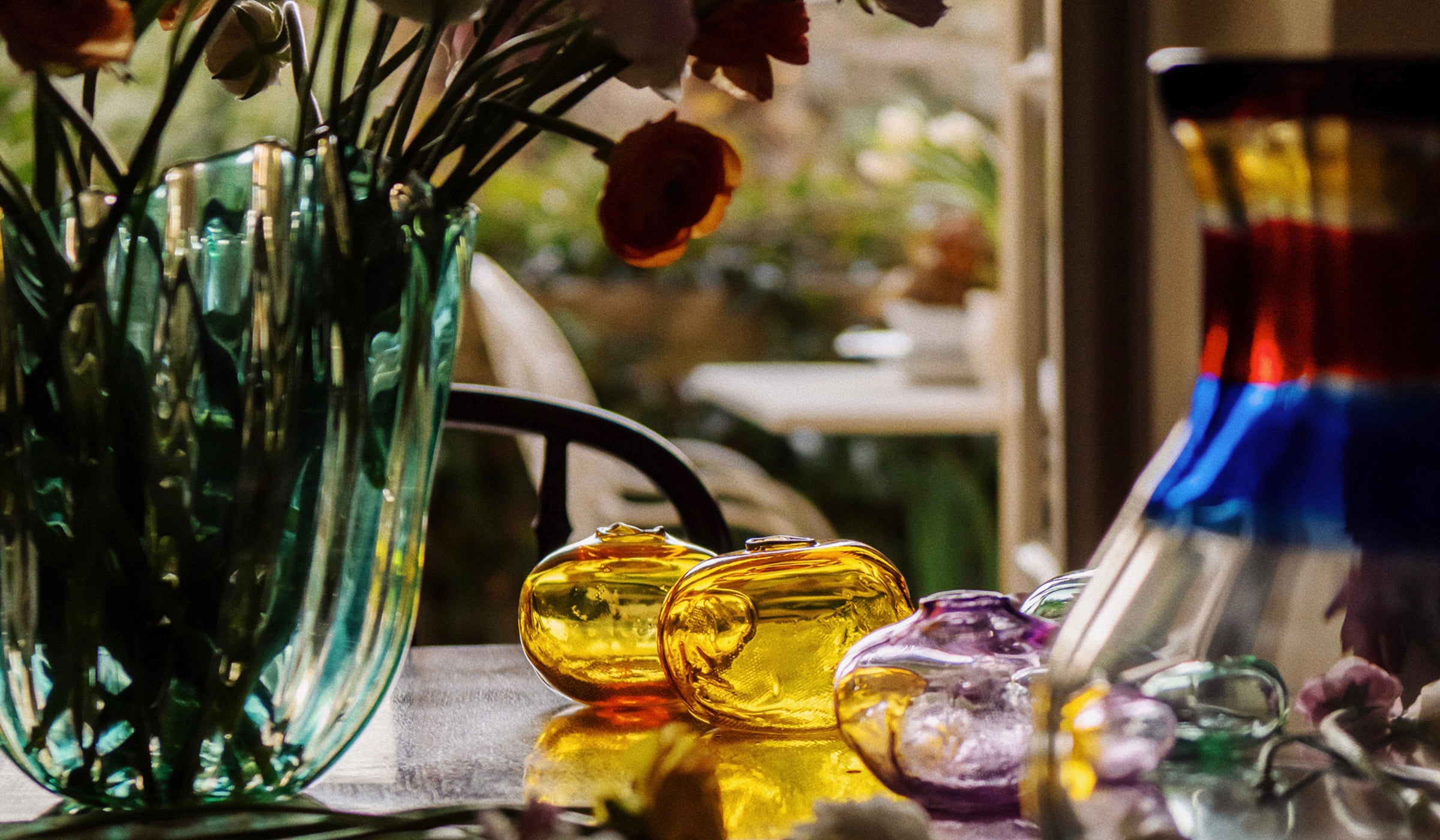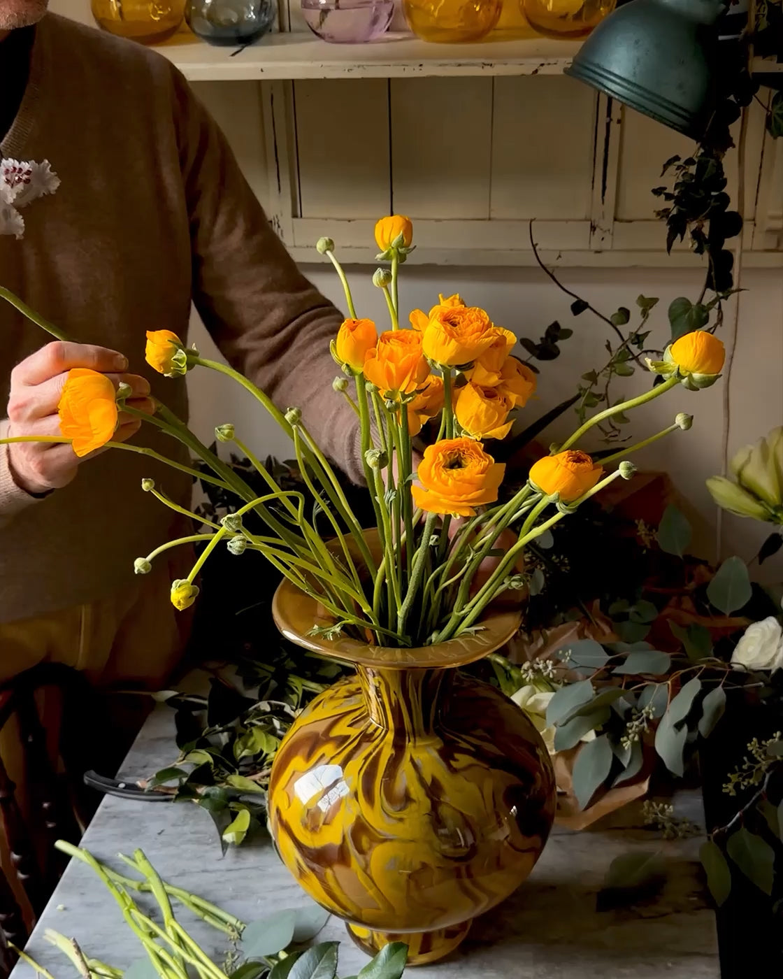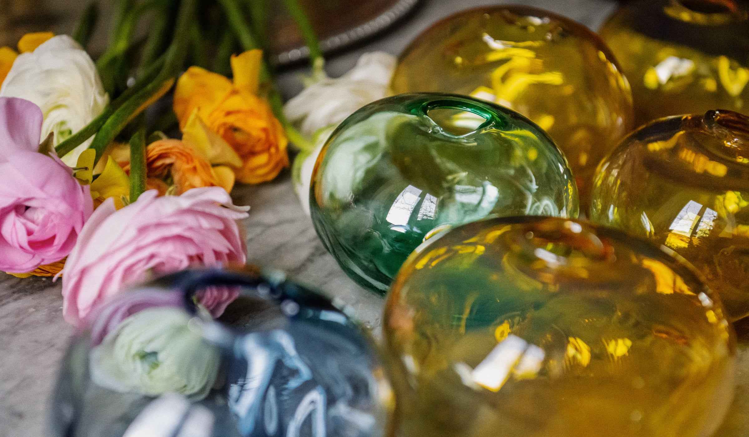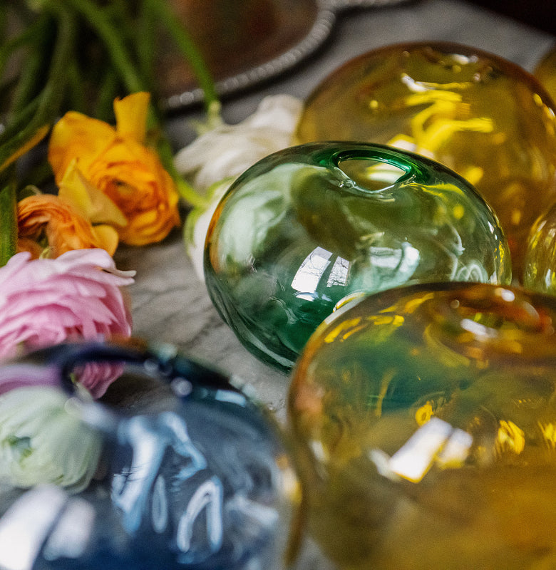 While the blooms vary to reflect the season, Abate’s vases are always handcrafted glass.