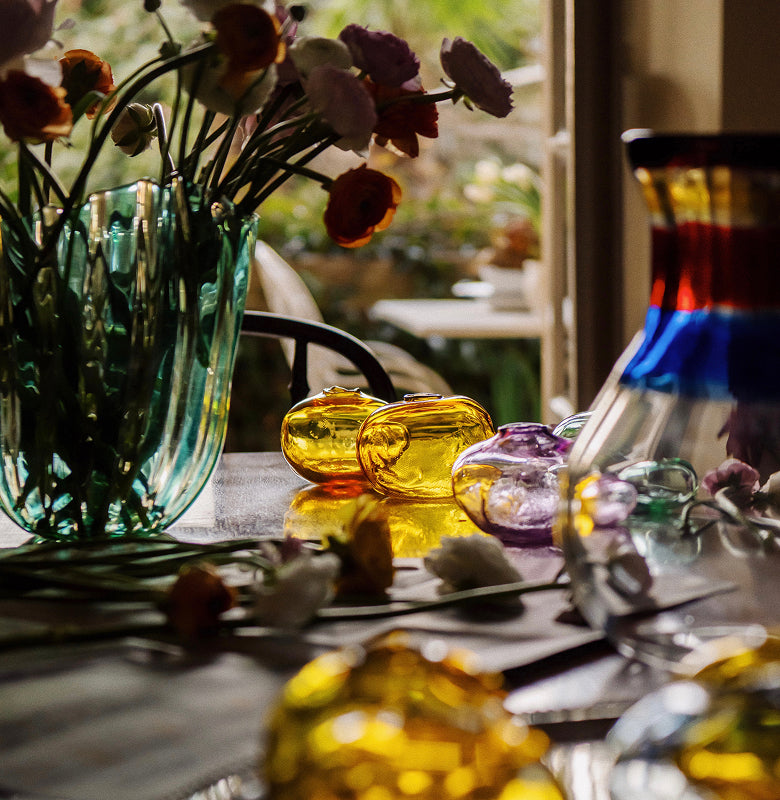 “Glass vases are beautiful because you get a different point of view and shape from every angle,” he says. “It’s a constantly changing perspective on beauty and perfection that you can see throughout. I like to always give different points of view.”