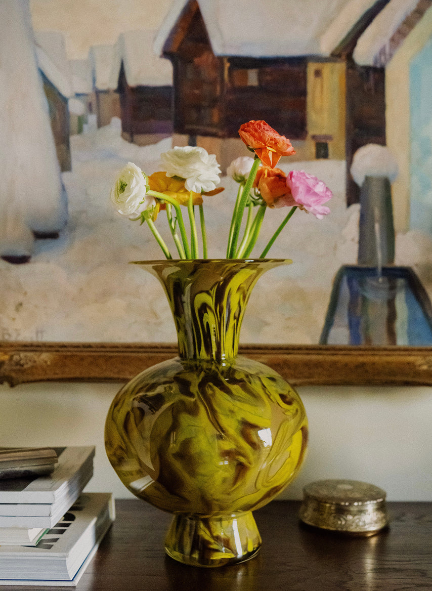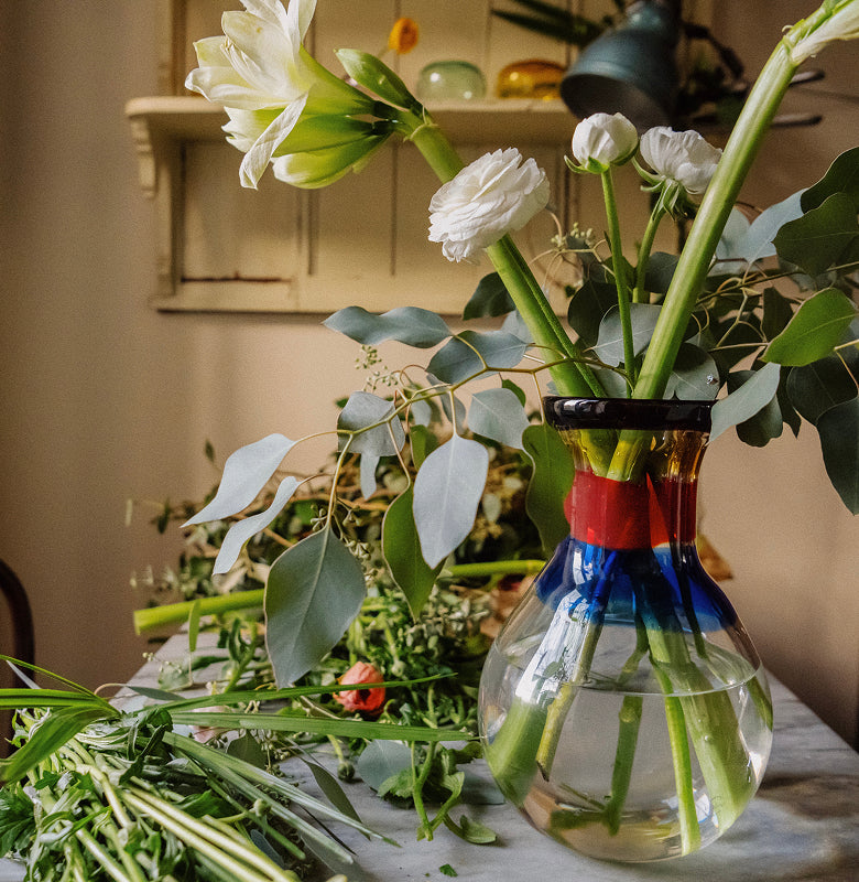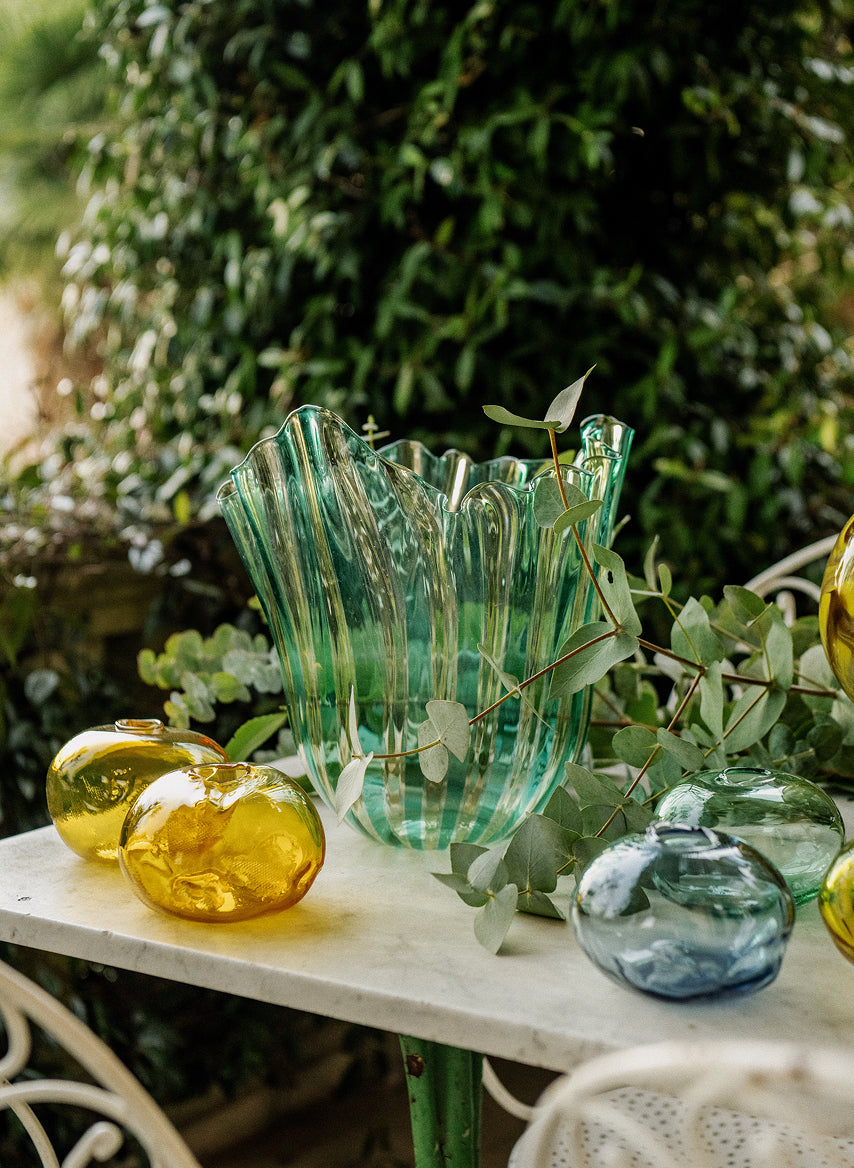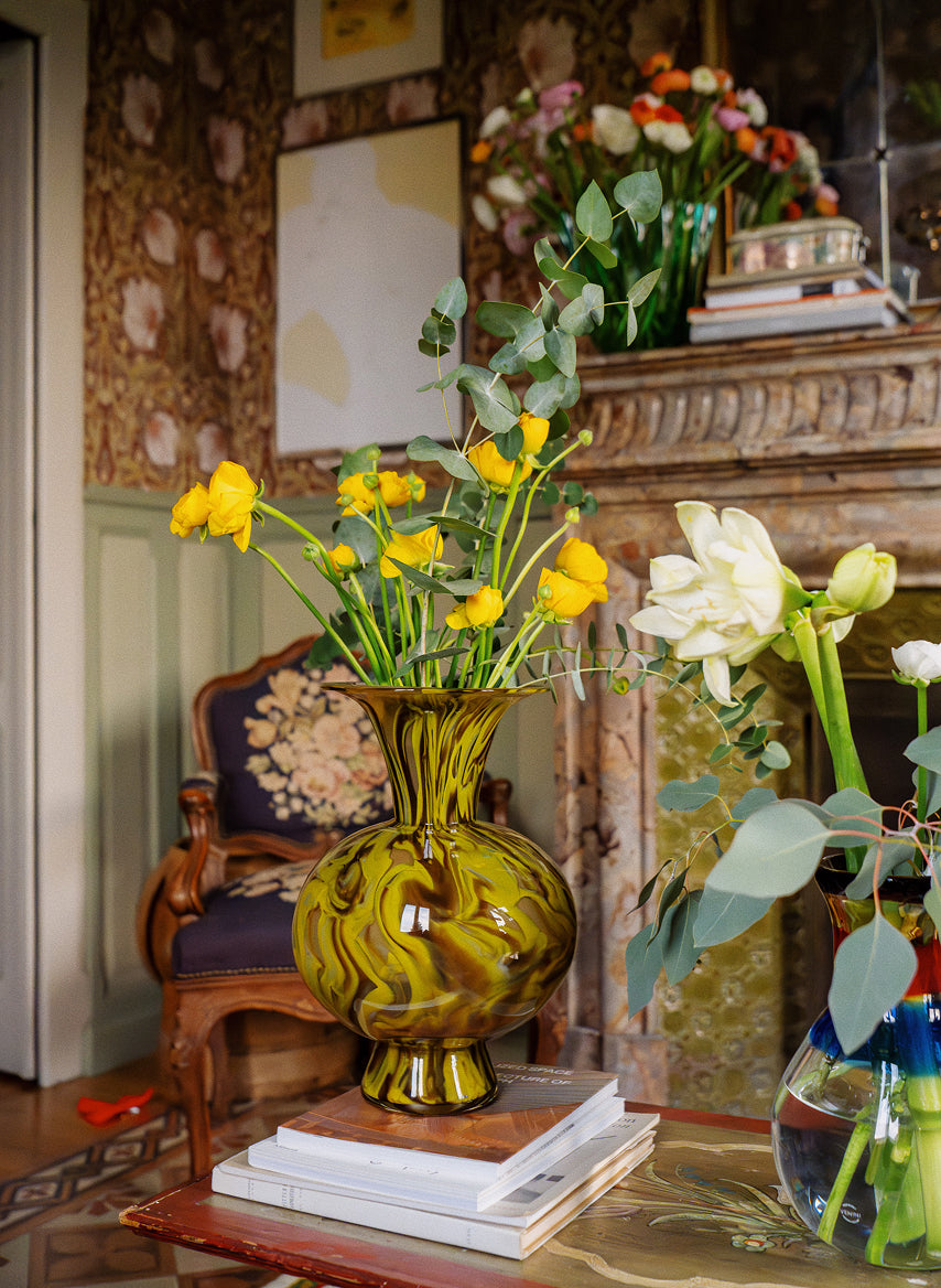 Juxtaposing the rigidity of the glass with the impulsive shapes thrown by the stems creates an intriguing meeting of time-honed craft and uncontrollable vibrancy, says Abate, who selected bud vases by Vogel Studio, Venini’s Murano glass and Fazzoletto vases, and Martyn Thompson’s high-neck design to display around his home. “I love the beautiful contrast of it all coming together.”