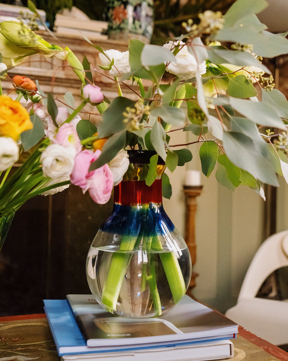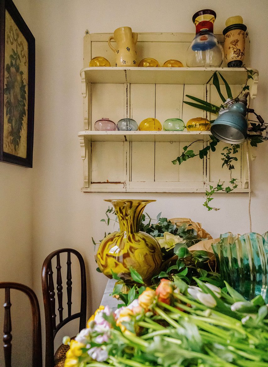 In addition to moving the vases around the house to enjoy their arrangements everywhere (from bookshelves to sideboards, to sitting atop an in-progress stack of books), the couple treats the empty vessels as ornaments on their own.