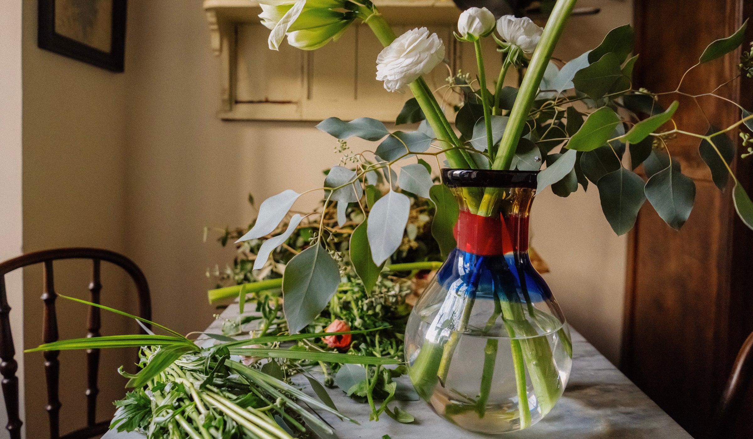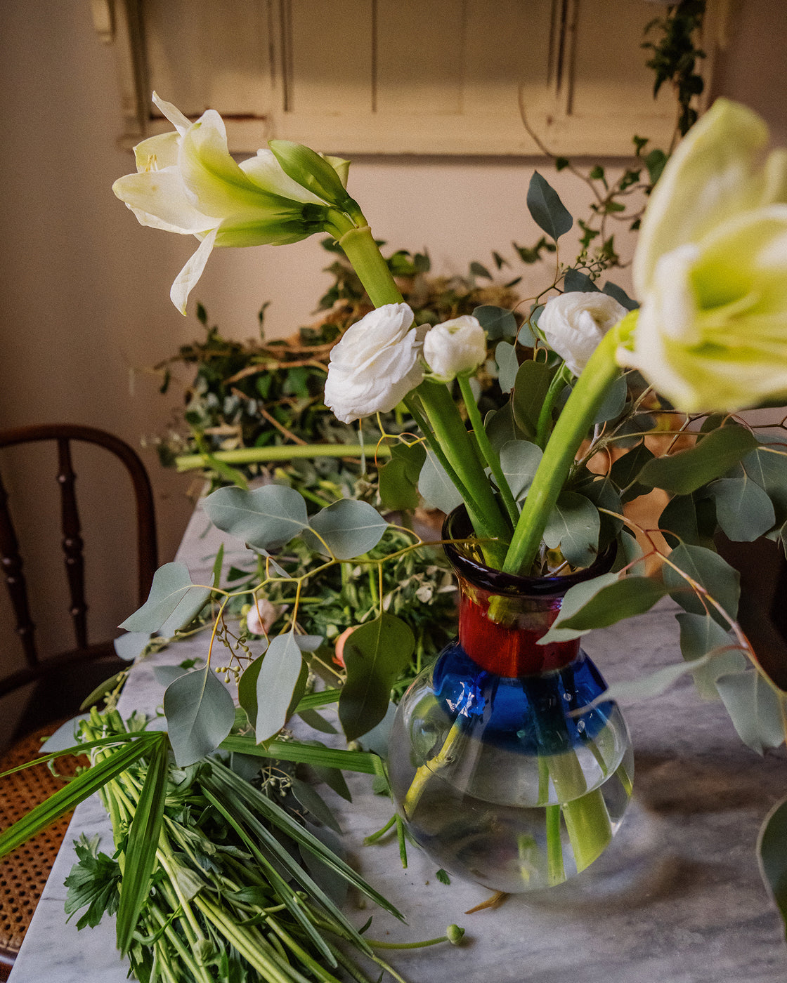 “I like to choose strong colors for flowers as everything in my home is very light, so it creates another layer of contrast, but I don’t think too much about combining colors. I like the idea of pulling colors I like together, and because I like them, they will start working together at some point,” he says, adding that it helps not to overthink it. “By the time the composition is finished, the arrangement has its own personality.”