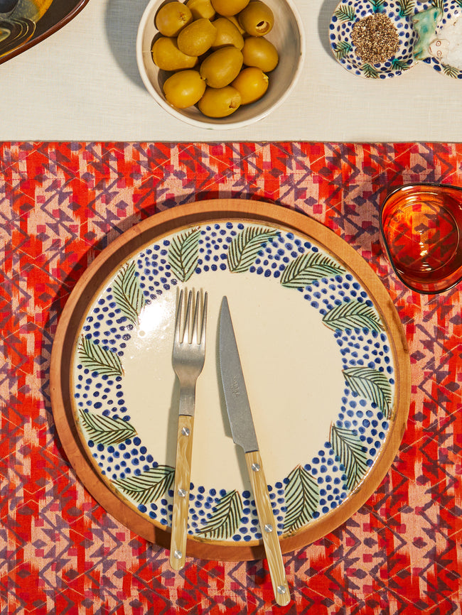 Goya Gallagher founded Anūt Cairo to emphasize the cultural heritage of Egypt, which is why every table treat—from ceramics to linen to glassware—is crafted by the hands of specialized artisans across the country. Not only does Anūt champion the maker behind each piece, but it also fosters entrepreneurship through dedicated initiatives, such as a training center, embroidery school, and artist residency scheme, all of which are intended to create sustainable paths and economic independence for underprivileged communities. Designs are testament to the art of creative collaboration and original craftsmanship, detailed with whimsical scenes inspired by Egyptian landscapes.