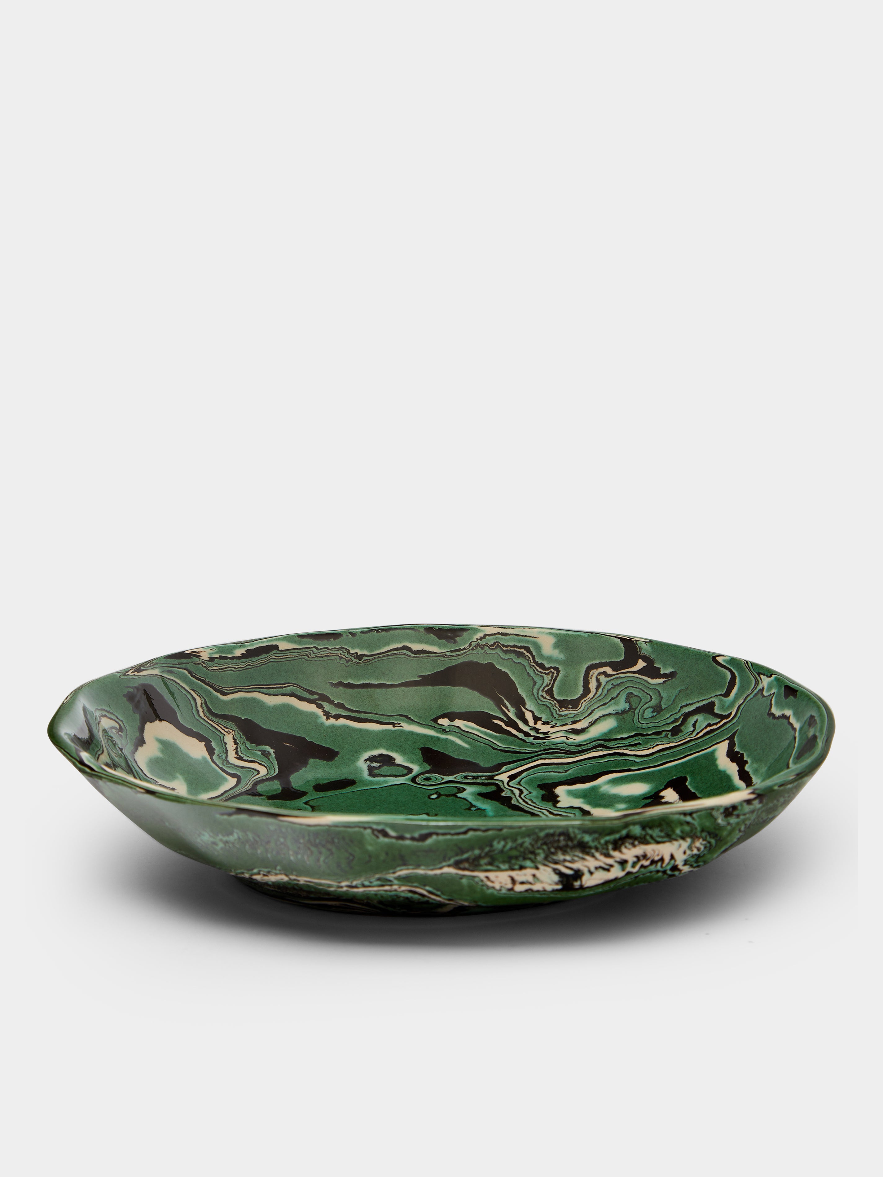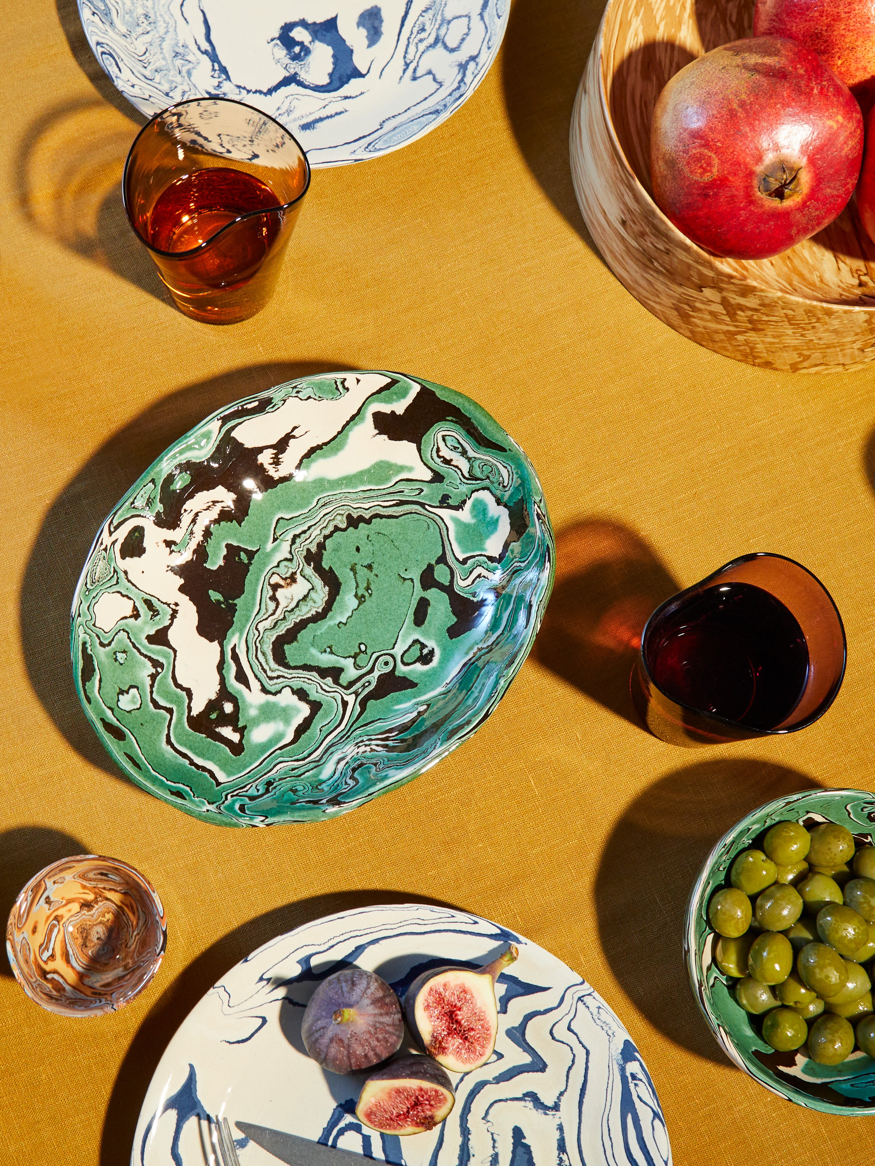 Paris-based Atelier Saint-André Perrin – made up of mother-and-daughter duo Sylvie and Elise – handcrafts signature marbled ceramics by utilising a technique Sylvie developed called stamping. The intricate process sees them swirl together various coloured oxide clays, rhythmically hand-knead the mixture, and then roll it out to reveal the unique pattern. Then, the clay is stamped and shaped into a pre-made plaster cast for it to harden, before being scraped, sanded, fired, enamelled and fired for a second time. No more than 16 pieces are created each day, making each one a loved, laboured-over product of this maker’s vision. Look out for captivating colour palettes with unique quirks that’ll elevate your table settings.