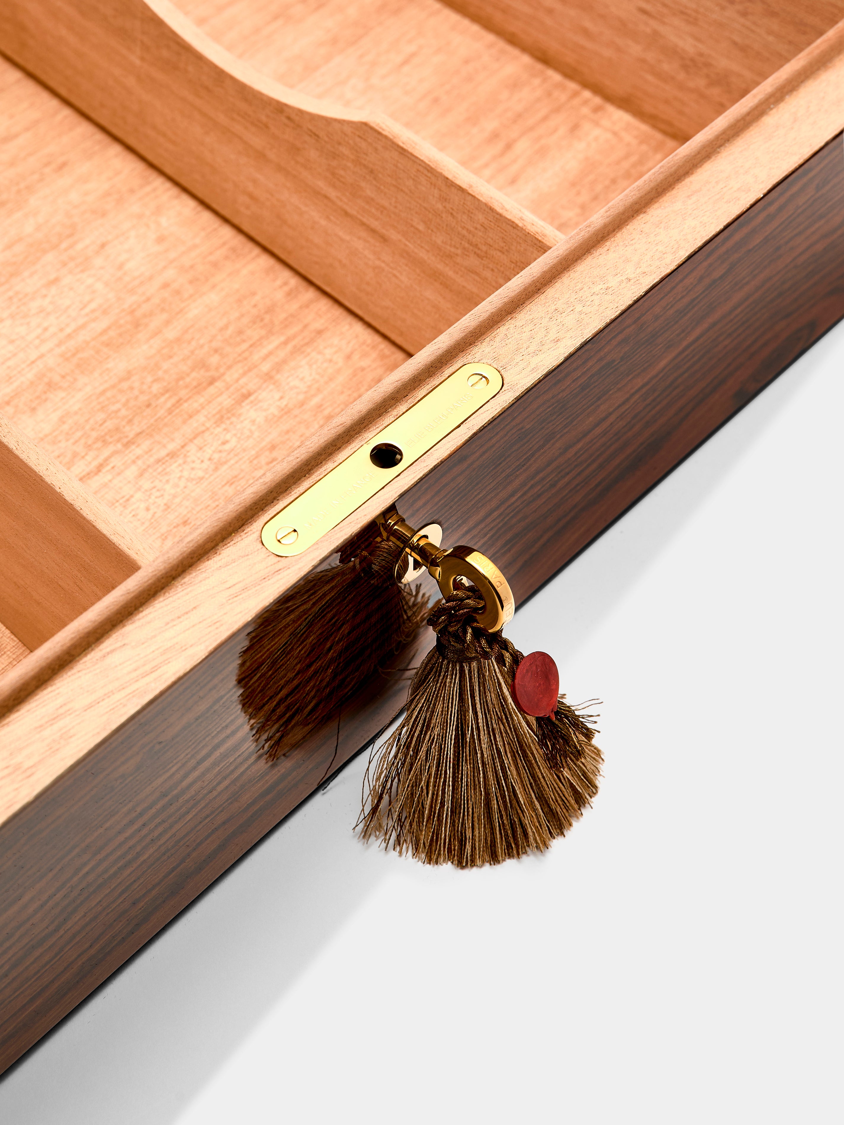 Elie Bleu is a household name for its humidors, but they aren’t the only field of expertise for this maker. No matter what its boxes are guarding – from jewellery and watches to poker and pens – they’re always handmade to exacting standards, taking four to six months to come to fruition. Every story starts with a mass cut of timber that’s sourced from across the globe, before expert craftspeople have their way with it in the workshop just outside of Paris; perhaps they’re lacquering it by hand, or maybe they’re piecing it together via Boulle marquetry. Whatever they’re rustling up, rest assured that the final result will be a product of expert savoir-faire, as has been the case since its founding in 1976.
