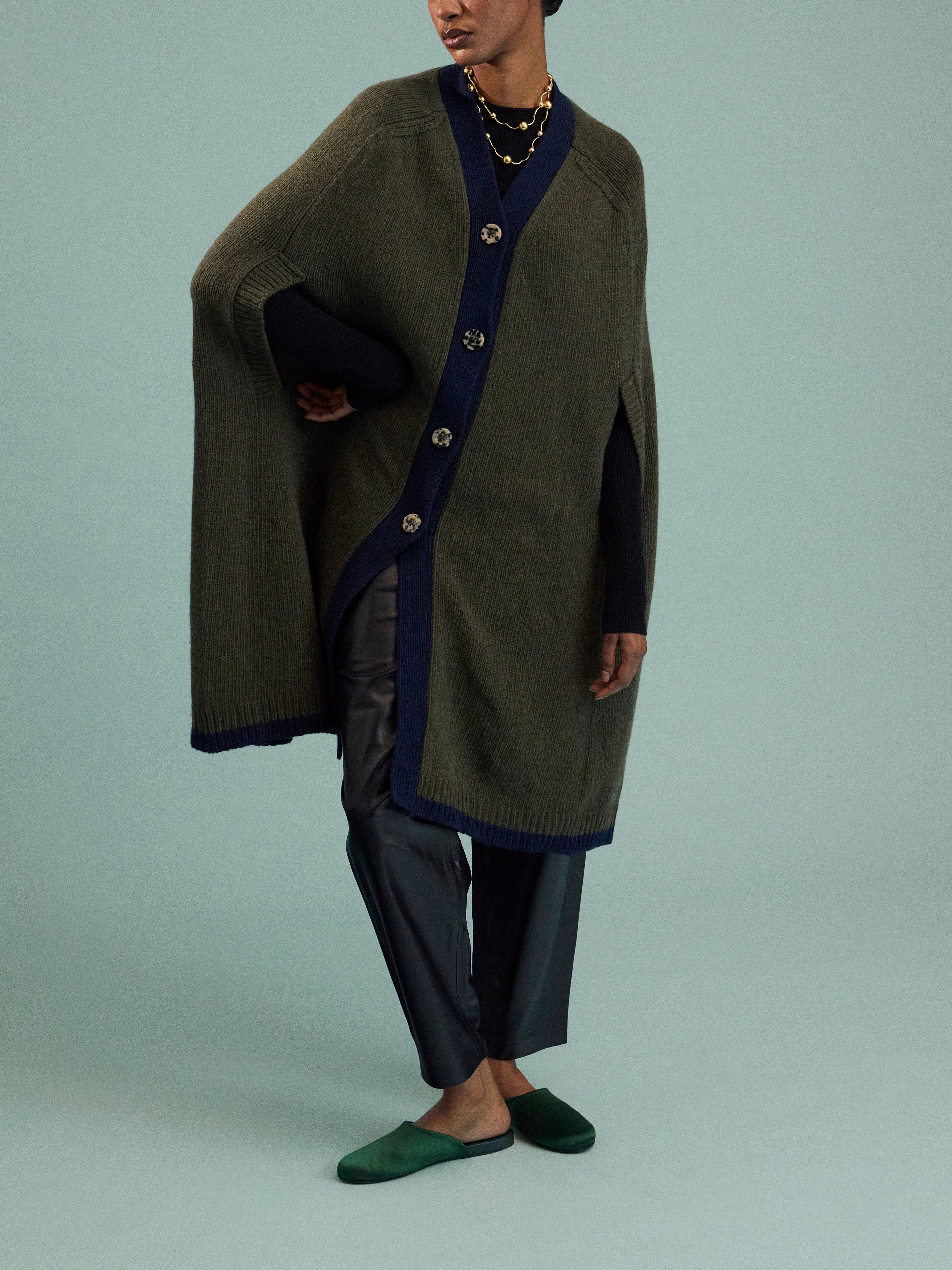 Caped silhouettes have featured in Isa Arfen’s collections long before they became the sole focus, as founder Serafina Sama has always found joy in their comfort and freedom of movement. Today, her wonderfully wearable pieces form the backbone of wardrobes everywhere. In her London-based workshop, this color-block cape is handcrafted in a carefully considered mix of Scottish lambswool and cashmere, a fabric blend and colorway made for – and available only at – ABASK.