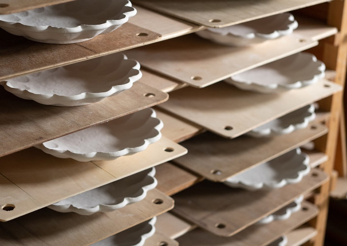 Kaneko Kohyo’s story spans a century (and counting), beginning with its first firings at a mountaintop kiln in Toki, Japan. Three decades ago, the workshop expanded into tableware, developing a recognizable signature: charming scalloped edges and a rustic, natural palette of off-white, black and blue. From sake cups to dinner plates, every piece is shaped by hand for an organic warmth and quiet individuality—qualities no machine can truly replicate.