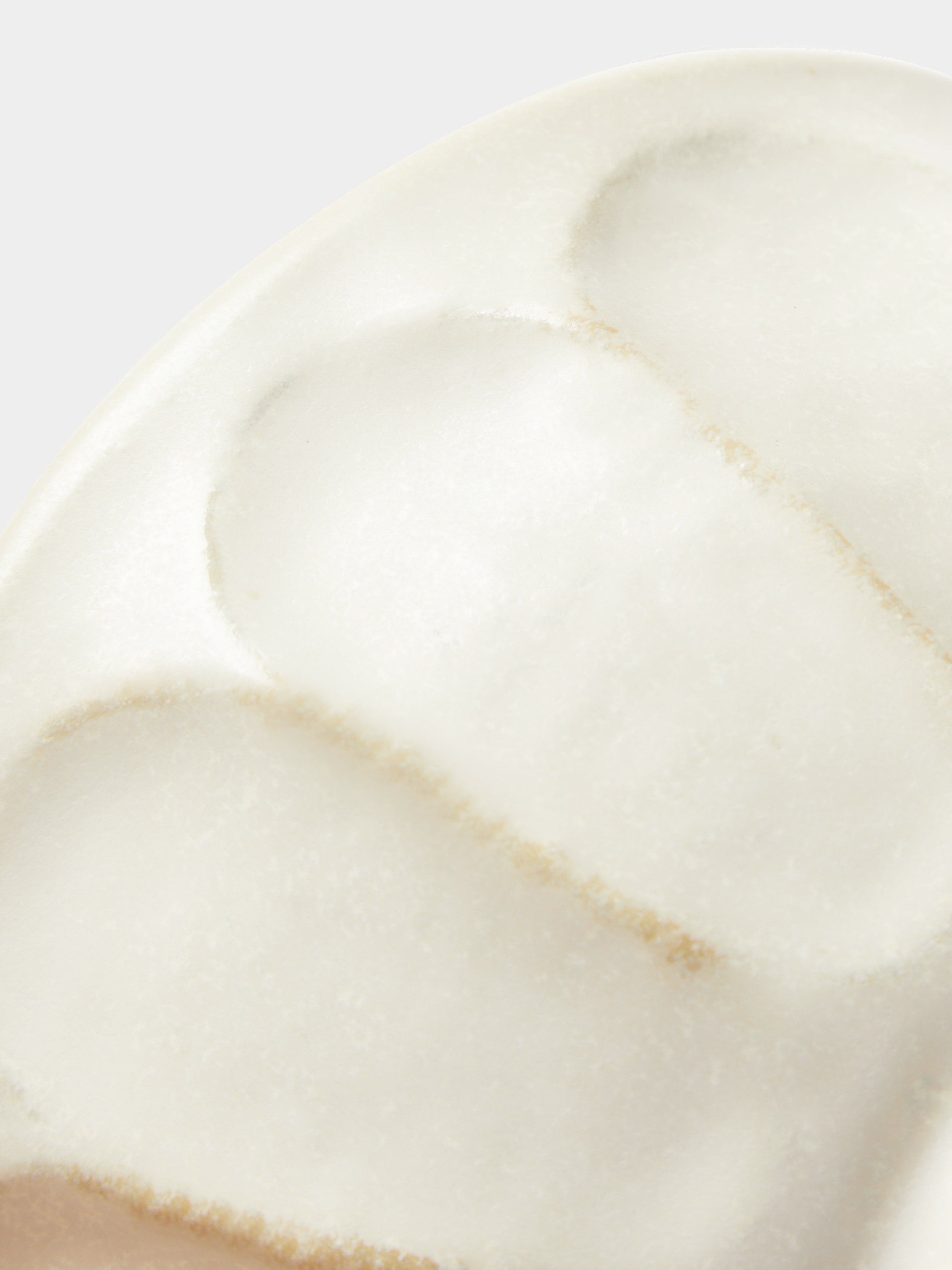 Kaneko Kohyo’s story spans a century (and counting), beginning with its first firings at a mountaintop kiln in Toki, Japan. Three decades ago, the workshop expanded into tableware, developing a recognizable signature: charming scalloped edges and a rustic, natural palette of off-white, black and blue. From sake cups to dinner plates, every piece is shaped by hand for an organic warmth and quiet individuality—qualities no machine can truly replicate.