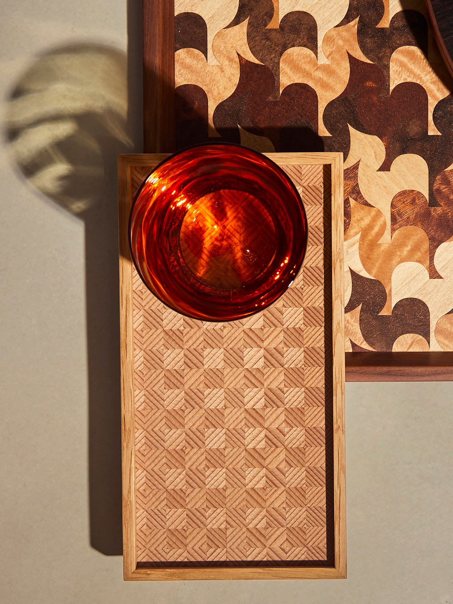 Since 1953, Tokushima-based Mori Kougei has been specialising in tsuki-ita, a highly complex technique in which paper-thin sheets of wood are sliced with sharp blades before being bonded together to form intricate surface patterns. This meticulous process has been refined and passed through the generations for more than 70 years. The result is a selection of functional trays highlighting the grain, colour and character of different wood species. Expect meticulously indigo-dyed pieces – a treasured Tokushima art – and subtle, contemporary scenes inspired by art, geometry and nature.