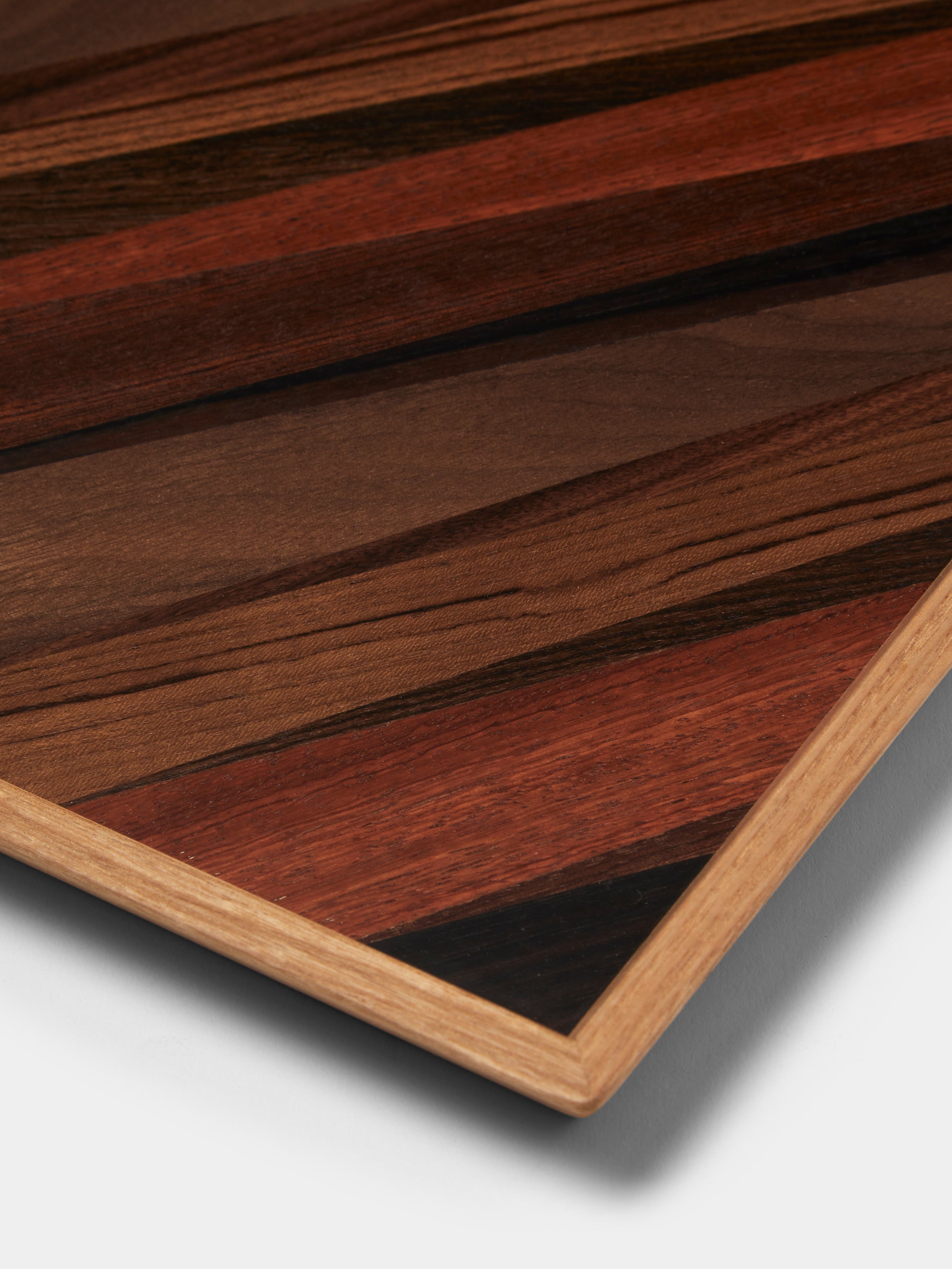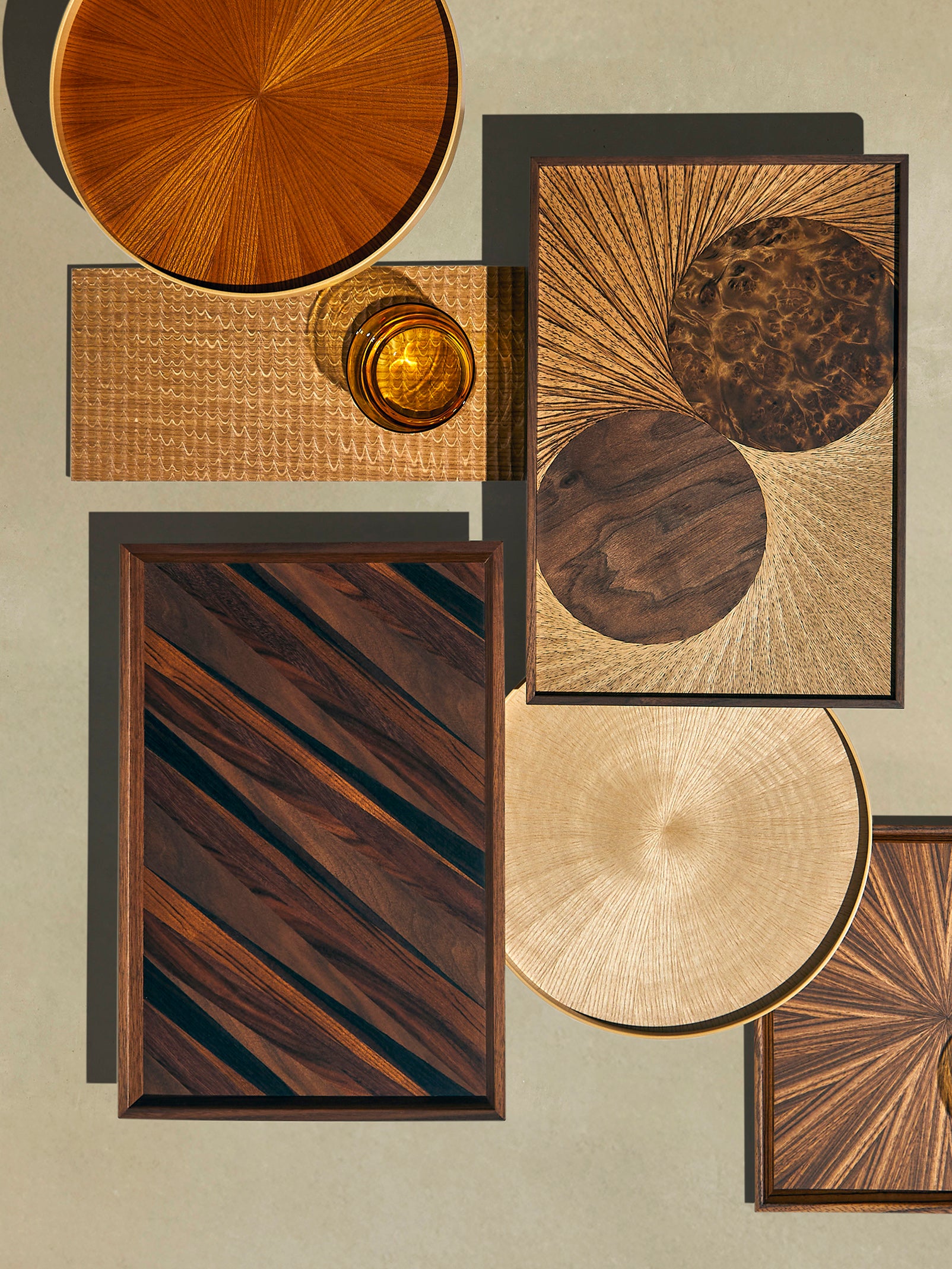 Since 1953, Tokushima-based Mori Kougei has been specialising in tsuki-ita, a highly complex technique in which paper-thin sheets of wood are sliced with sharp blades before being bonded together to form intricate surface patterns. This meticulous process has been refined and passed through the generations for more than 70 years. The result is a selection of functional trays highlighting the grain, colour and character of different wood species. Expect meticulously indigo-dyed pieces – a treasured Tokushima art – and subtle, contemporary scenes inspired by art, geometry and nature.