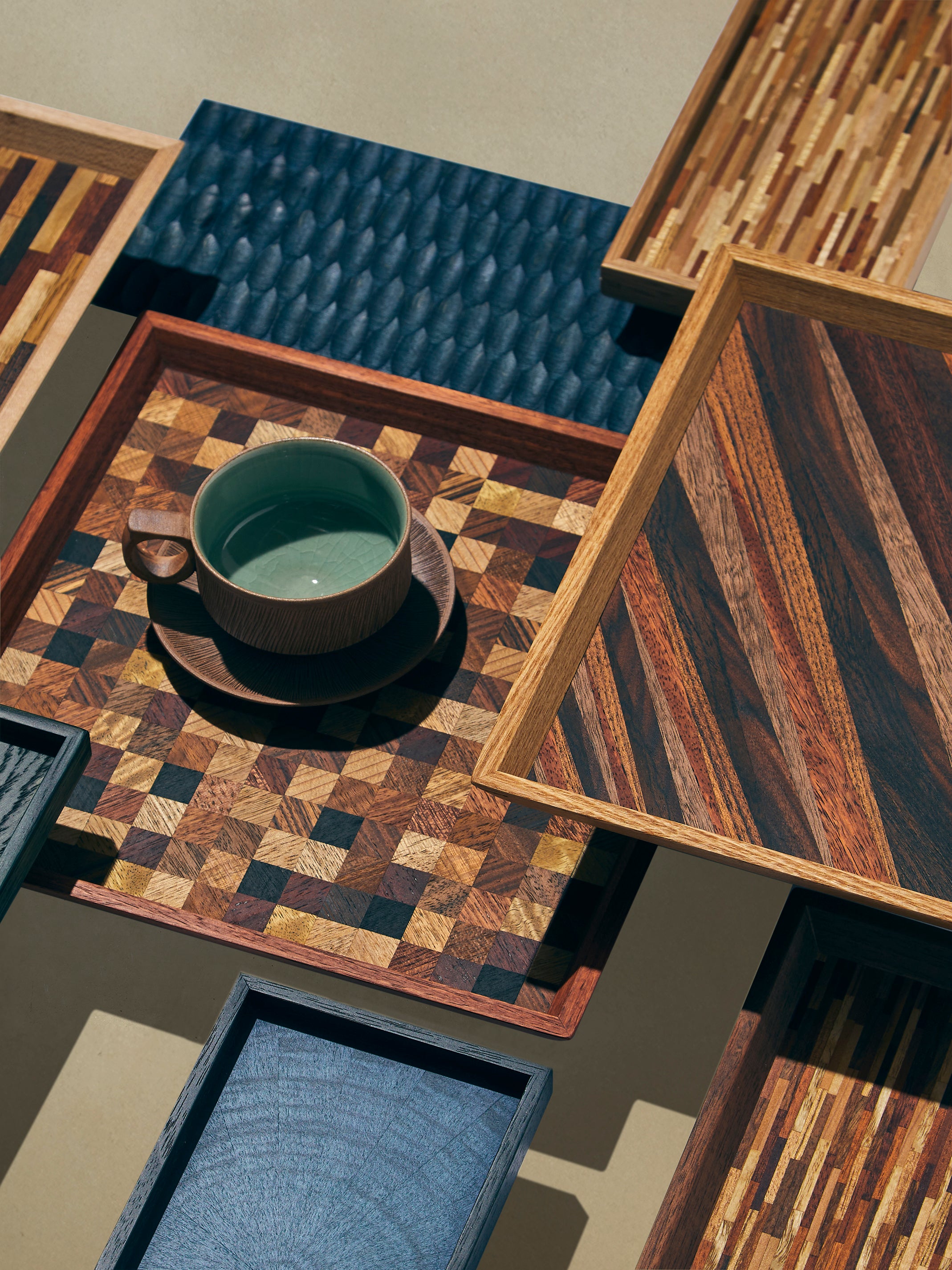 Since 1953, Tokushima-based Mori Kougei has been specialising in tsuki-ita, a highly complex technique in which paper-thin sheets of wood are sliced with sharp blades before being bonded together to form intricate surface patterns. This meticulous process has been refined and passed through the generations for more than 70 years. The result is a selection of functional trays highlighting the grain, colour and character of different wood species. Expect meticulously indigo-dyed pieces – a treasured Tokushima art – and subtle, contemporary scenes inspired by art, geometry and nature.