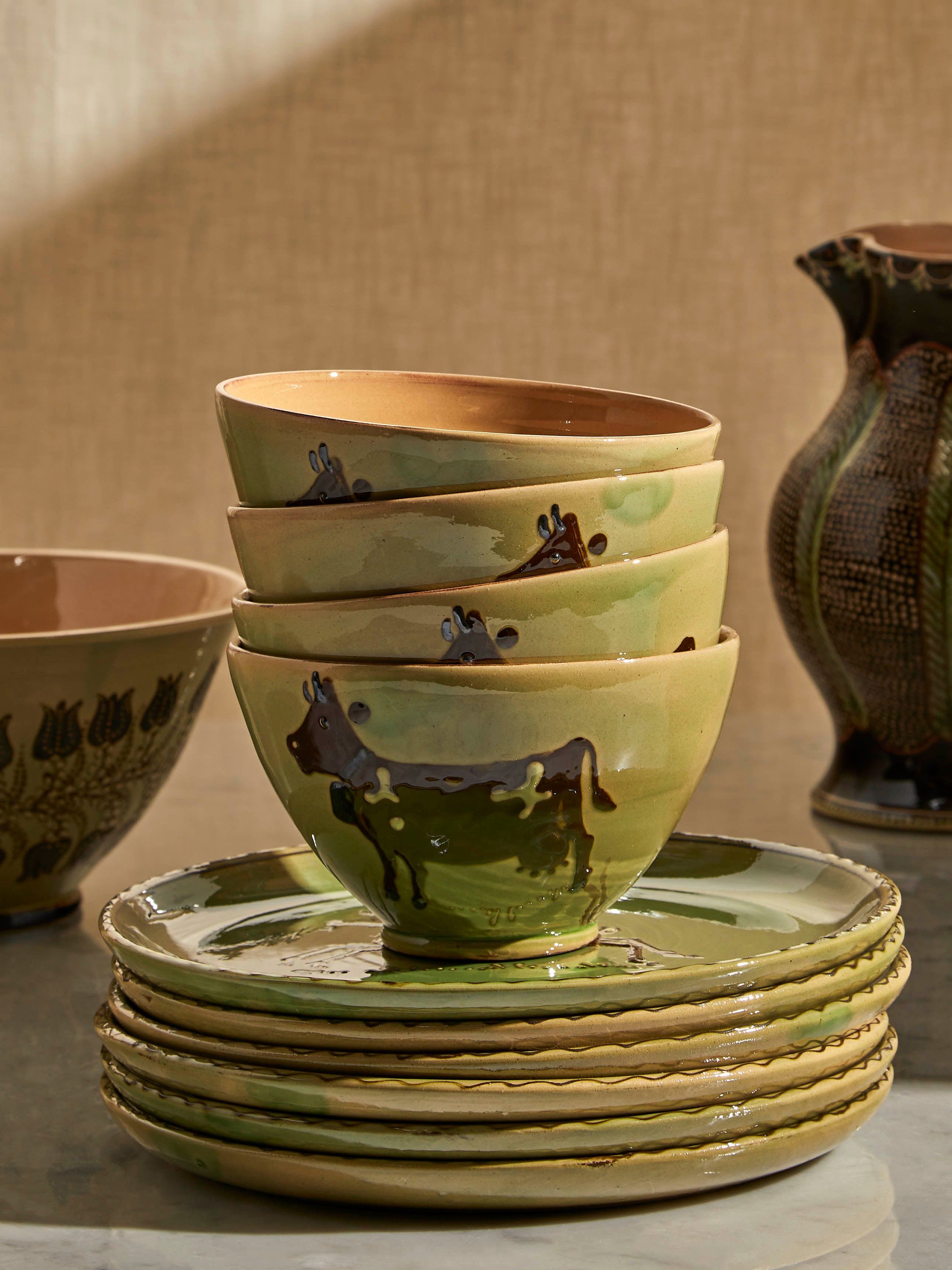 Jean-Christophe Hermann grew up near Lake Annecy in France, and recalls visiting an old pottery at just five years old that inspired him to pursue ceramics – a moment that led to the opening of Poterie d’Évires in 1971. Influenced by the landscape of their Haute-Savoie home, the Hermann family – Jean-Christophe and David, the father and son duo – hand-paint local delights onto their light, earthy and decorative clay; alpine flowers like tiny crocuses and soldanellas often feature, as well as native creatures such as Chamois and Ibex. ABASK made a special road-trip to the French Alps to hand-pick a curation from their exquisite collection. In 1981, after exploring his region’s brocante for many years, Jean-Christophe opened a museum dedicated to the pottery and folk art of Savoie. It’s the largest and most comprehensive collection in the world and displays pieces that date as far back as the 12th century.